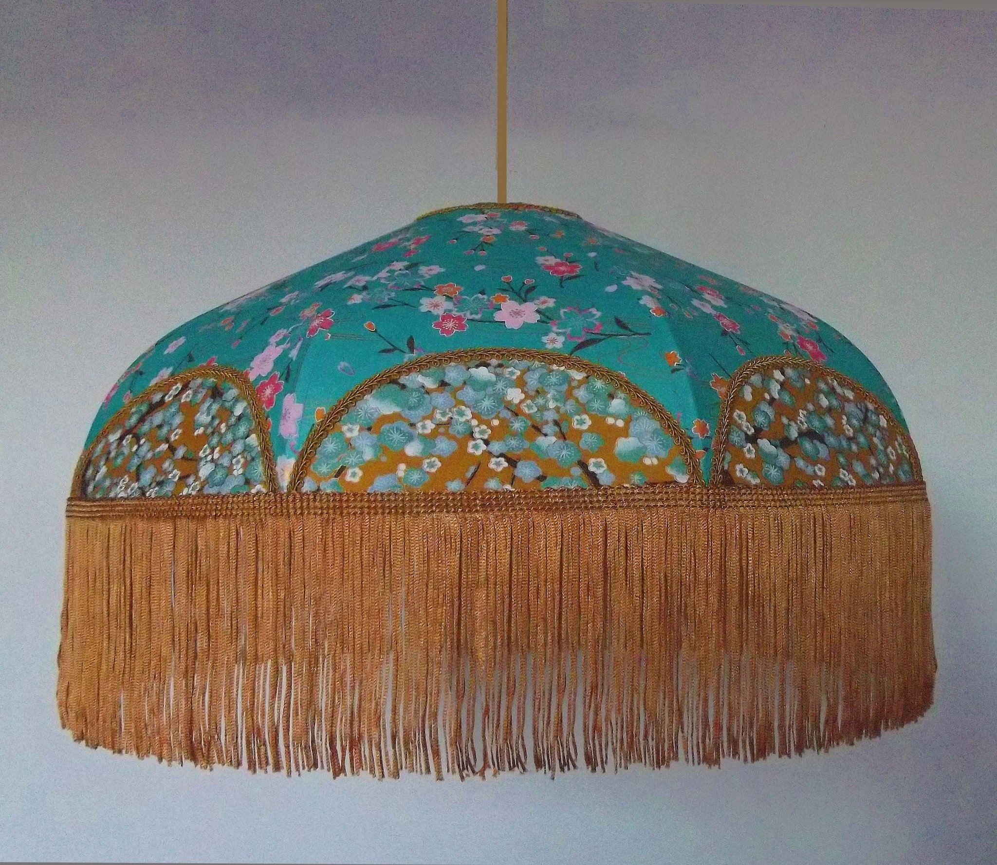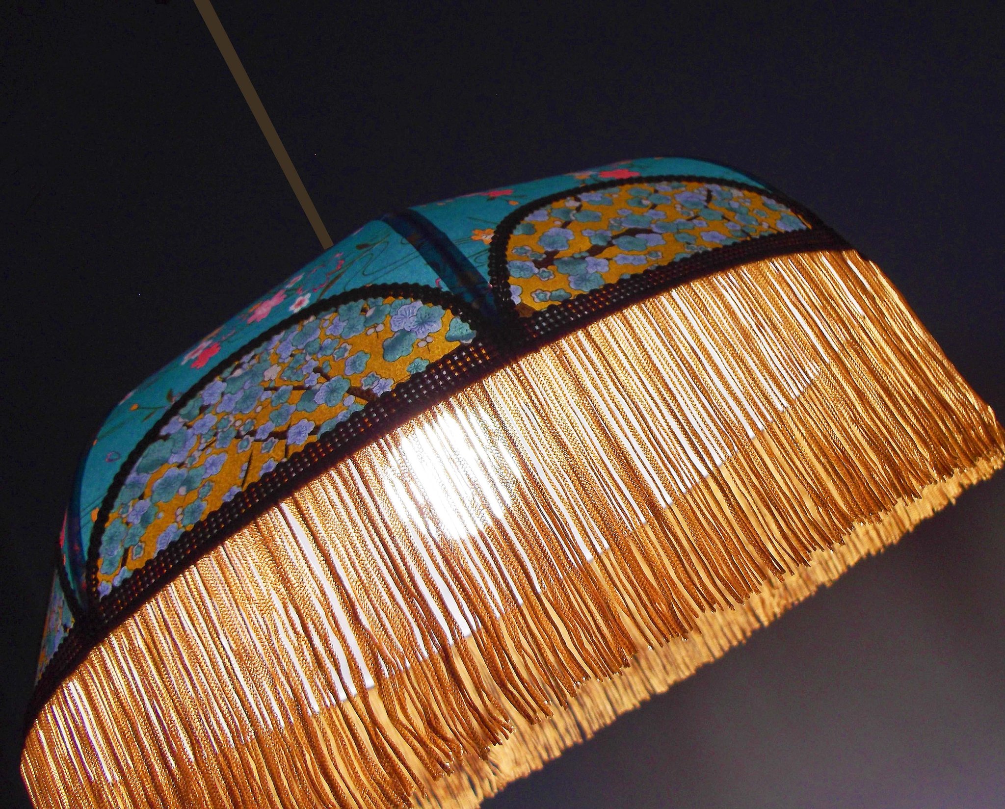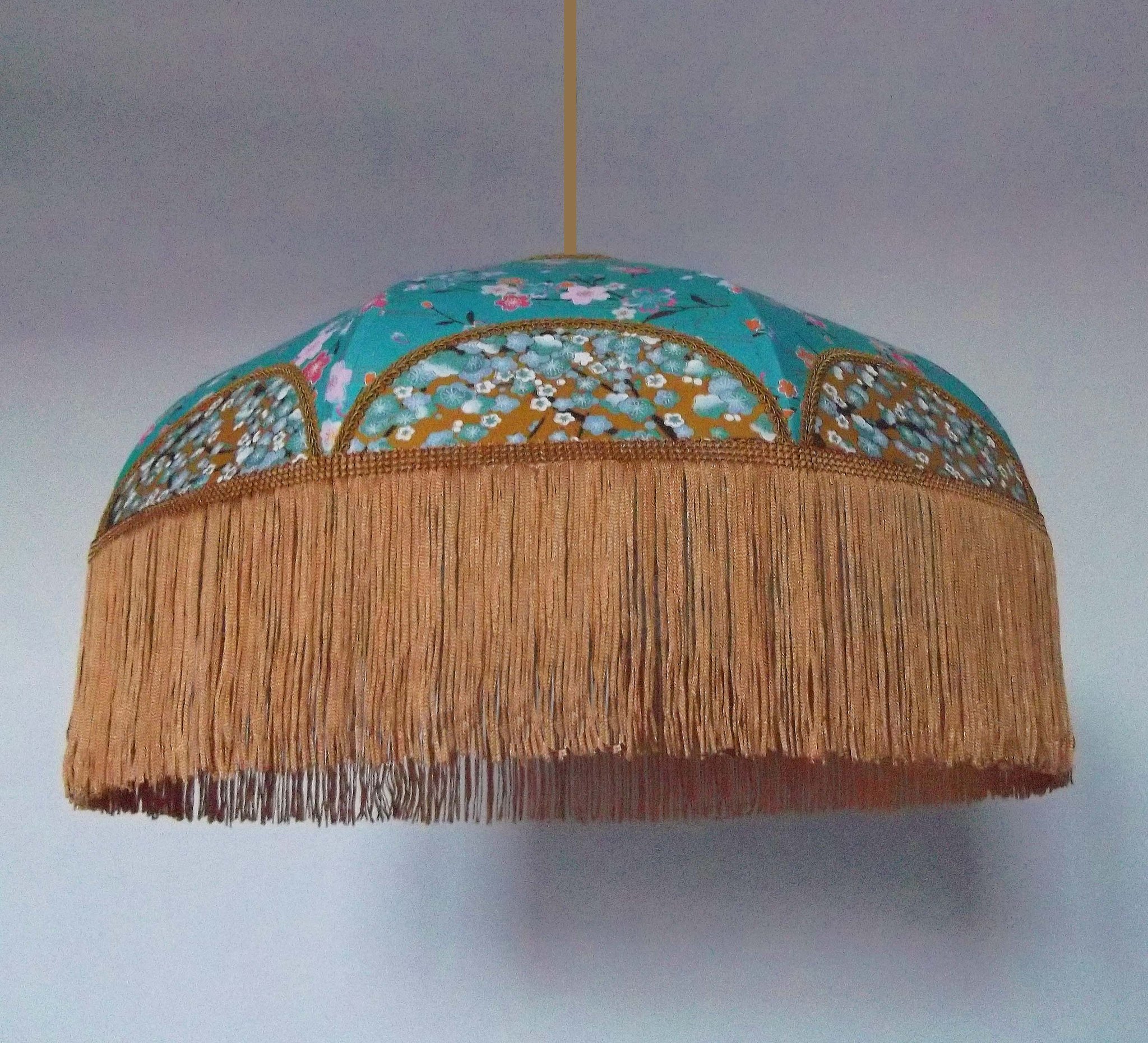 Suspension 40 cm de diamètre. Papier japonais fleurs sur fond turquoise en haut et sur fond moutarde en bas. Frange dorée. Hauteur 14 cm + 10 cm de frange. Douille E27, 40 w max. Sur commande, envoi sous 15 jours.