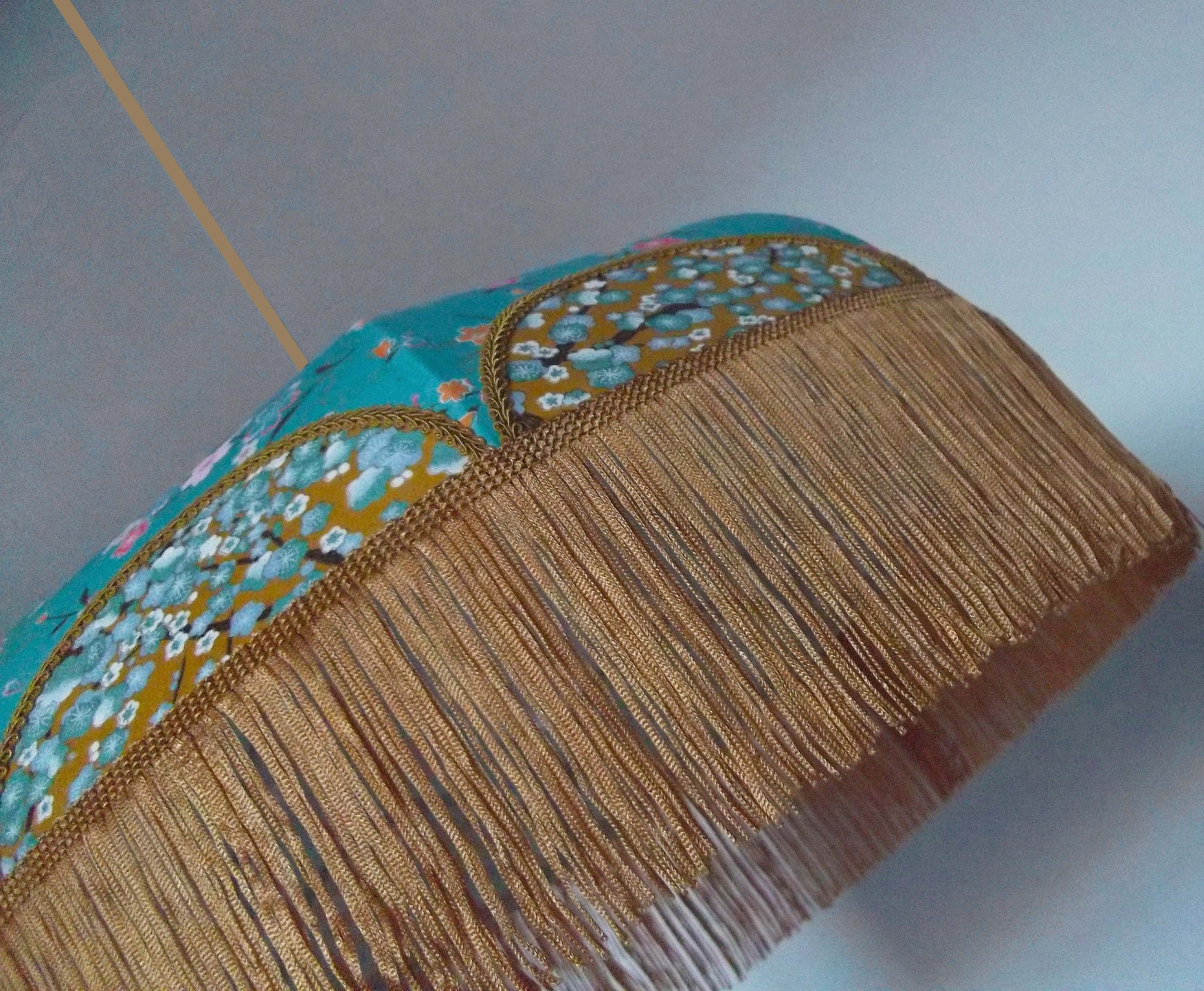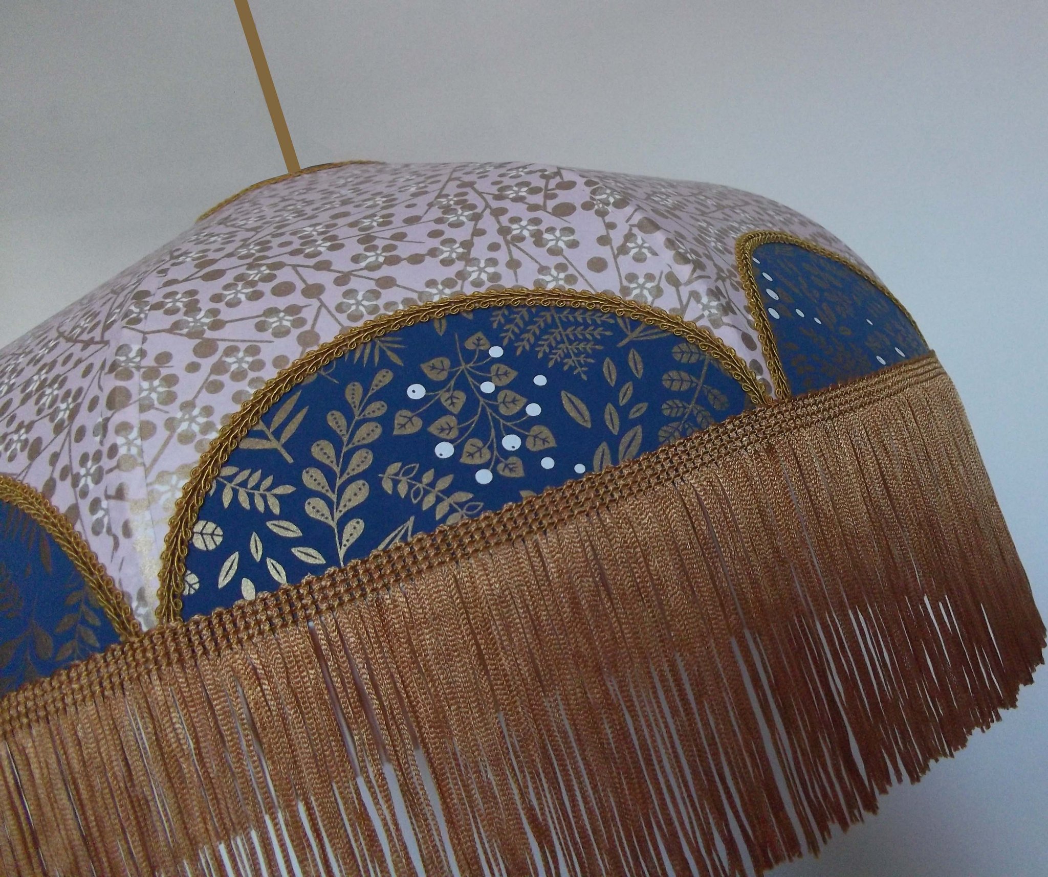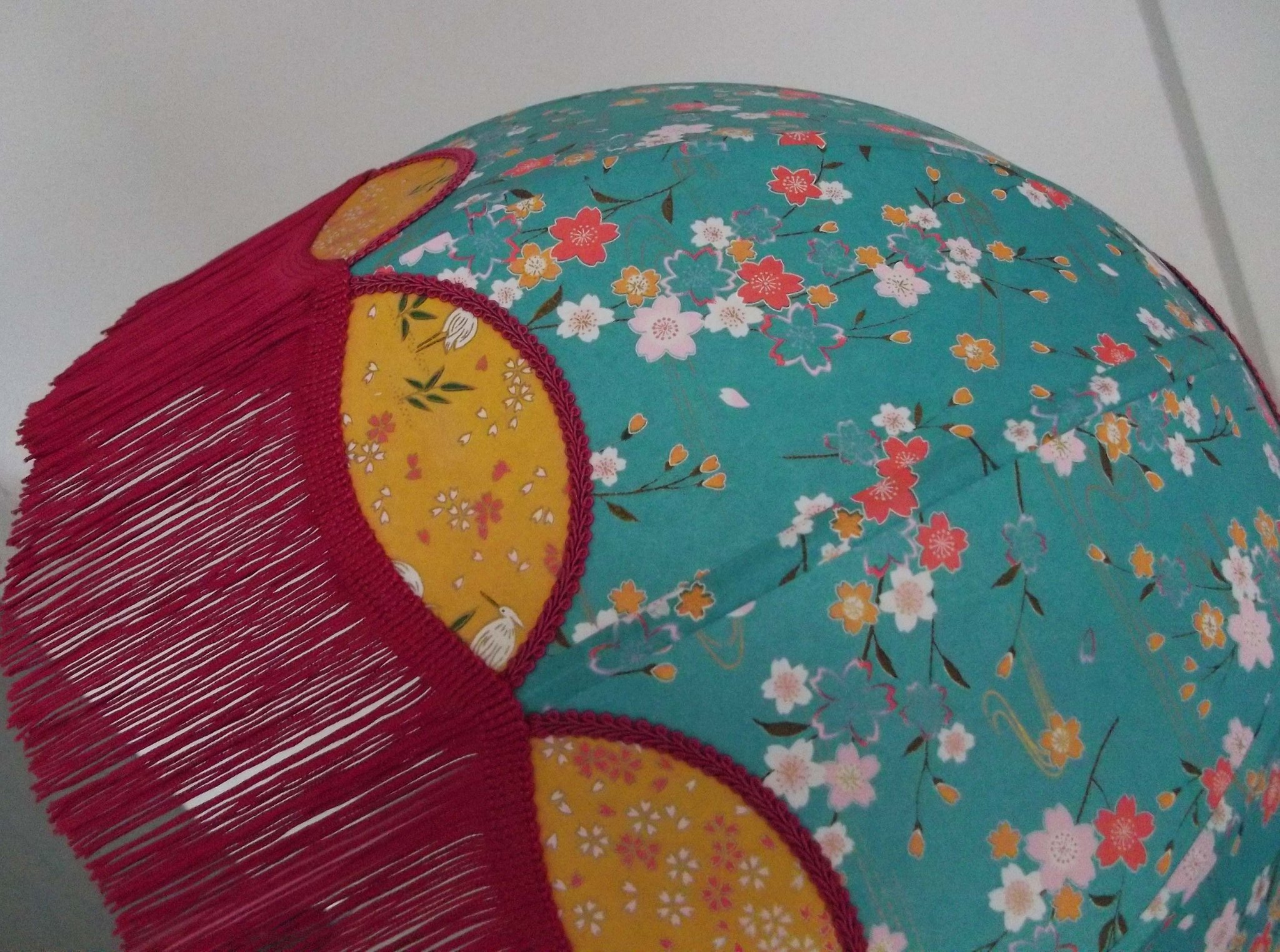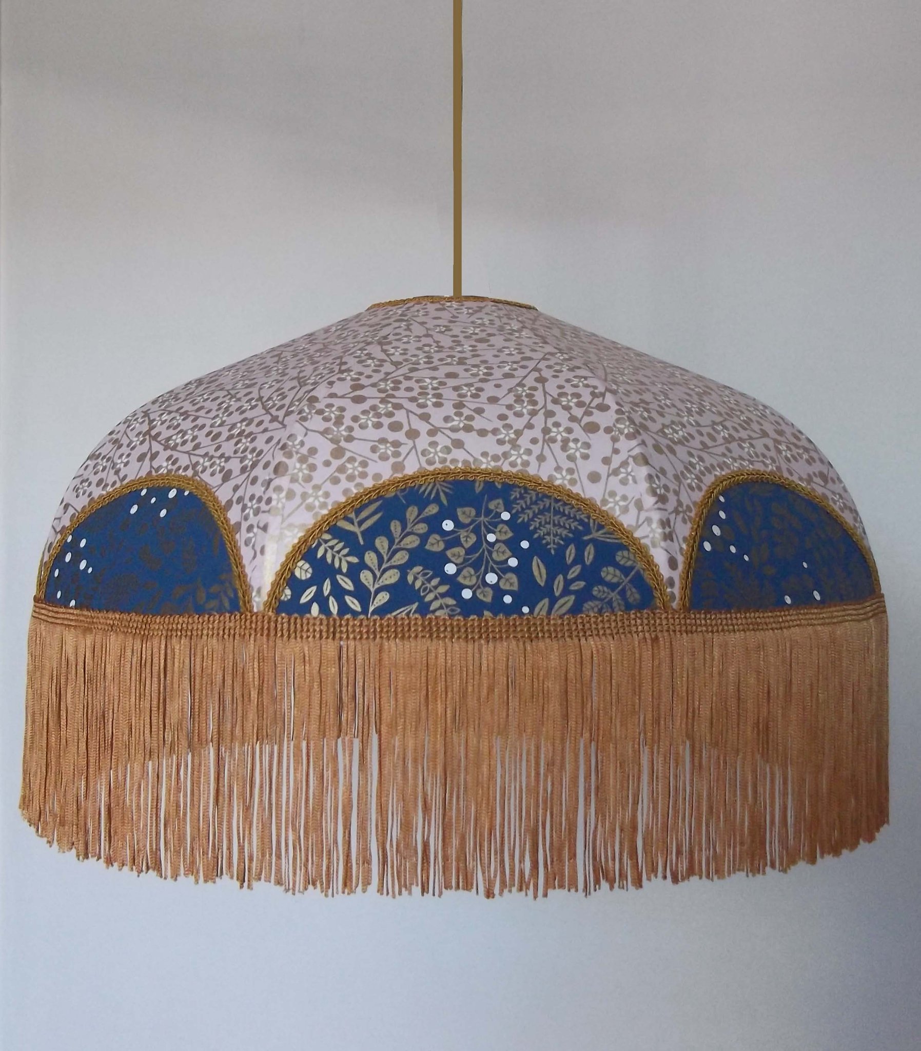 Suspension 40 cm de diamètre. Papier japonais fleurs sur fond turquoise en haut et sur fond moutarde en bas. Frange dorée. Hauteur 14 cm + 10 cm de frange. Douille E27, 40 w max. Sur commande, envoi sous 15 jours.