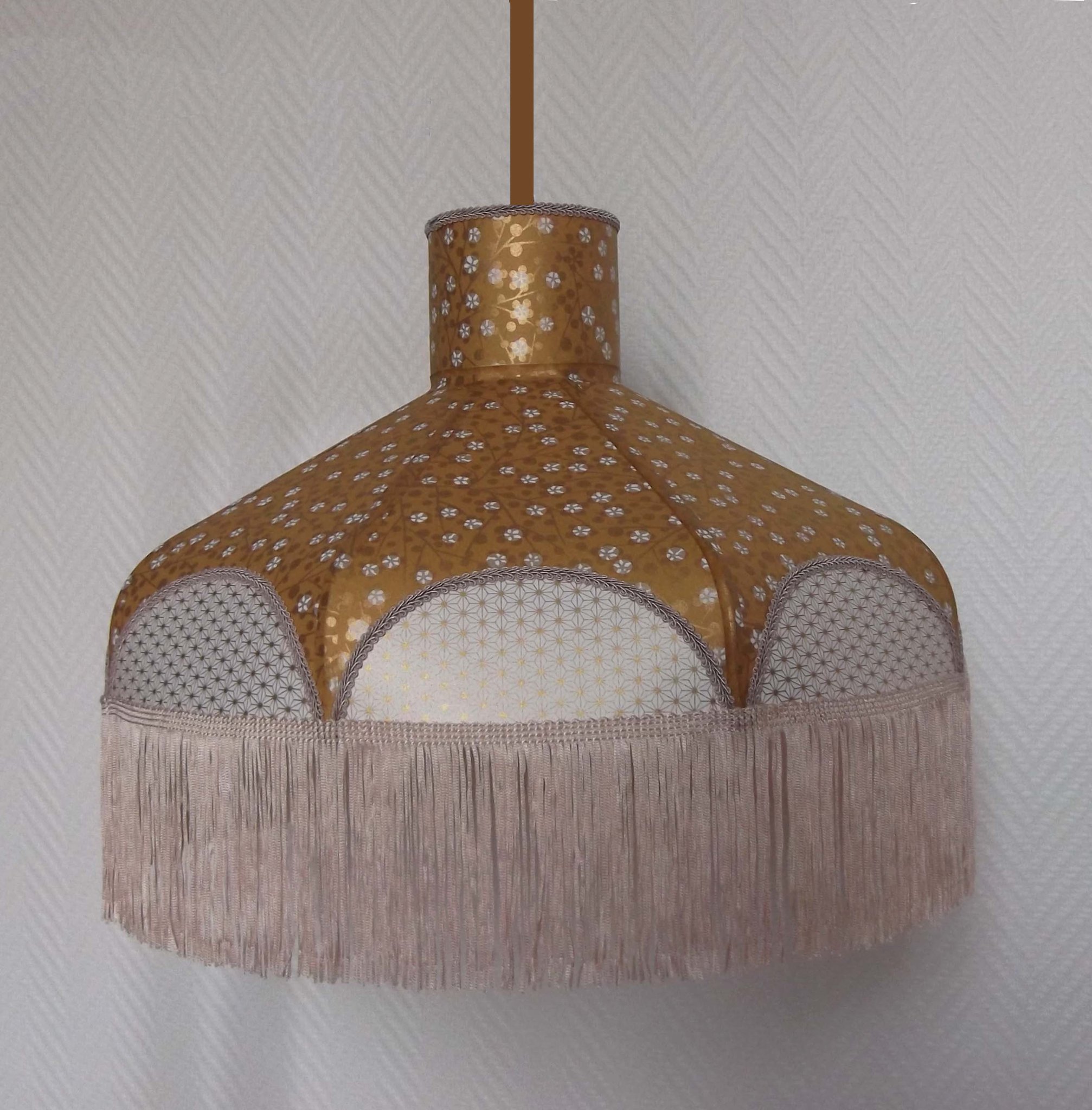 Suspension 40 cm de diamètre. Papier japonais "étoiles dorées" en haut et "fleurs dorées" sur fond moutarde en bas. Frange beige. Hauteur 14 cm + 10 cm de frange. Douille E27, 40 w max. Sur commande, envoi sous 15 jours.