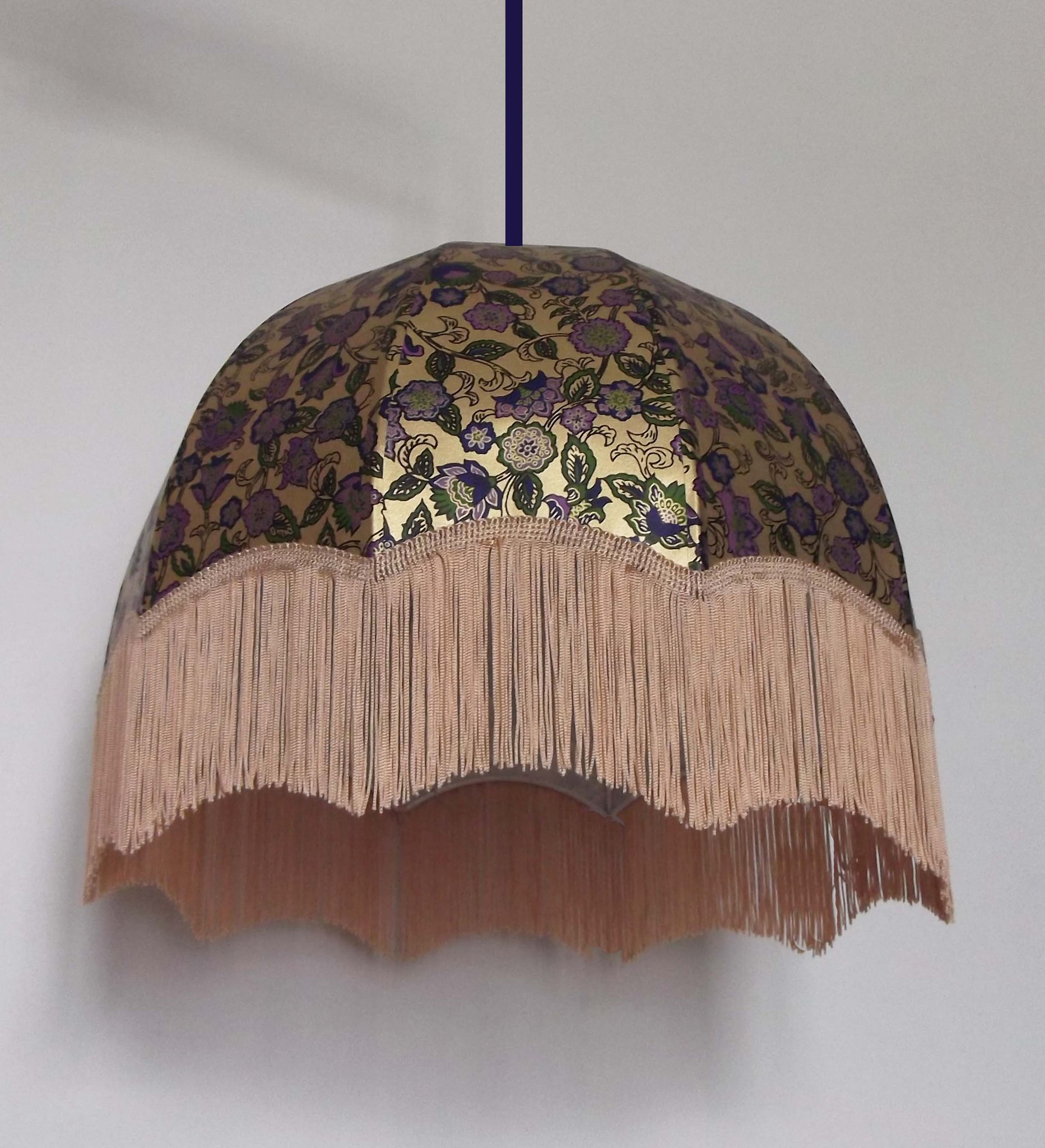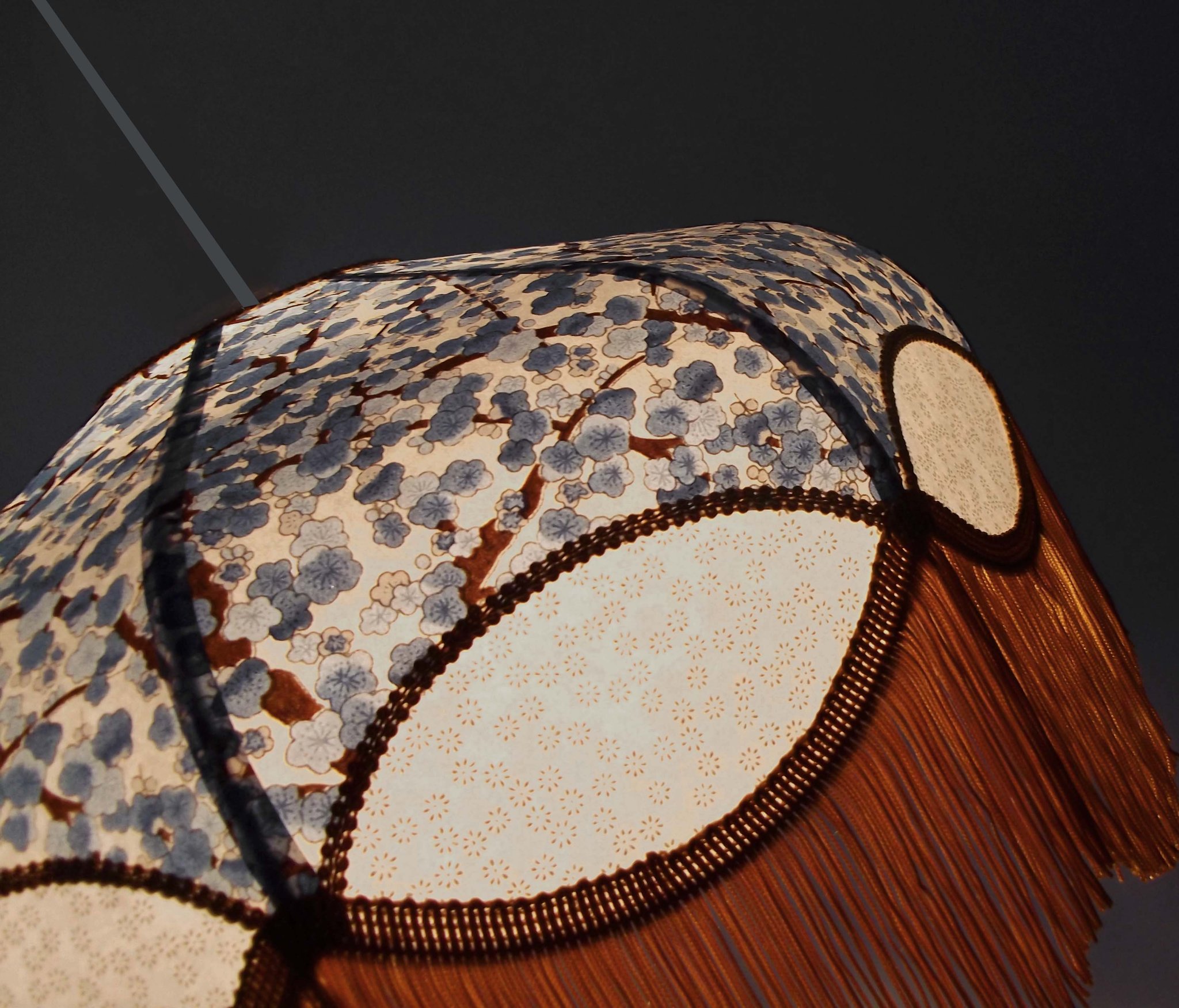 Suspension, 40 cm de diamètre. Papier japonais fleurs de prunier sur fond violet foncé et frange