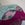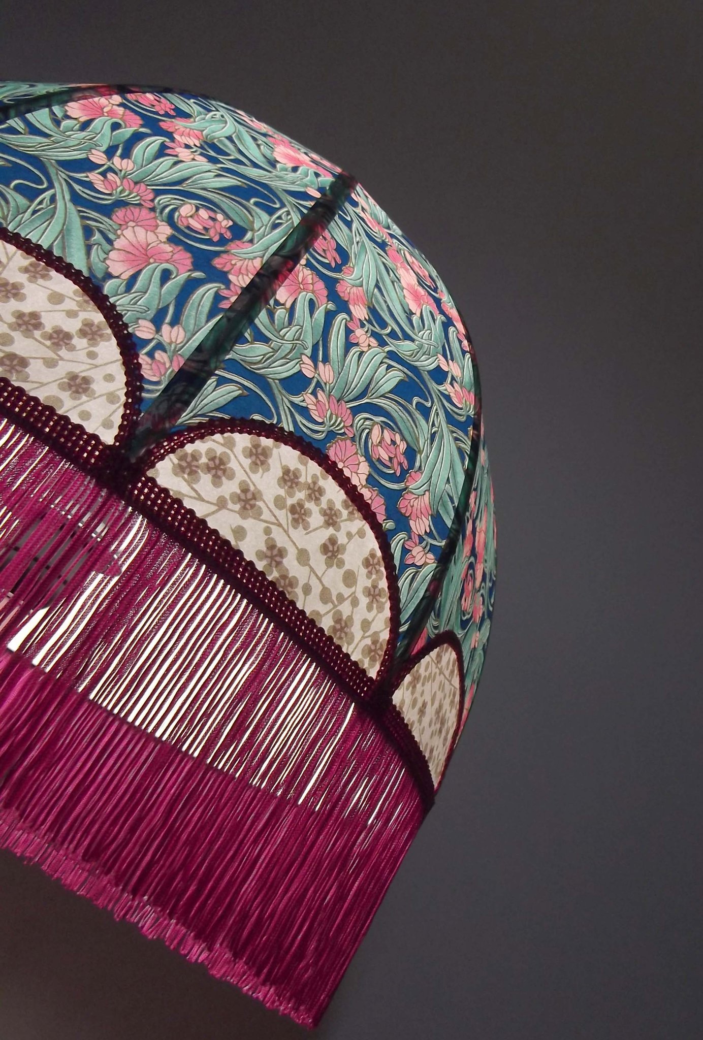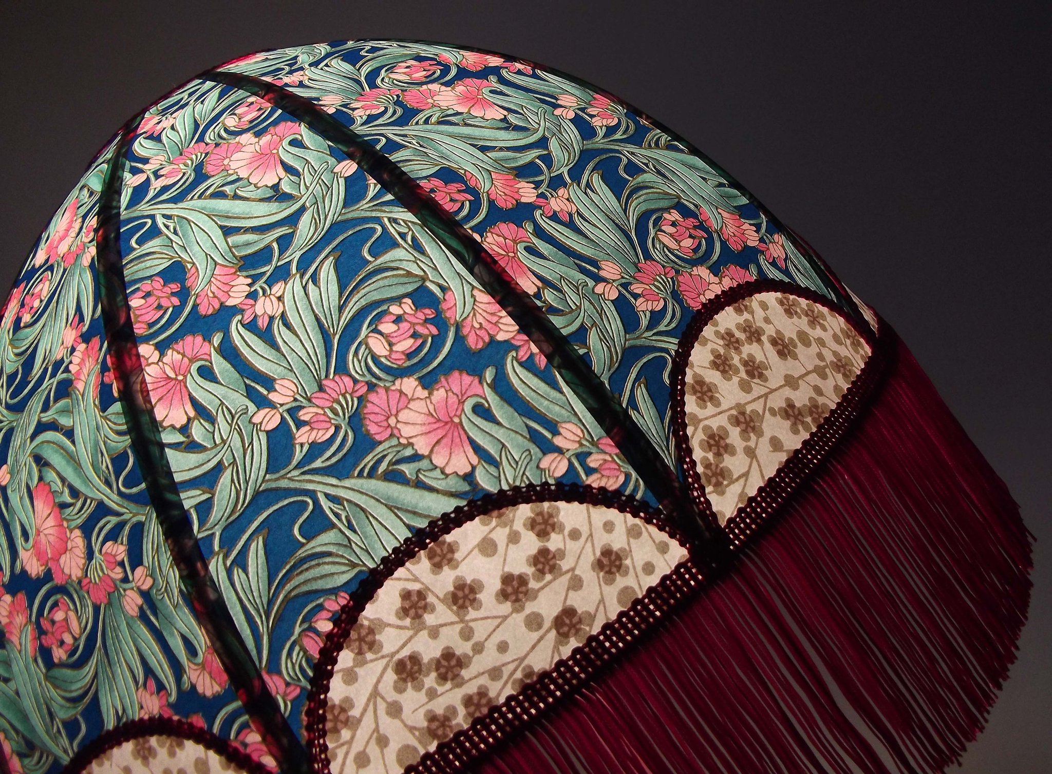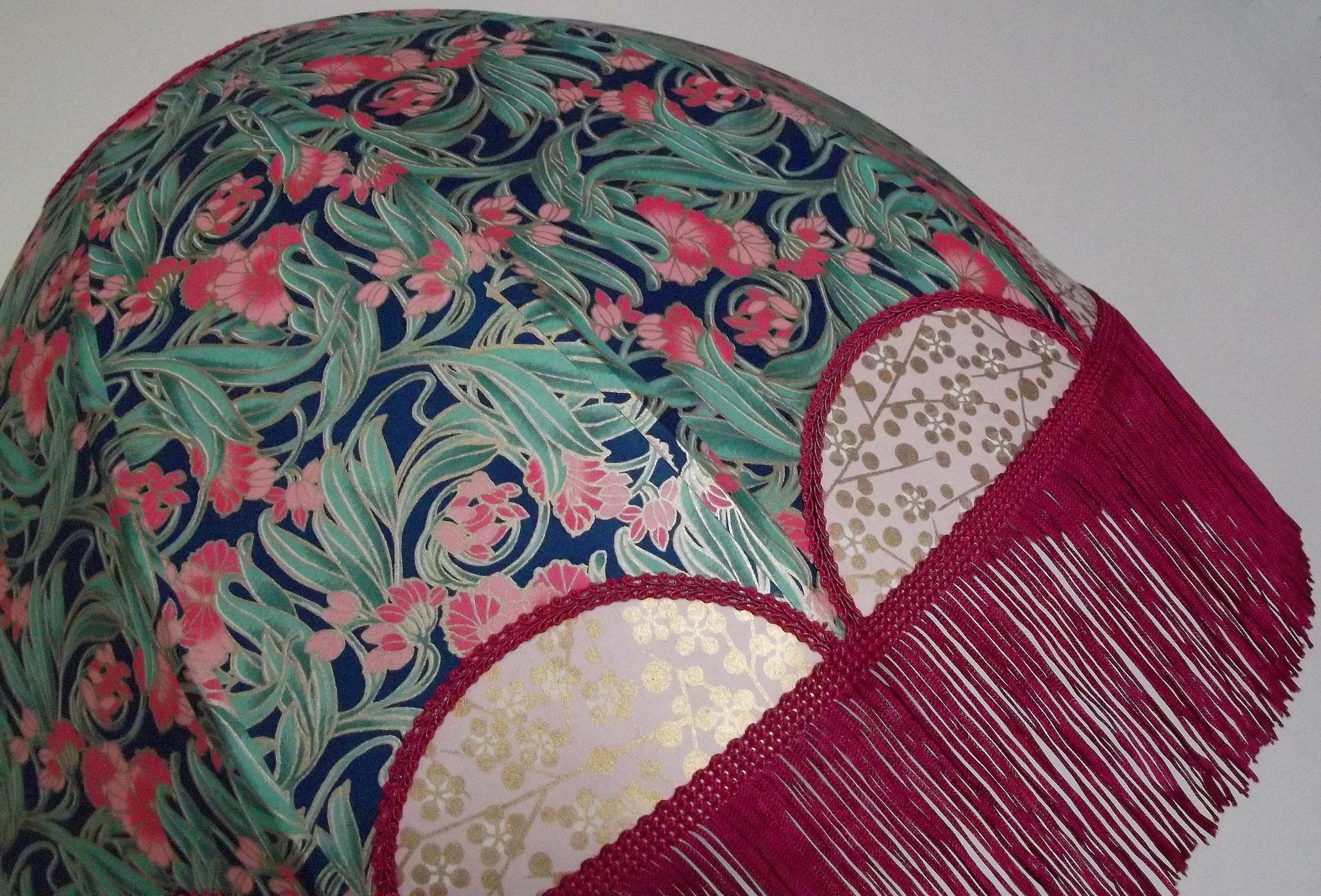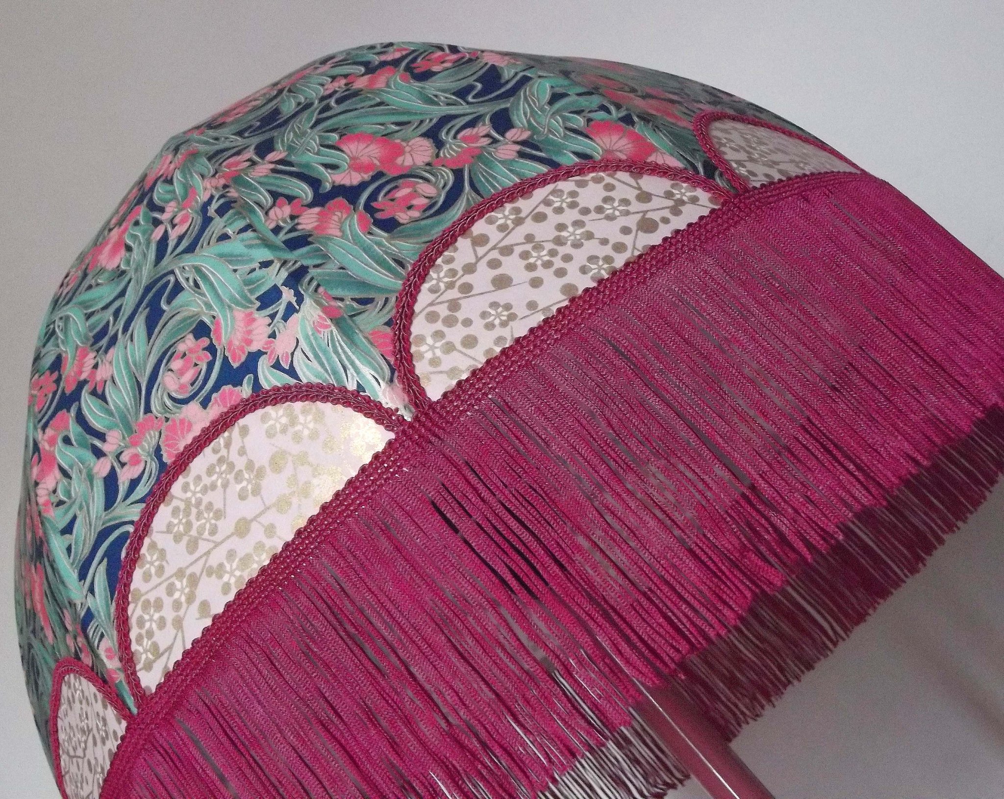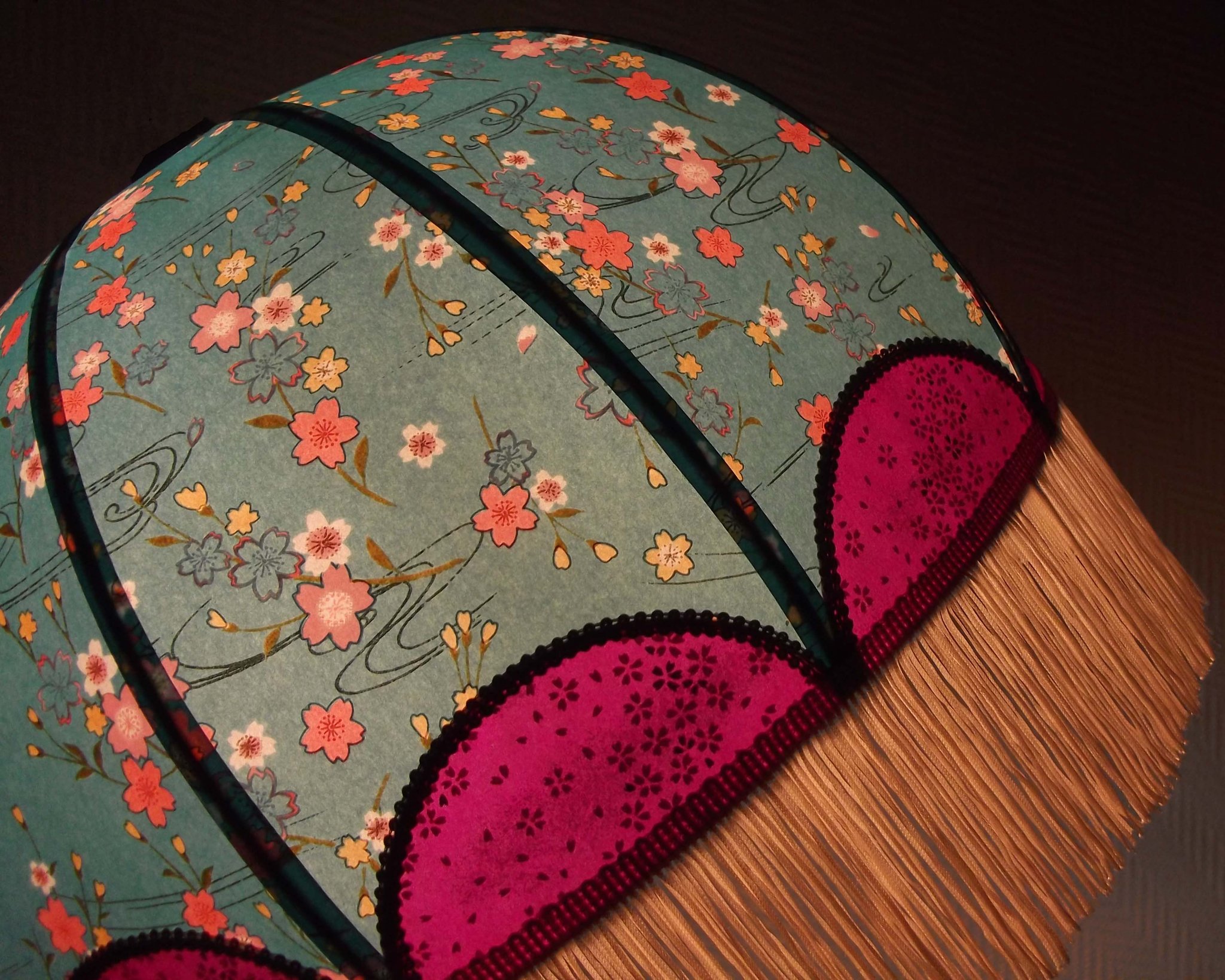 Abat-jour 40 cm de diamètre. Papier japonais fleurs sur fond bleu en haut et sur fond vert en bas. Frange fuchsia. Hauteur 16 cm + 10 cm de frange. Douille E27, 40 w max.