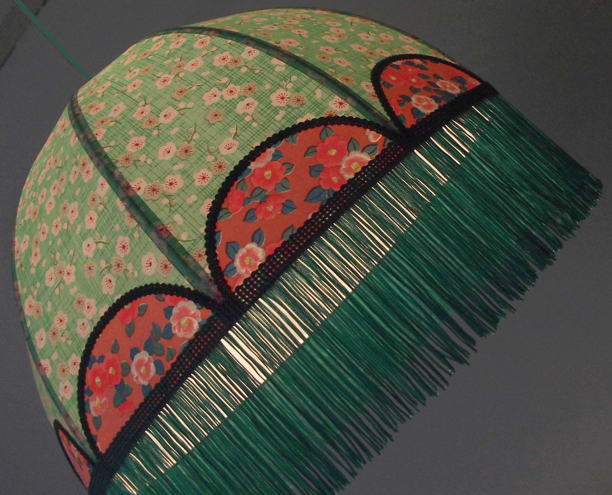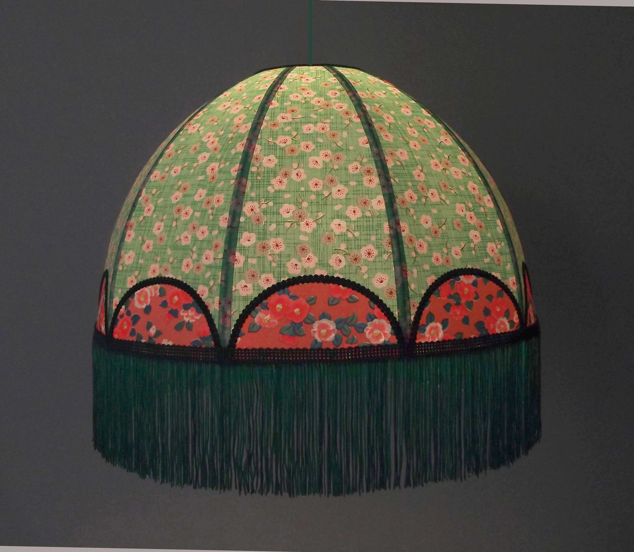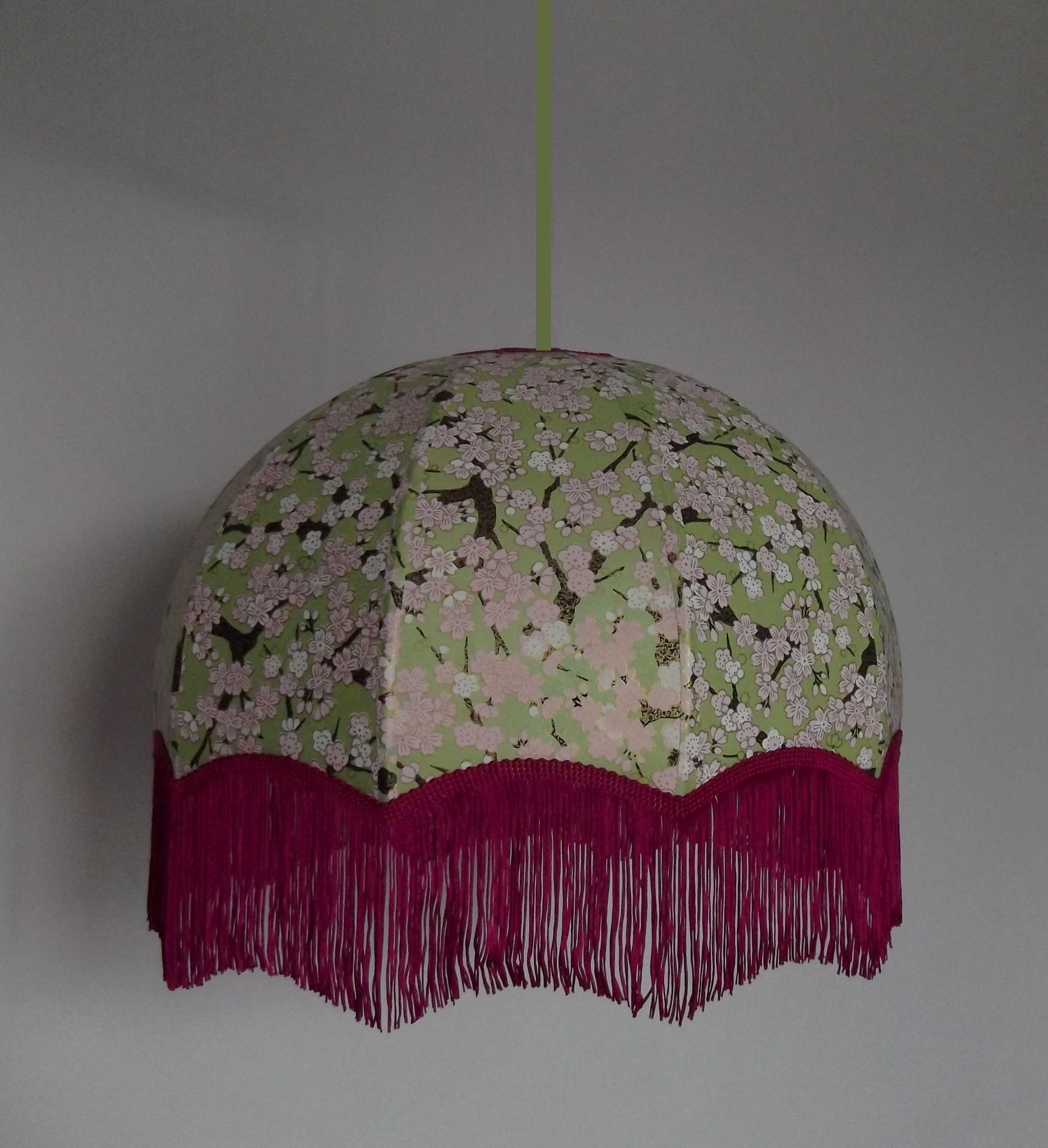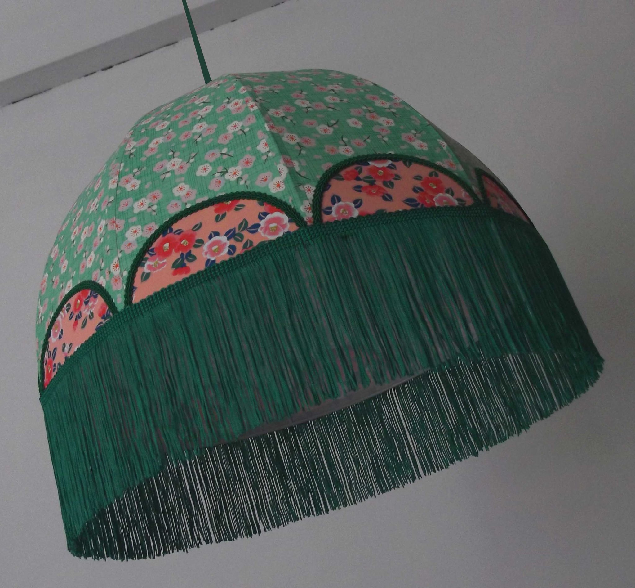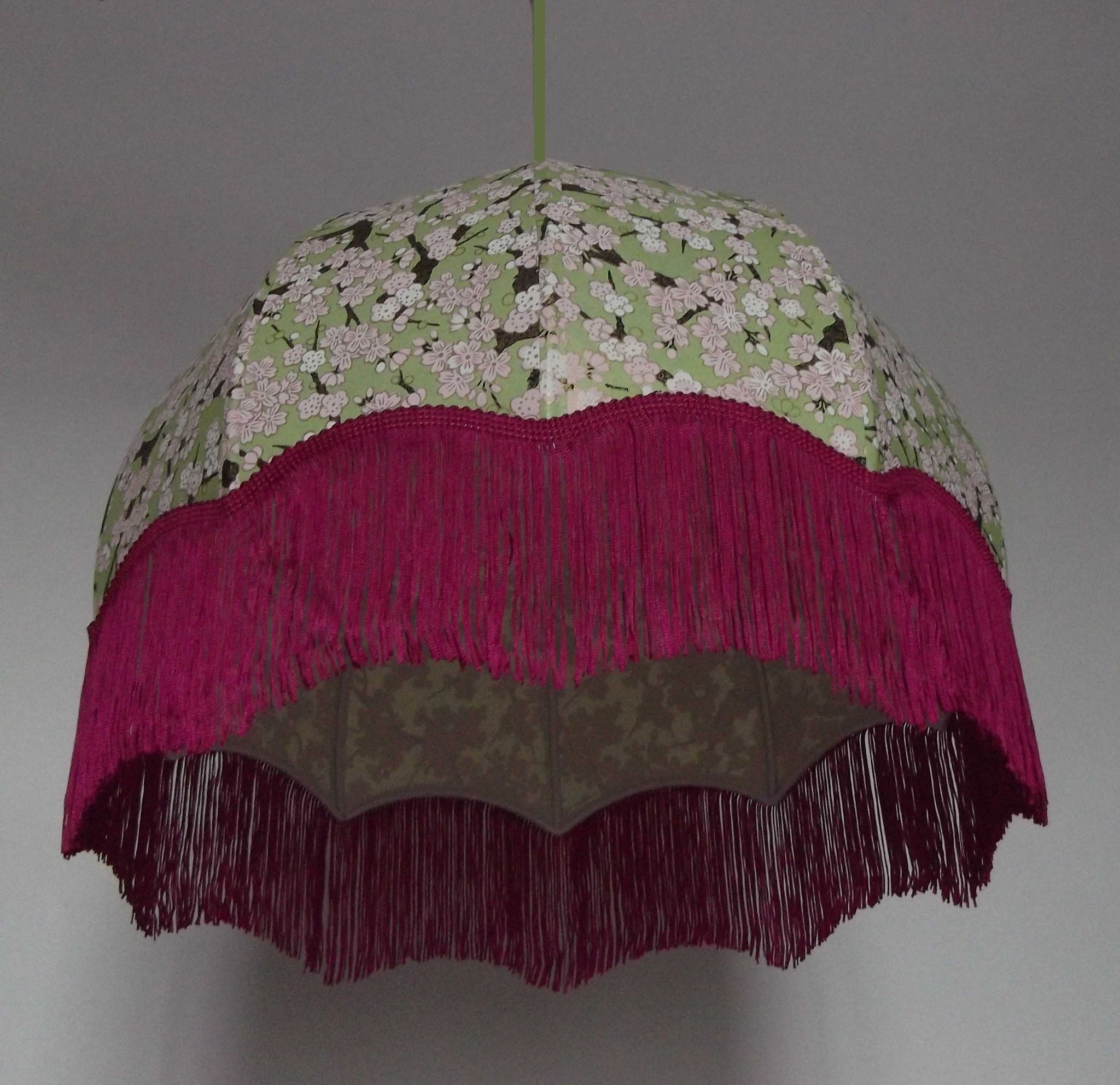 Abat-jour forme dôme, en papier japonais fond rose à fleurs, longue frange verte. Diamètre 40 cm, hauteur 14 cm + 10 cm de frange.