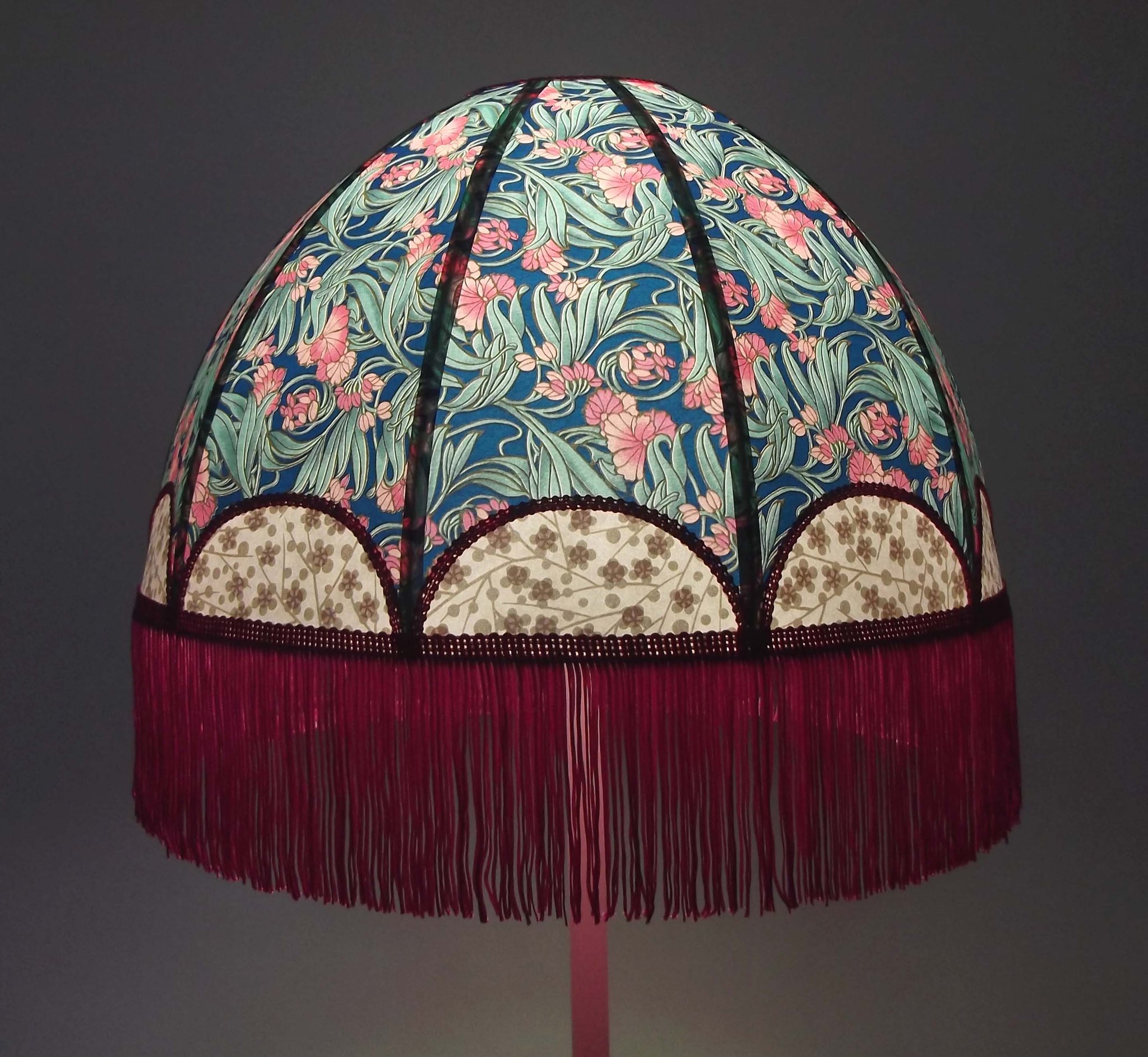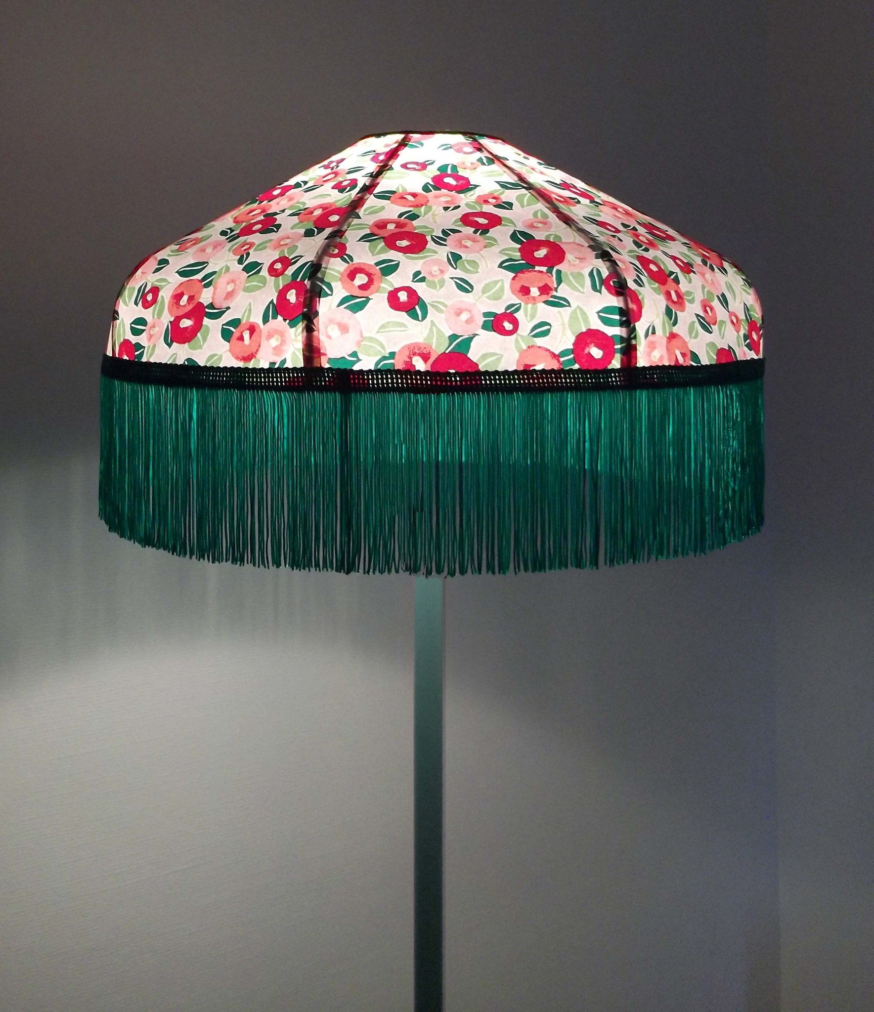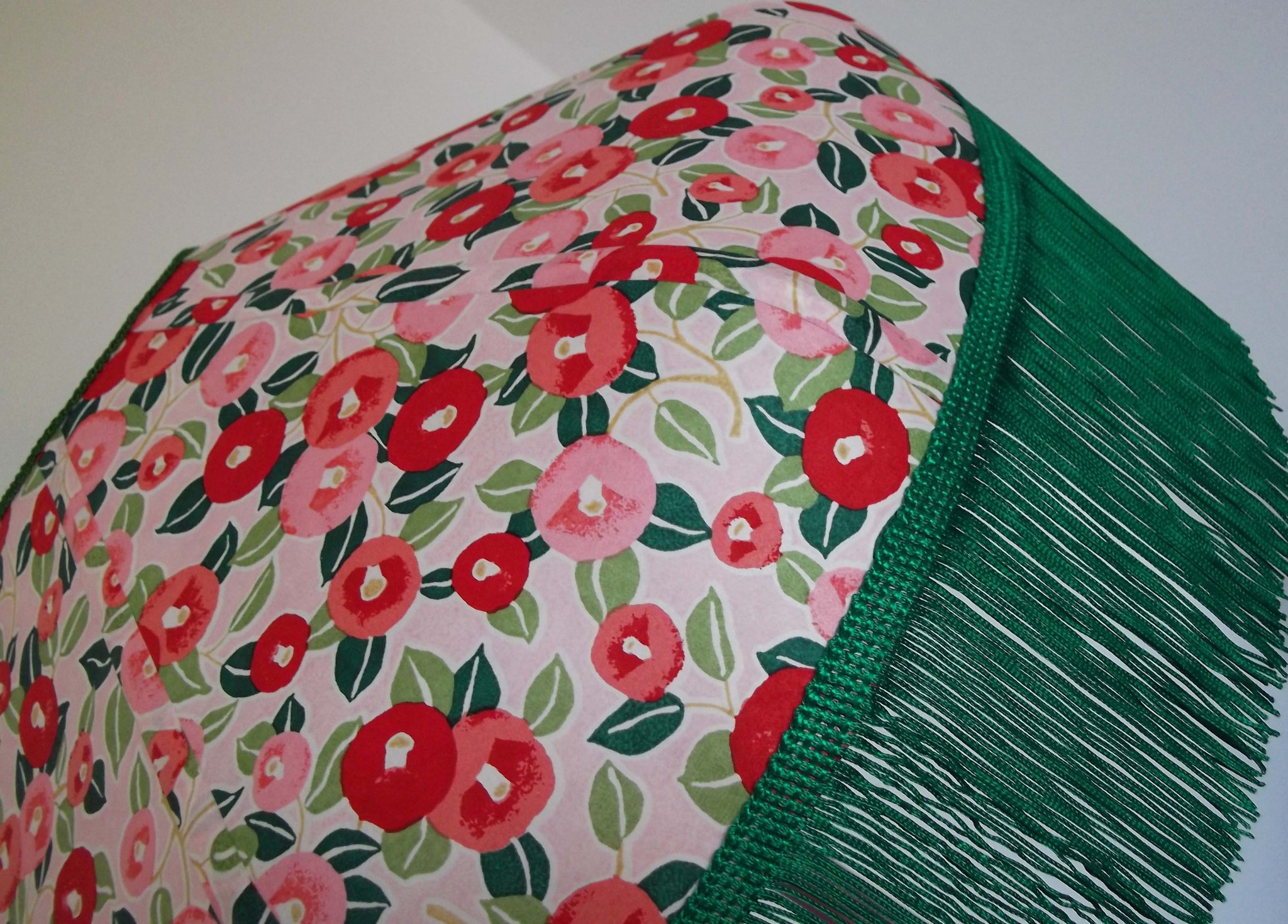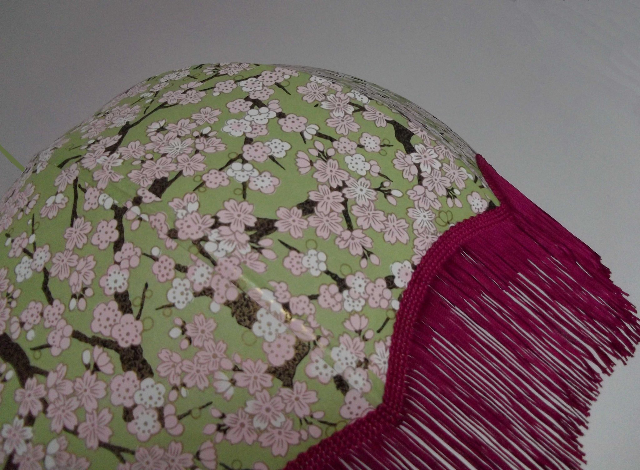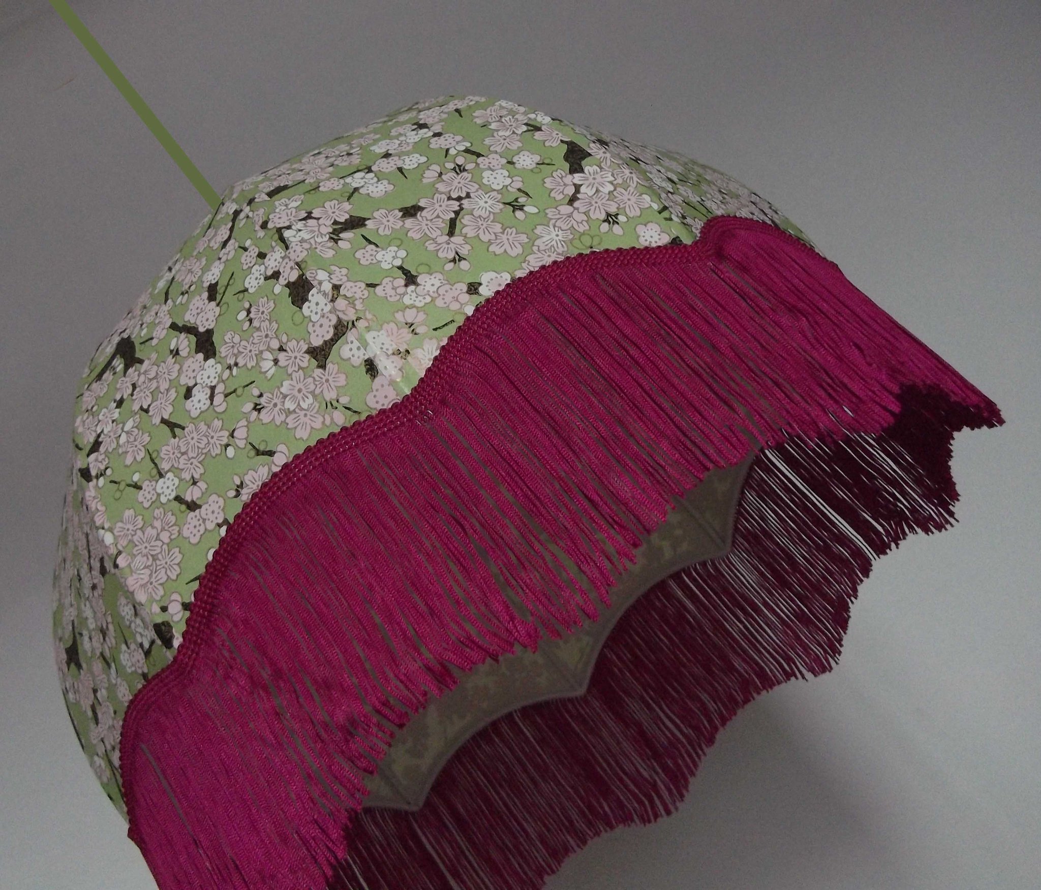 Abat-jour forme dôme, en papier japonais fond rose à fleurs, longue frange verte. Diamètre 40 cm, hauteur 14 cm + 10 cm de frange.