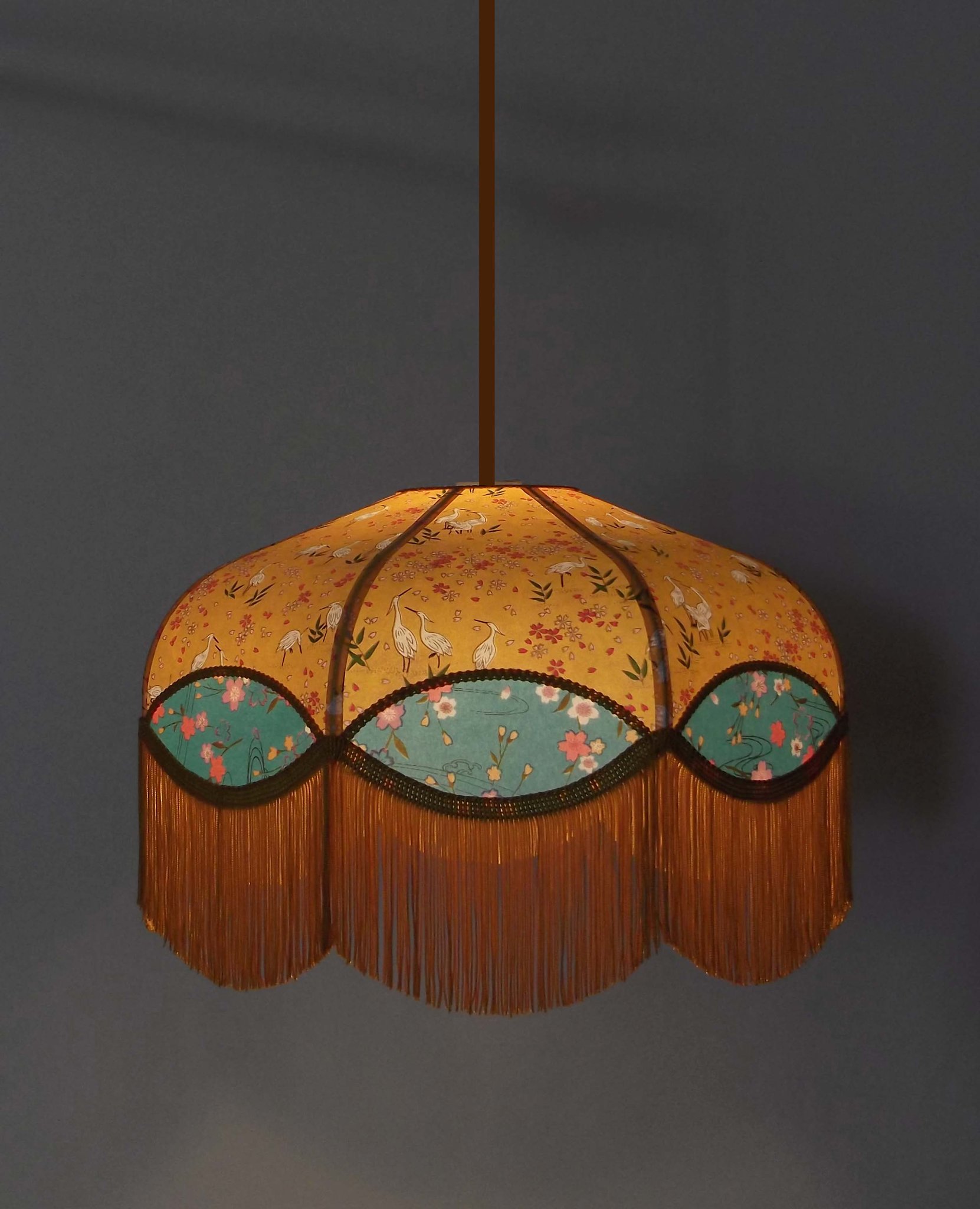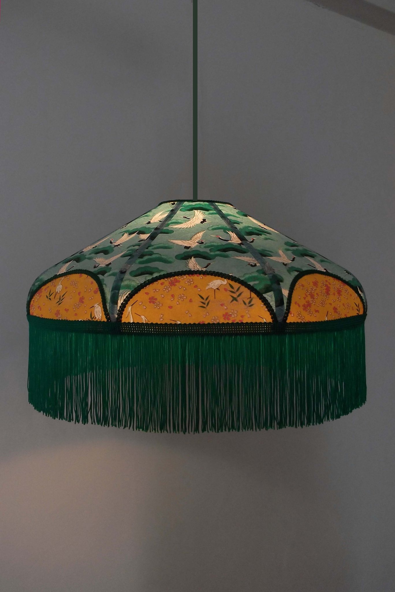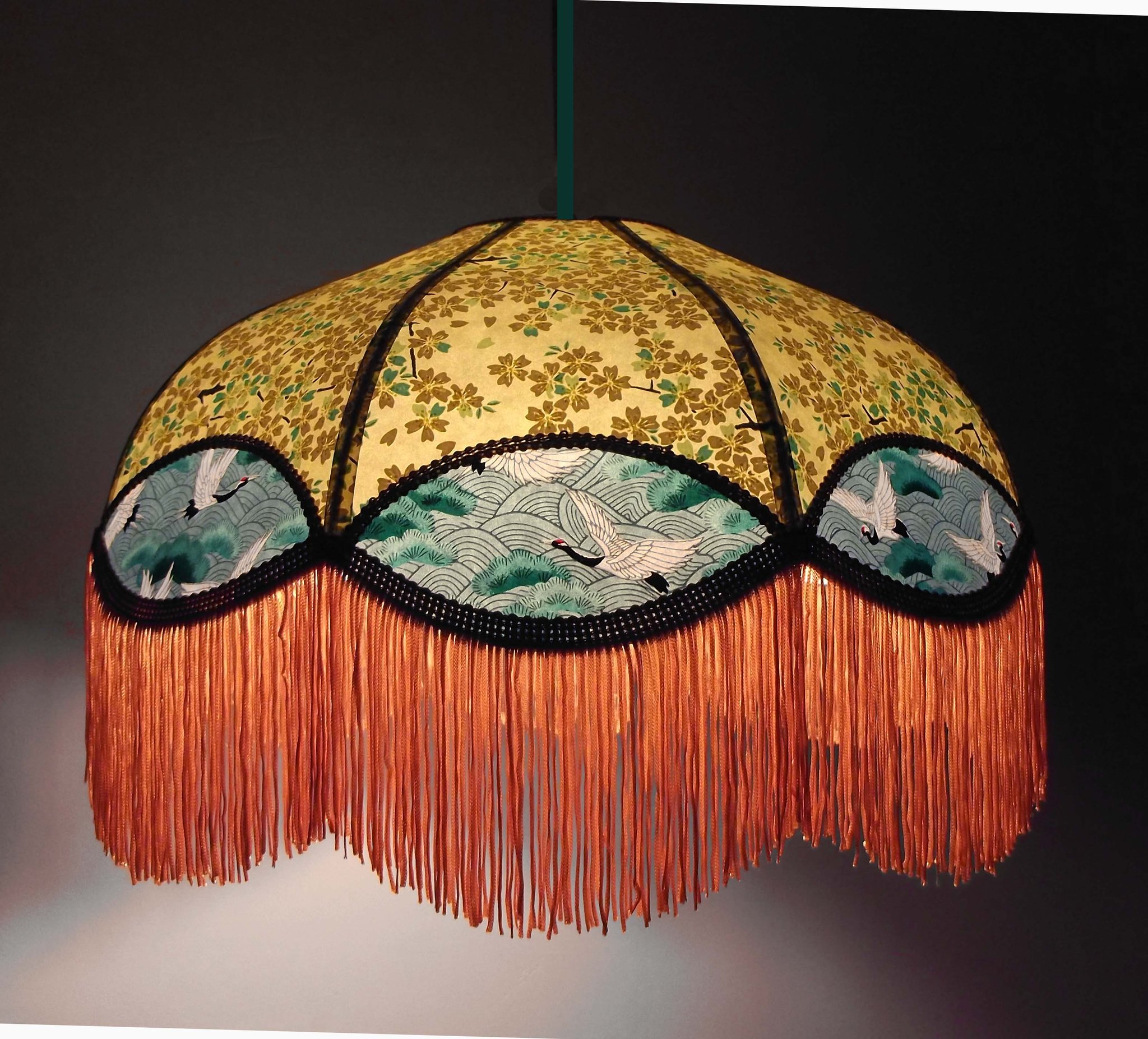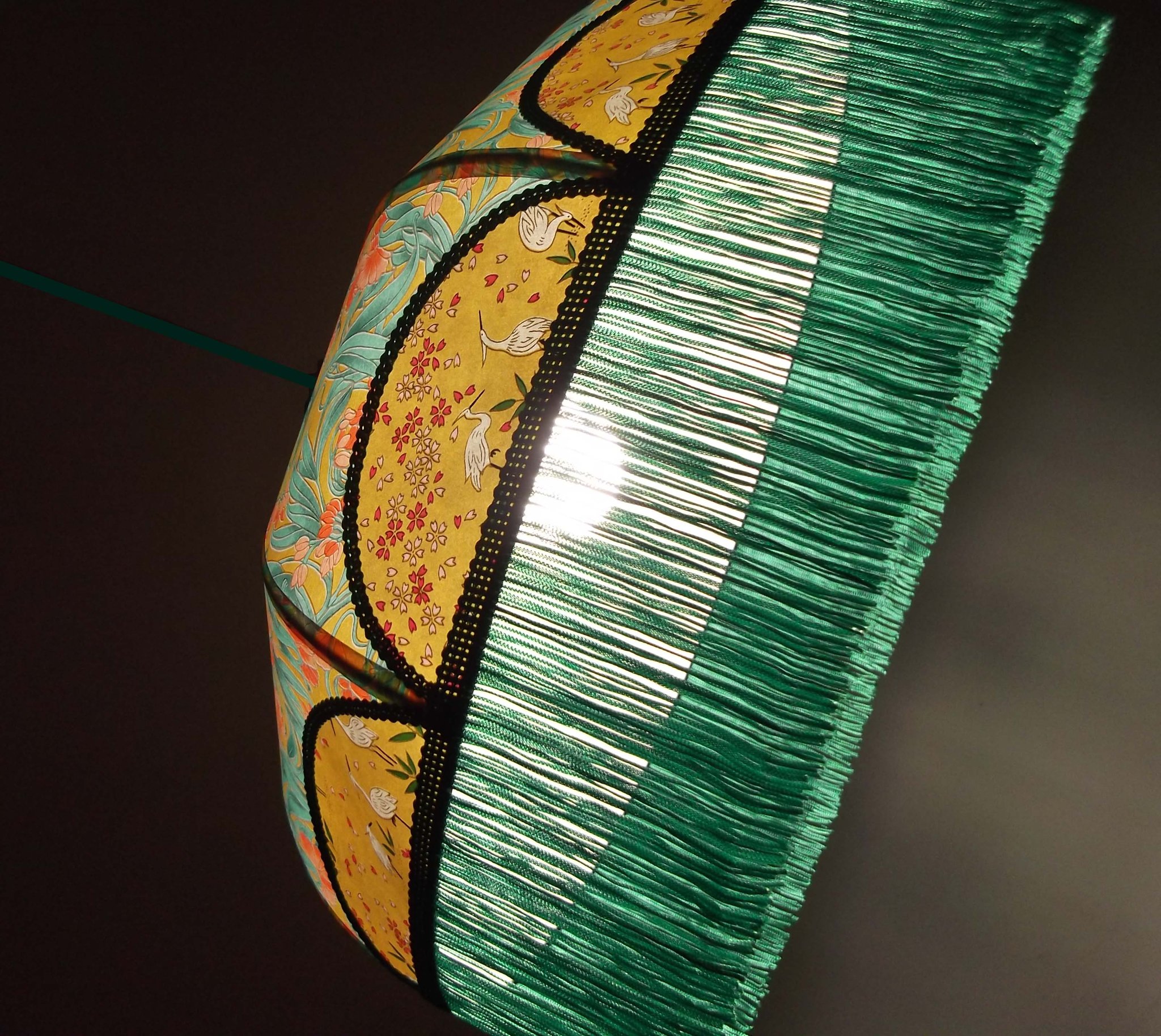 Suspension en papier japonais fleurs sur fond moutarde en haut et grues sur fond vert en bas. Frange dorée.