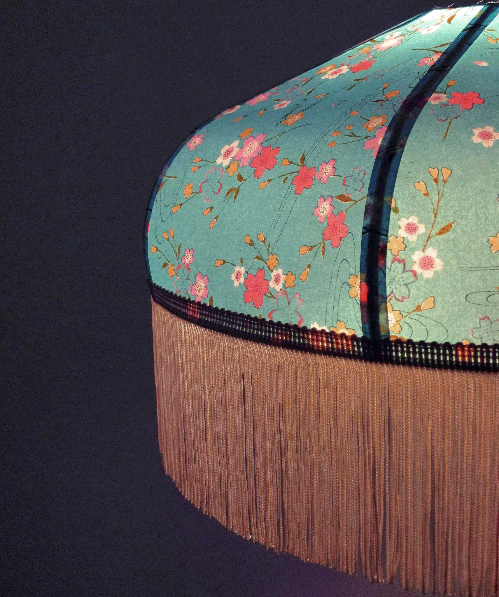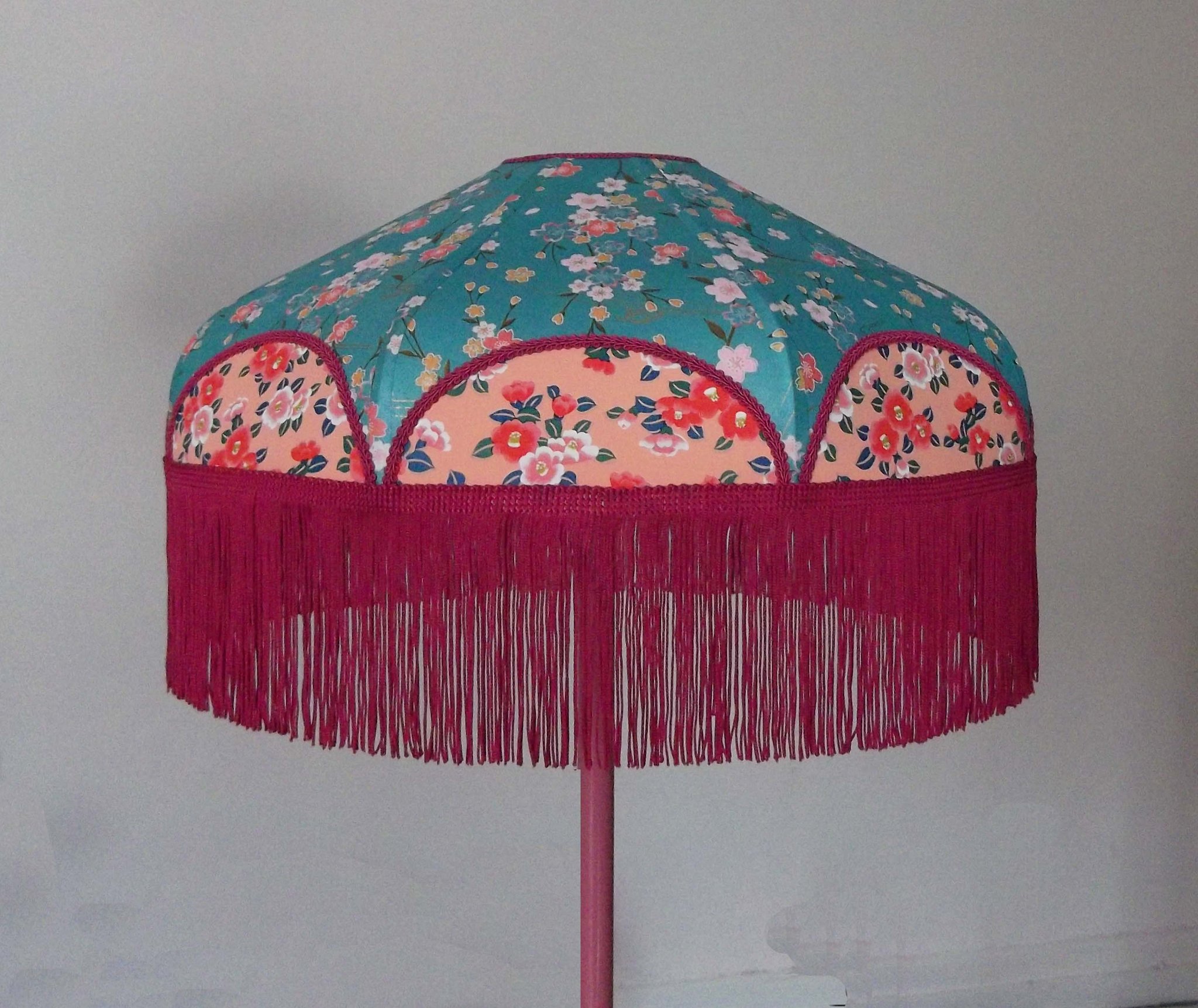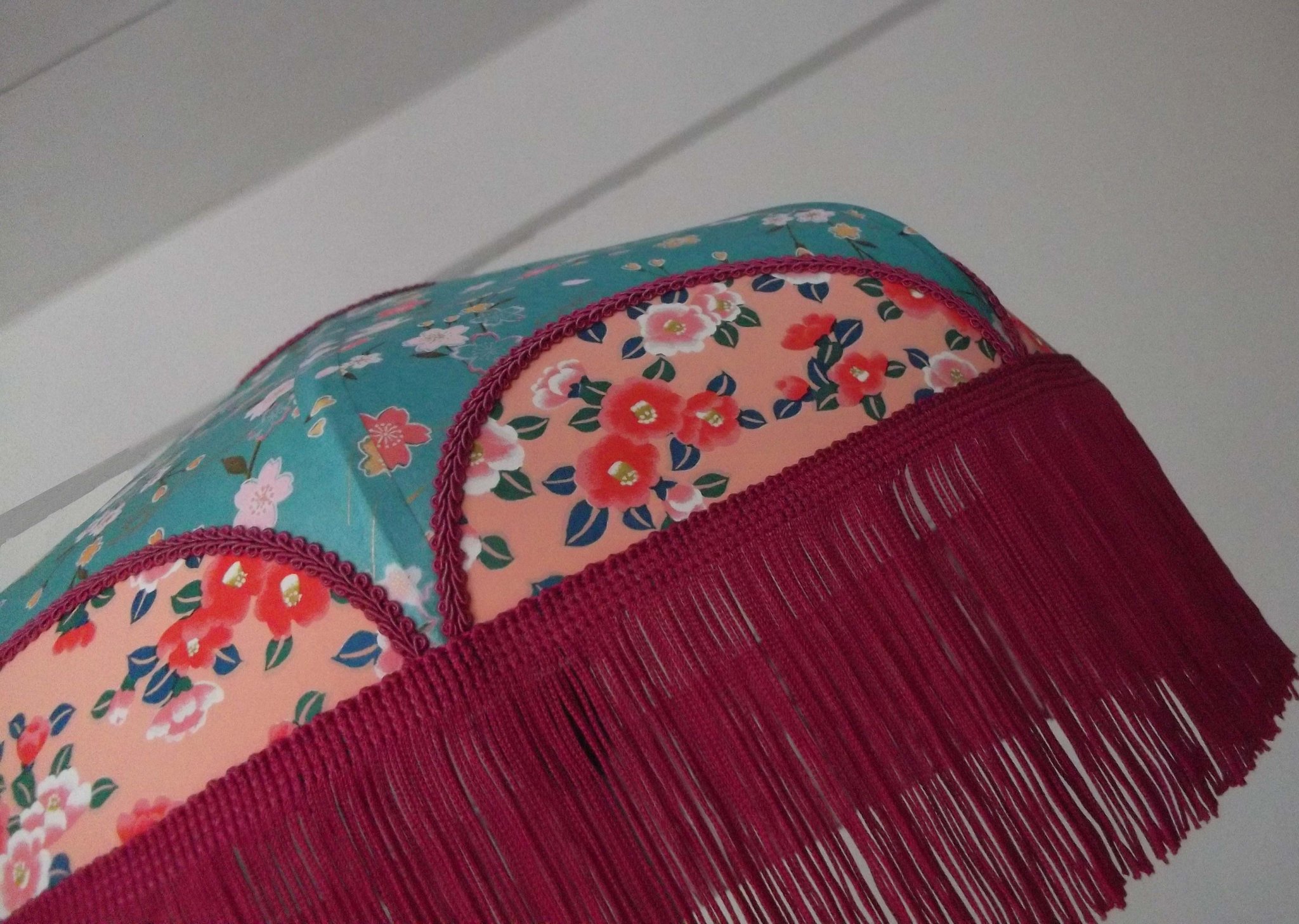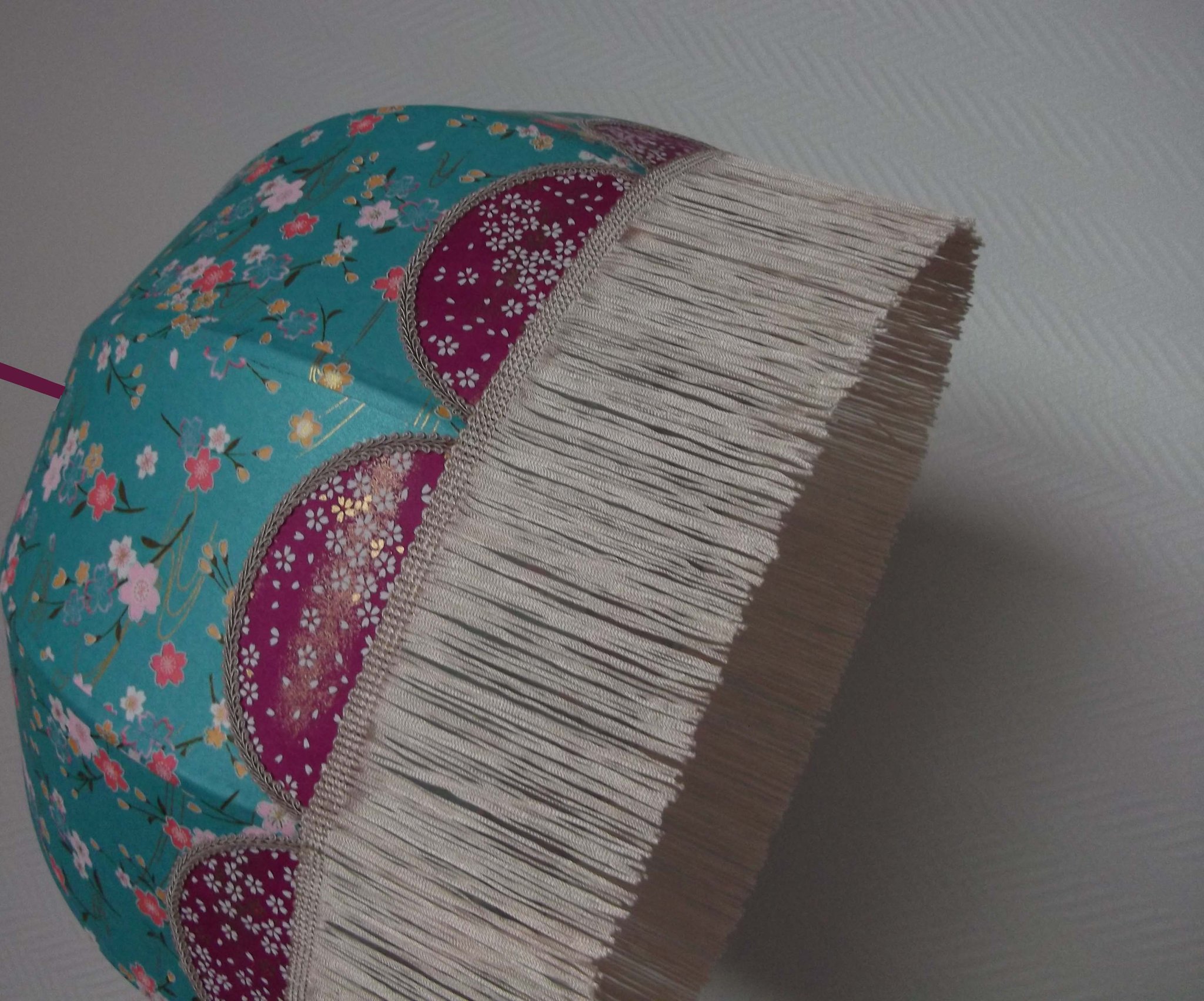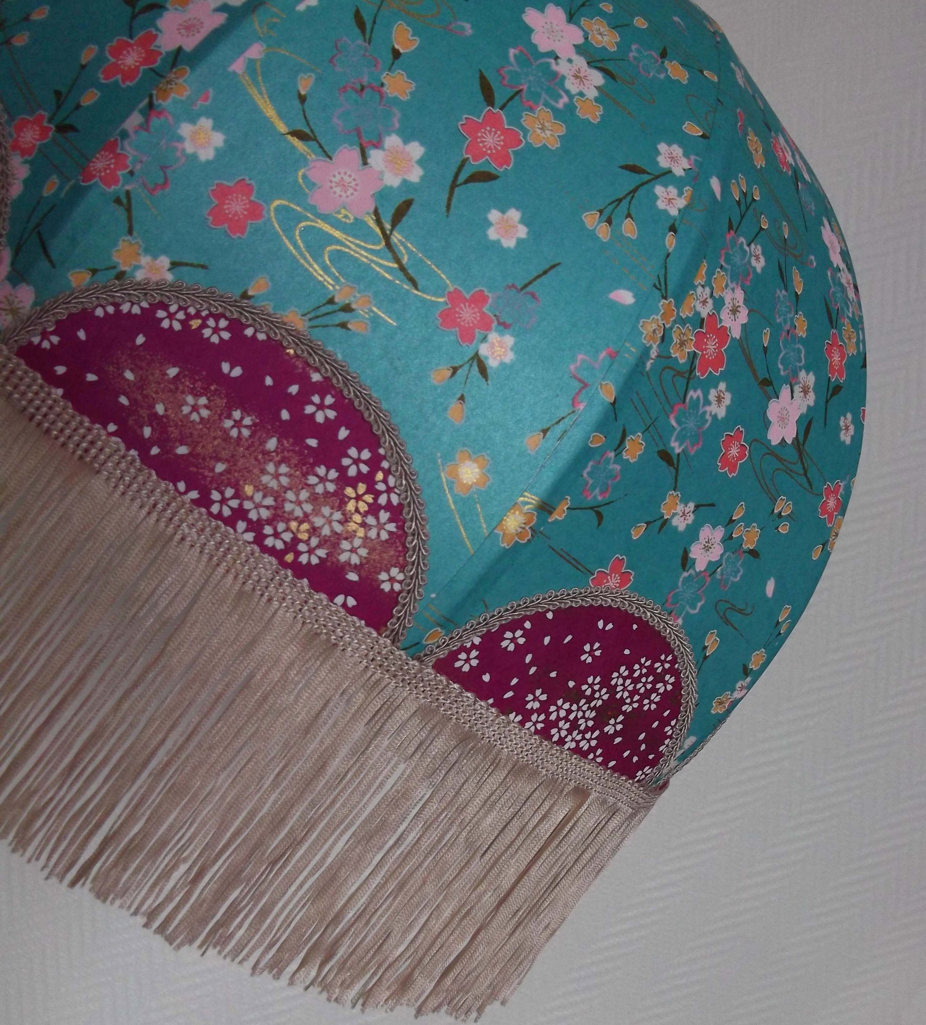 Abat-jour en papier japonais fleurs sur fond turquoise en haut et fond saumon en bas. Frange fuchsia. Diamètre 40 cm, hauteur 14 cm + 10 cm de frange. Douille E27, 40 w max.