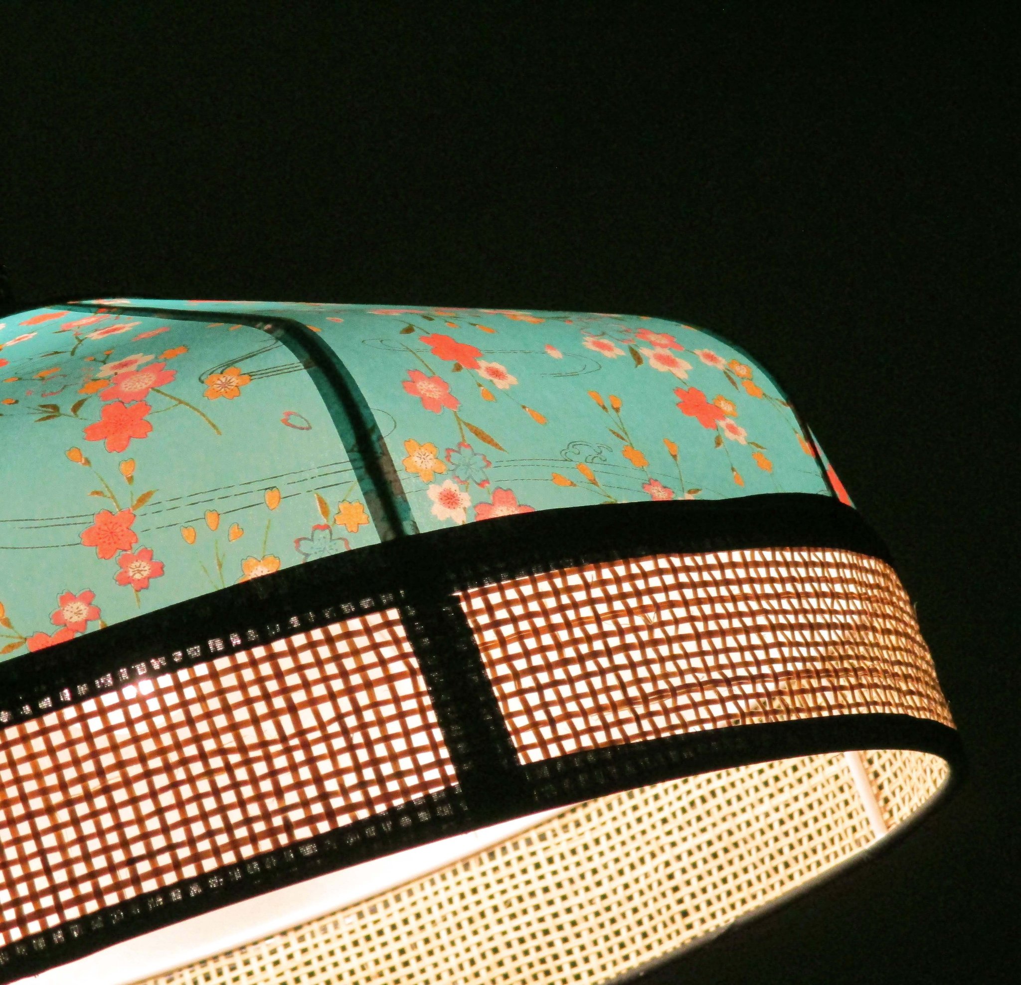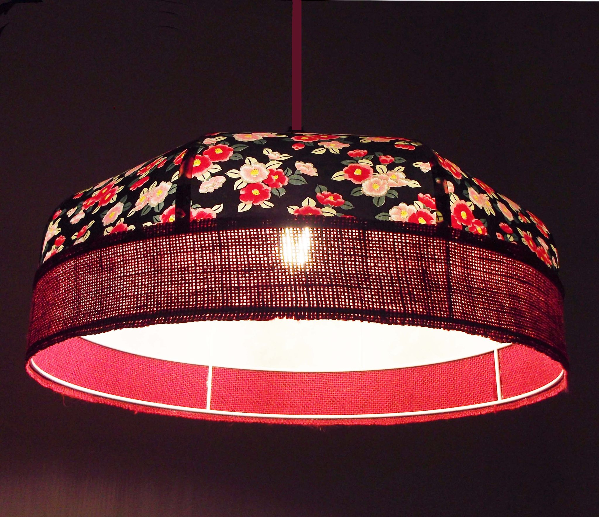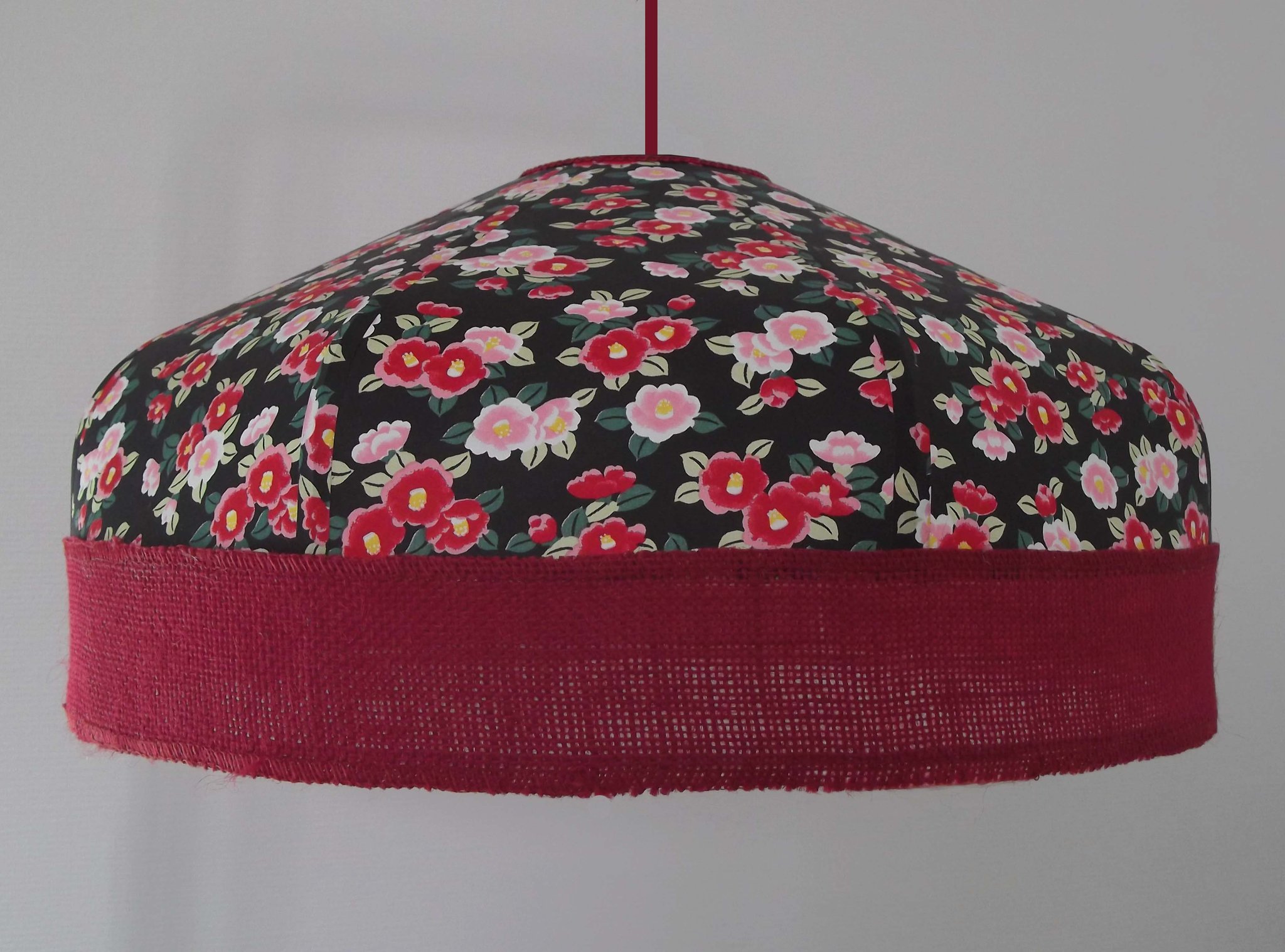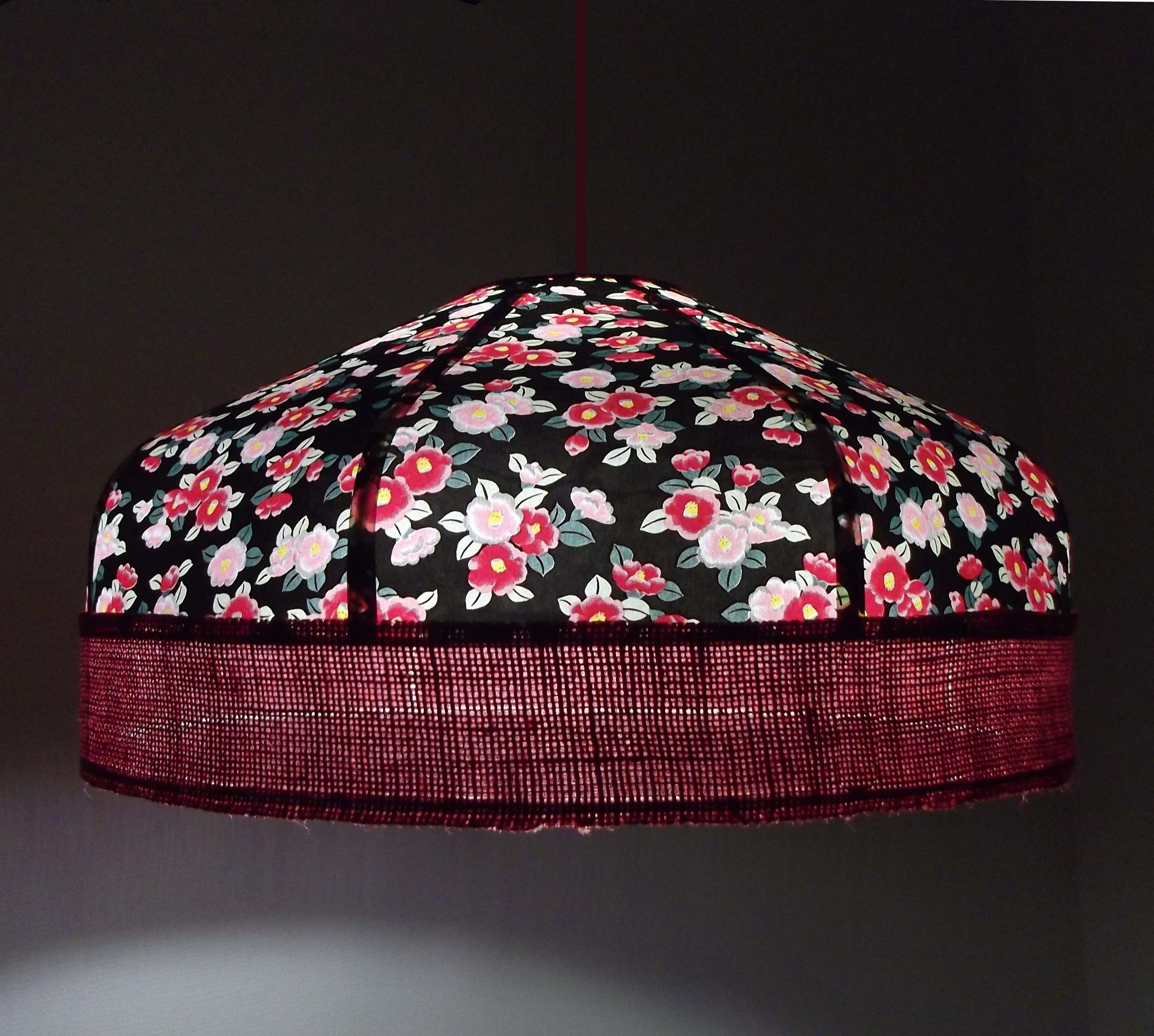 Suspension en papier japonais à fleurs sur fond noir et toile de jute rouge foncé.