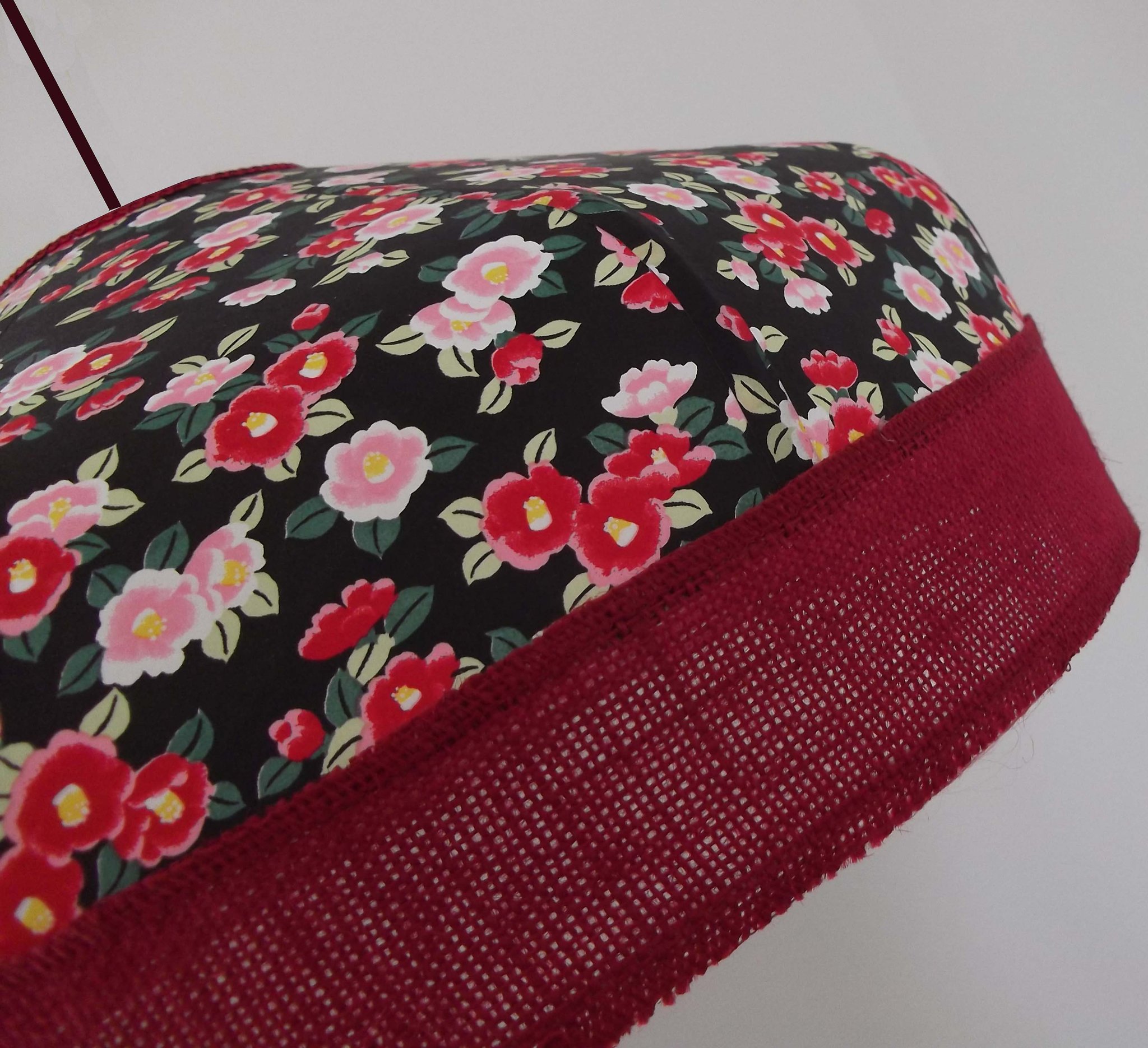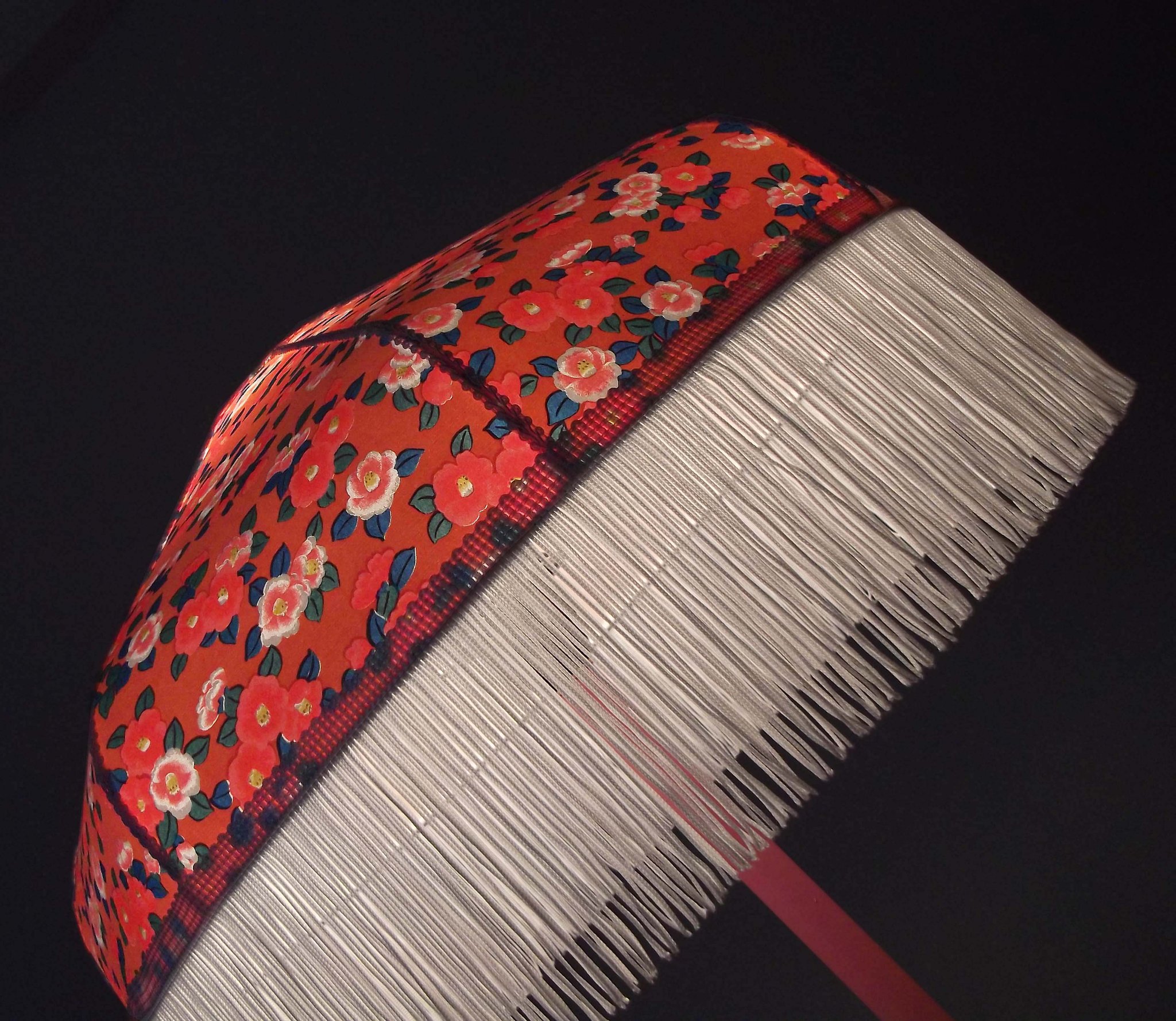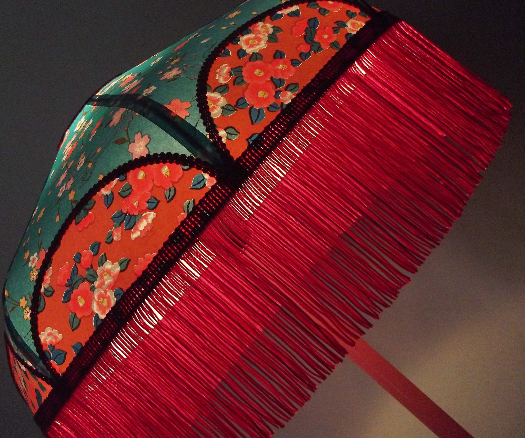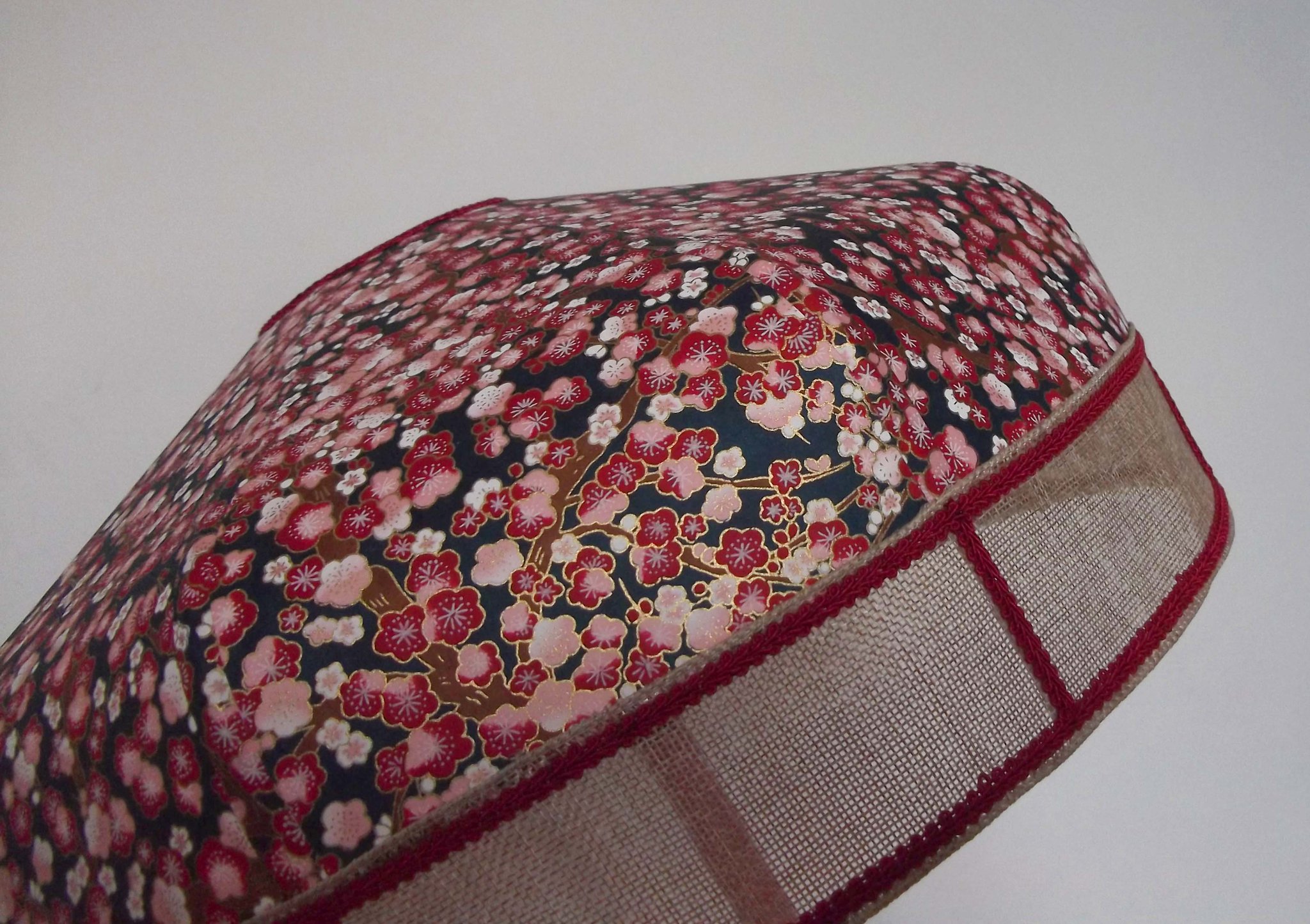 Suspension en papier japonais à fleurs sur fond noir et toile de jute rouge foncé.