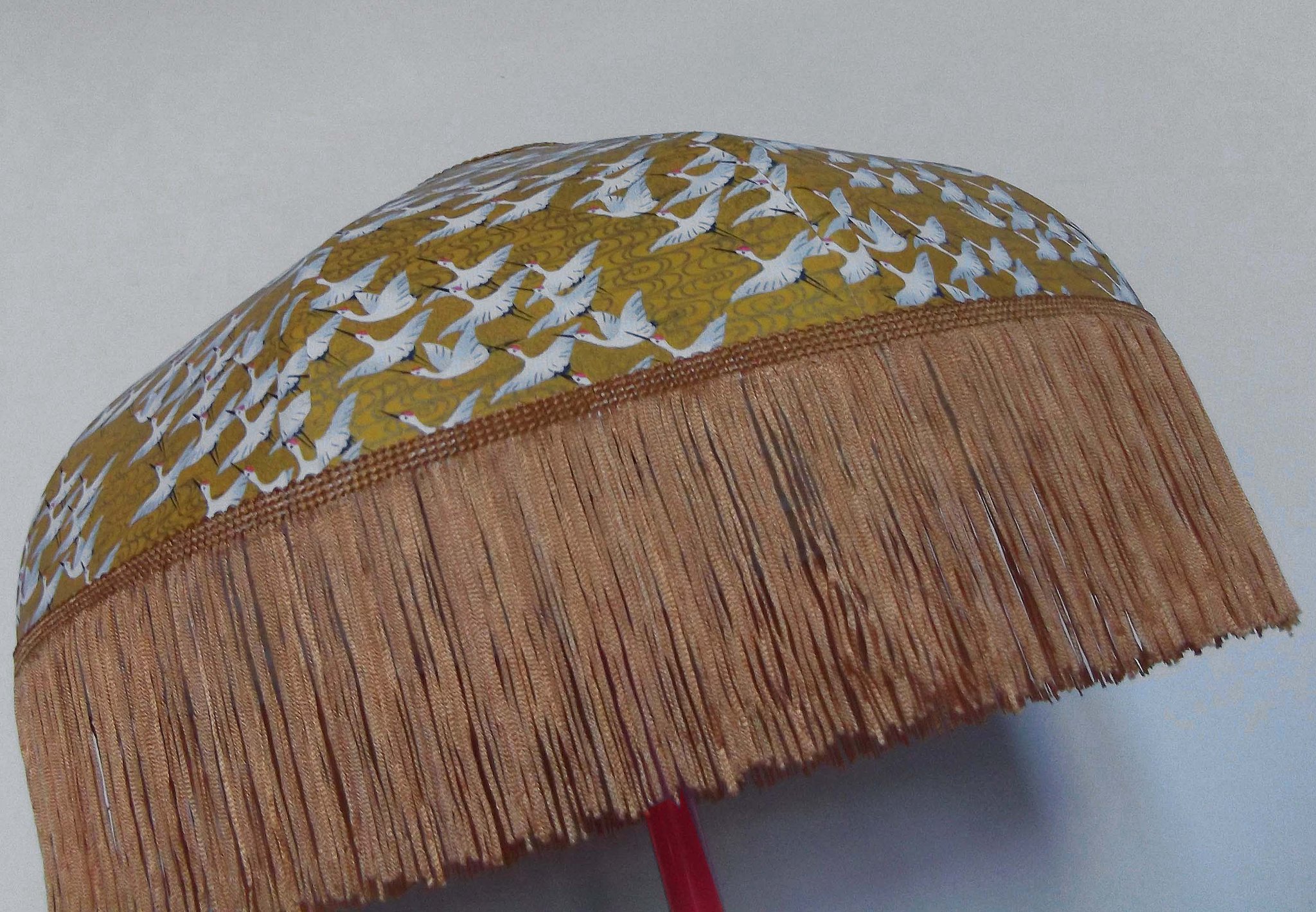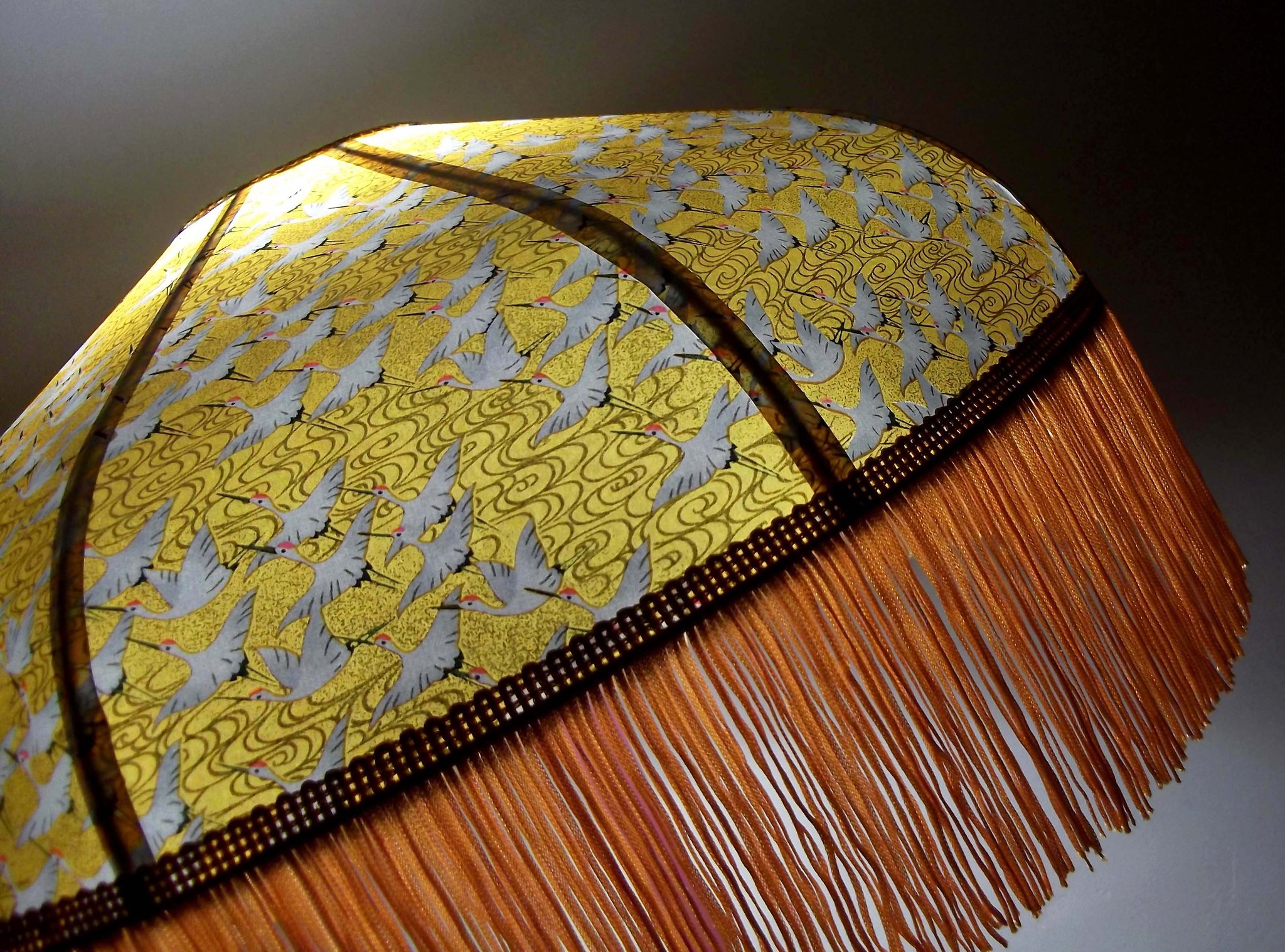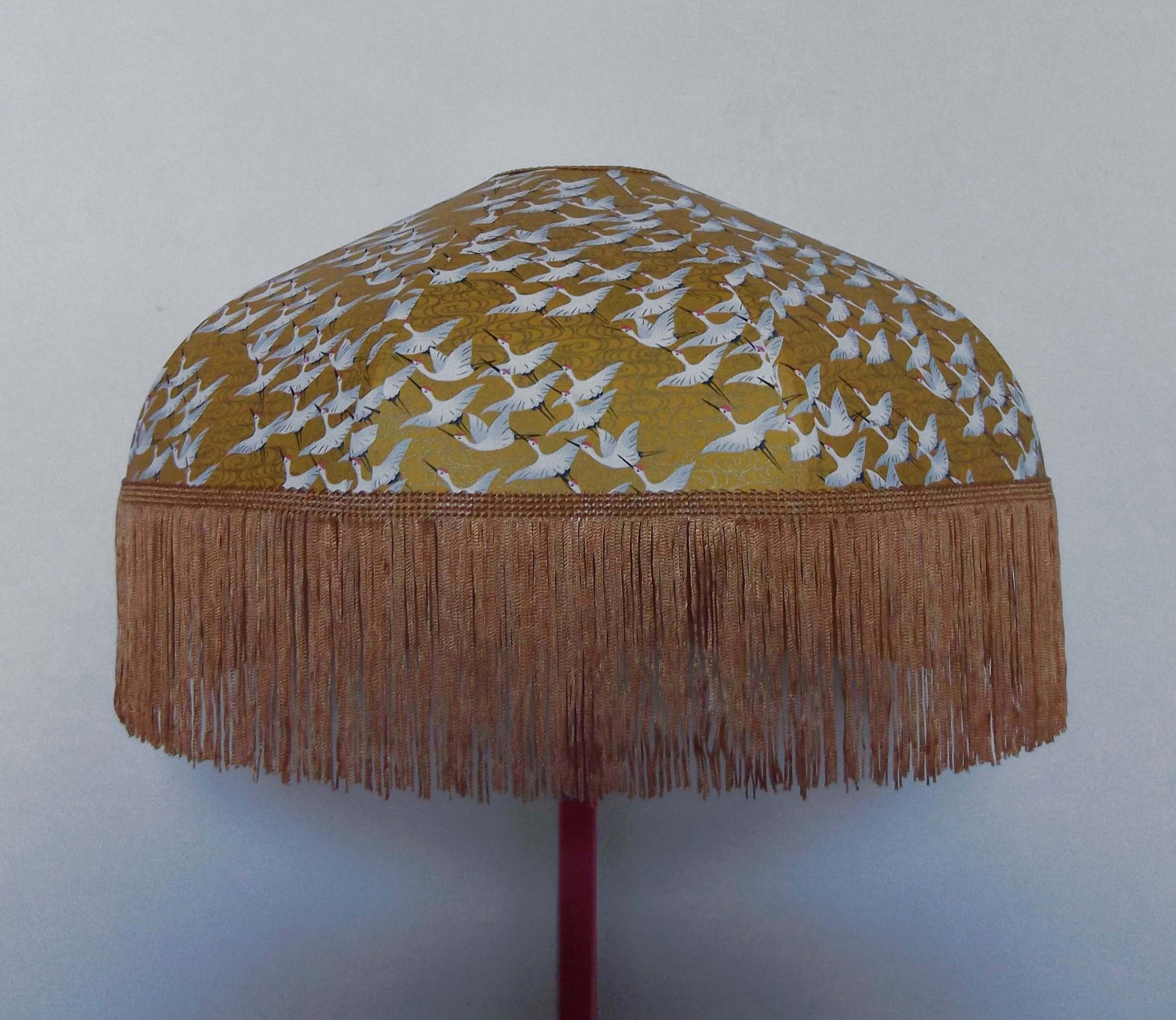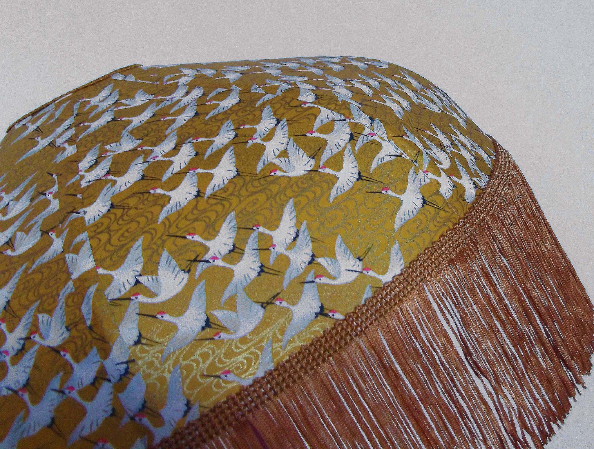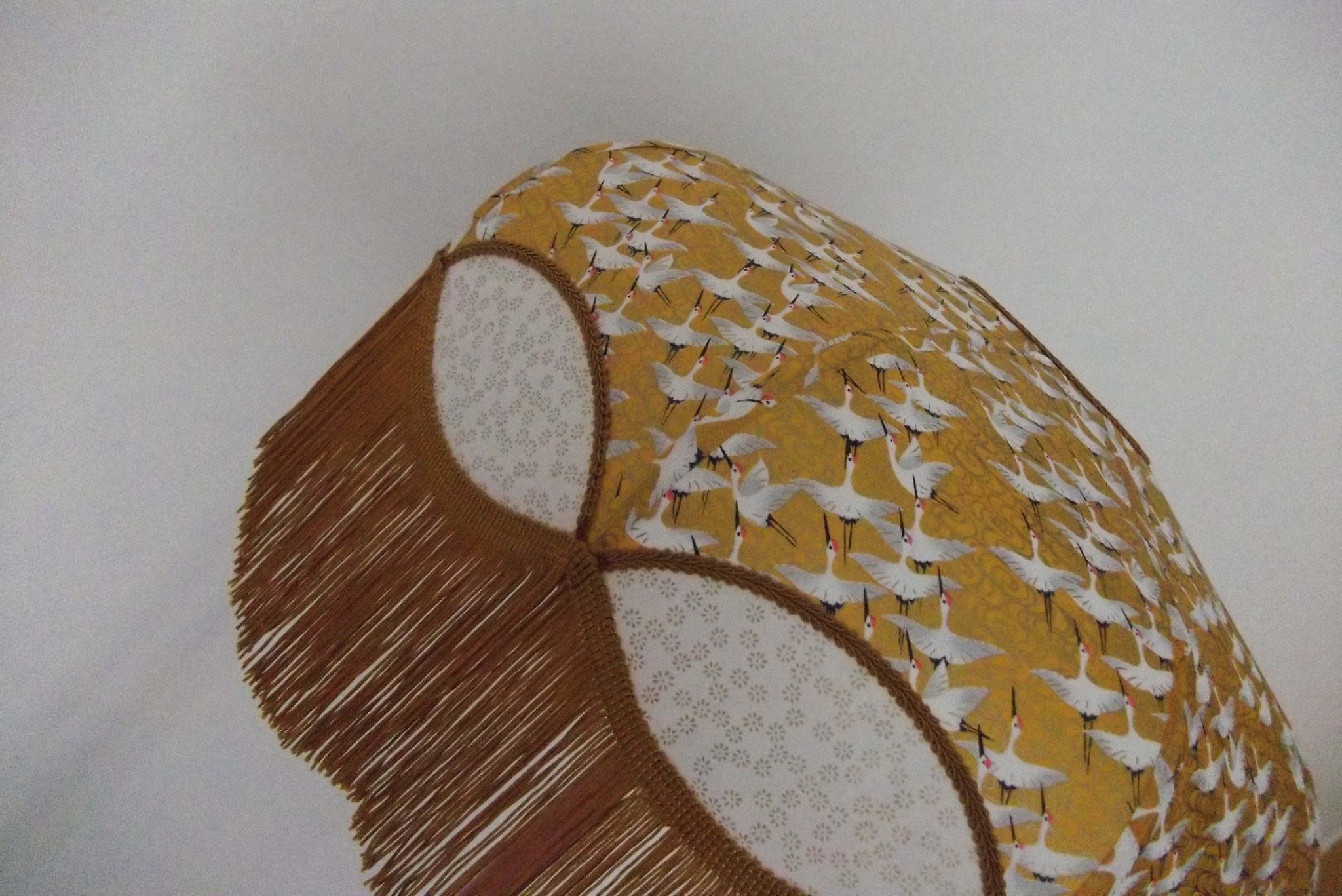 Abat-jour forme dôme, en papier japonais "grues" sur fond moutarde, frange dorée. Diamètre 40 cm, hauteur 14 cm + 10 cm de frange.