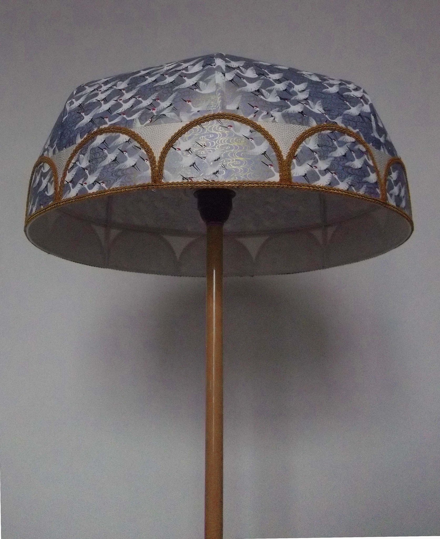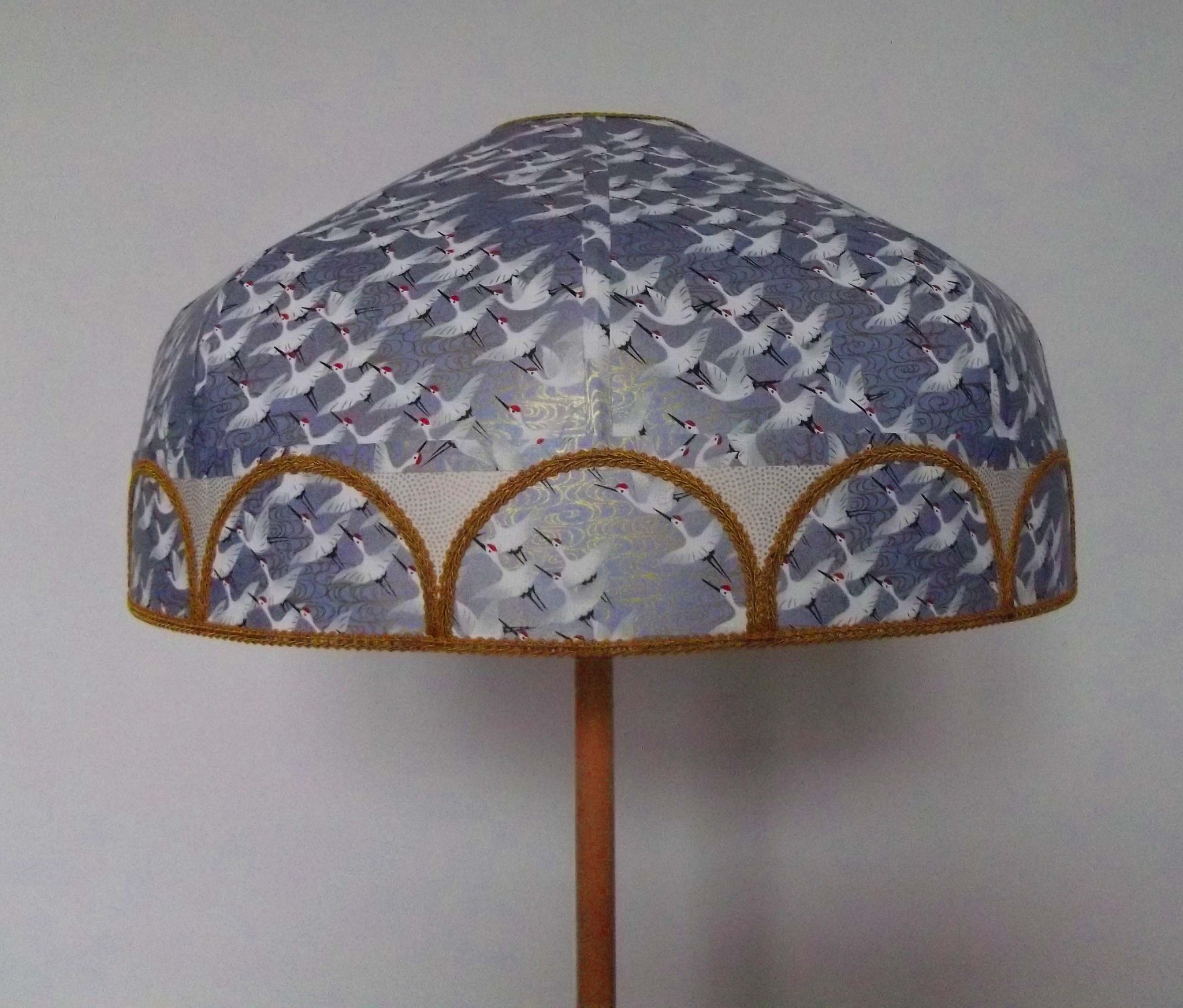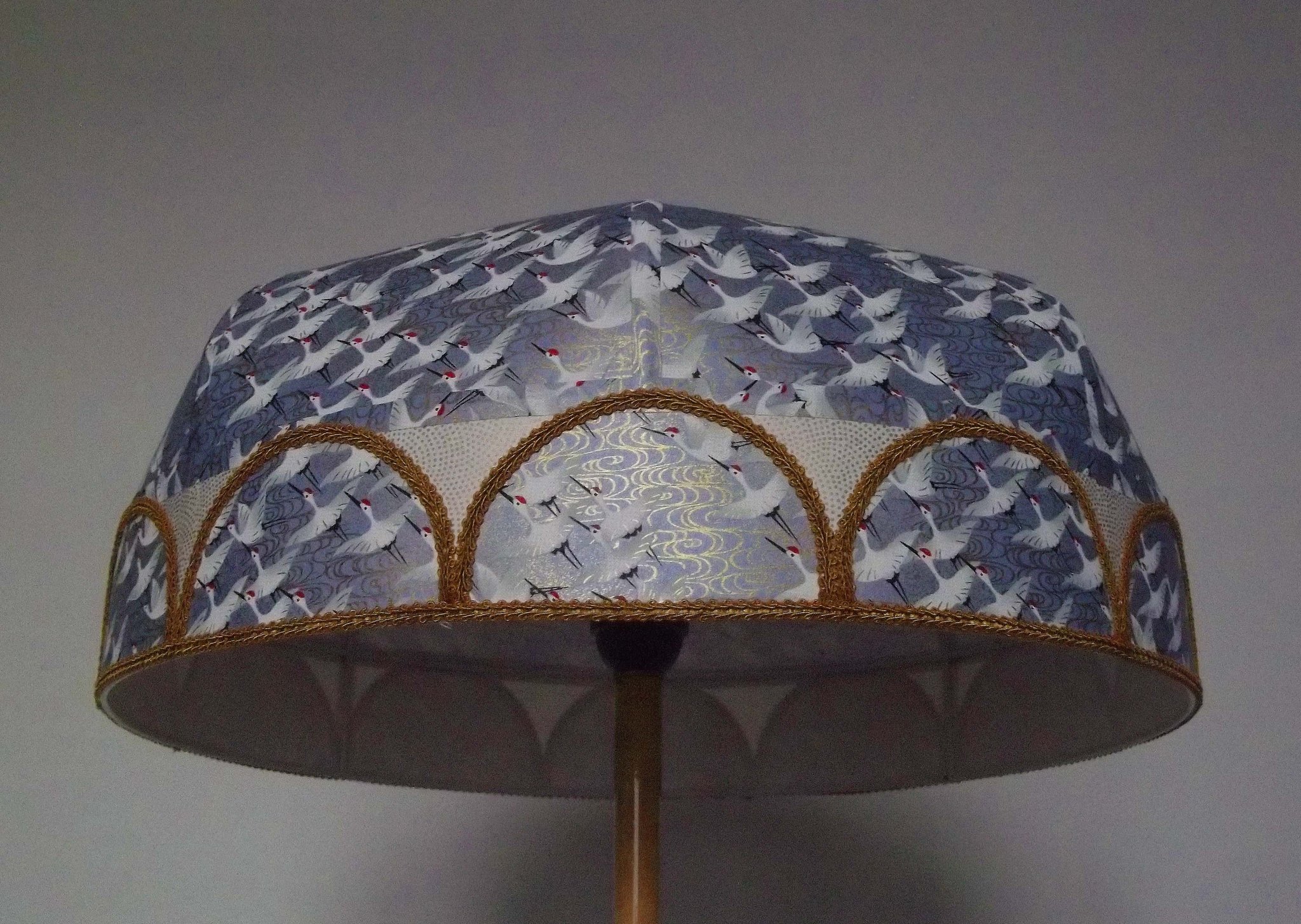 Abat-jour en papier japonais "grues" sur fond gris bleu en haut. En bas bande avec papier à petits pois dorés sur fond crème et demi cercles reprenant le motif du haut sur tout le tour de l'abat-jour. Galon doré. Diamètre 40 cm, hauteur 20 cm. Douille E27, 40 W max.