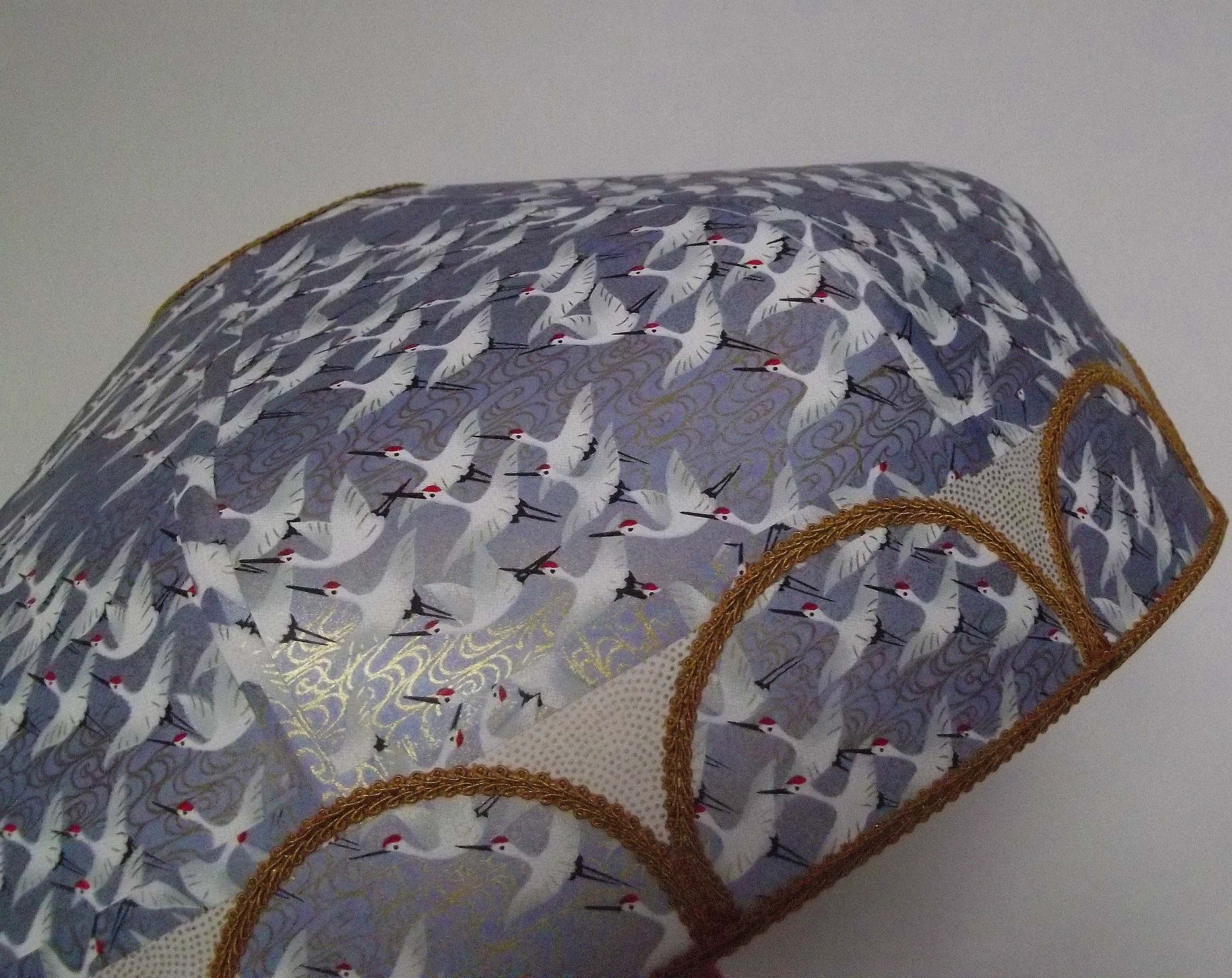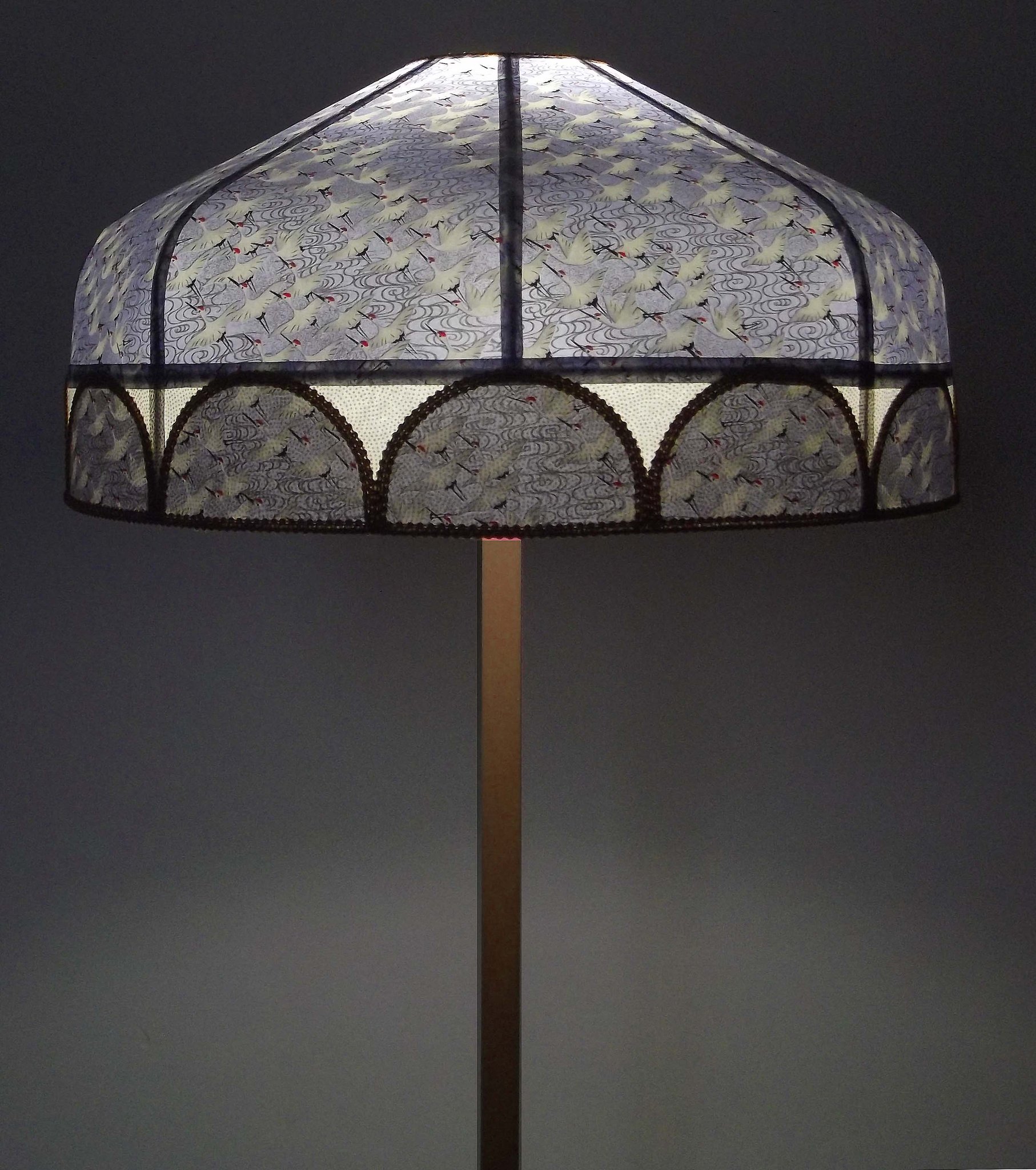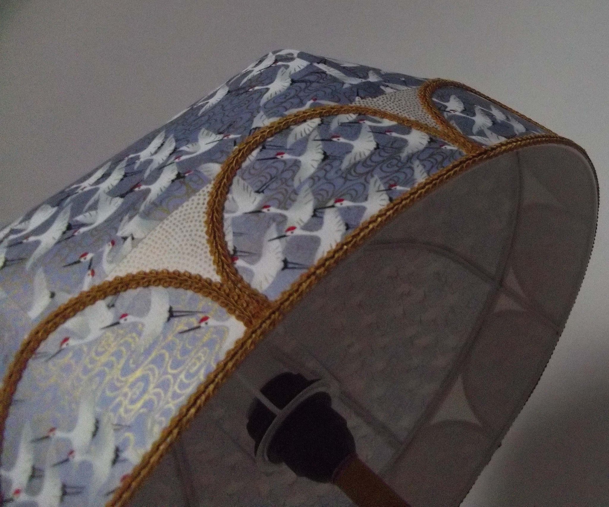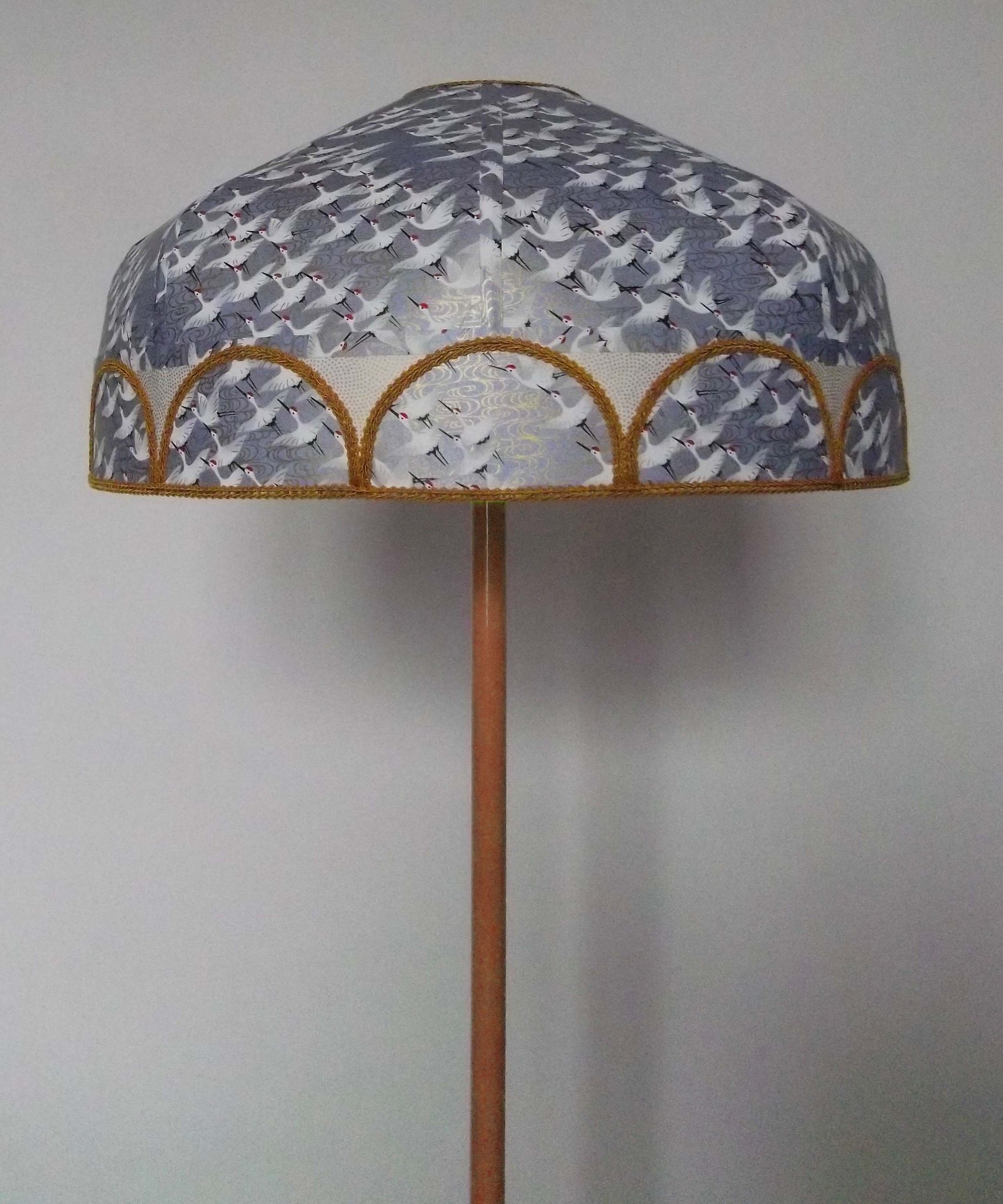 Abat-jour en papier japonais "grues" sur fond gris bleu en haut. En bas bande avec papier à petits pois dorés sur fond crème et demi cercles reprenant le motif du haut sur tout le tour de l'abat-jour. Galon doré. Diamètre 40 cm, hauteur 20 cm. Douille E27, 40 W max.
