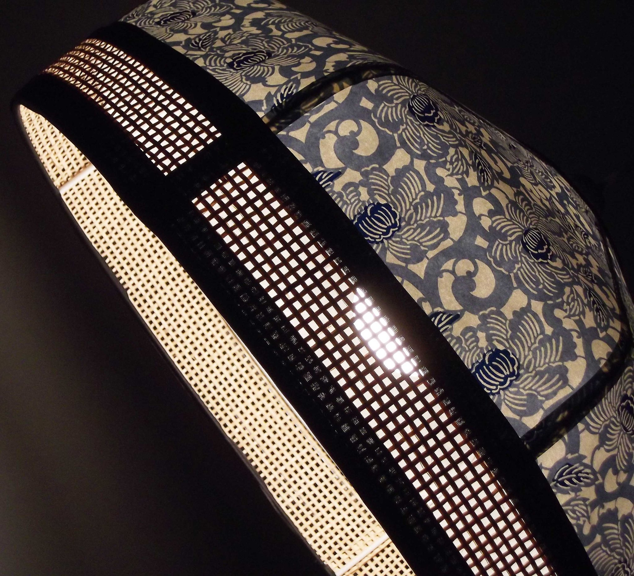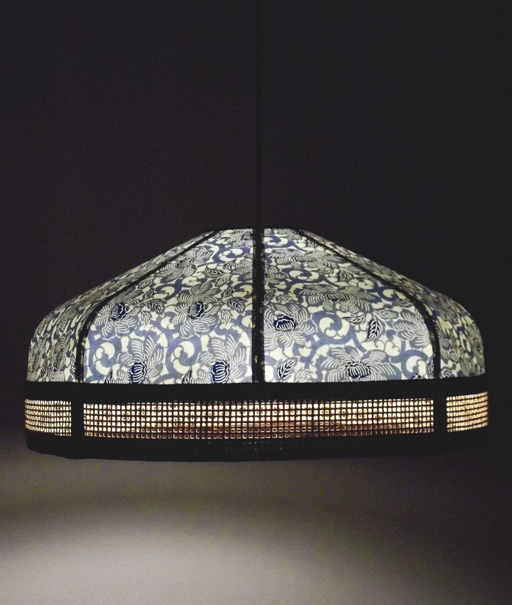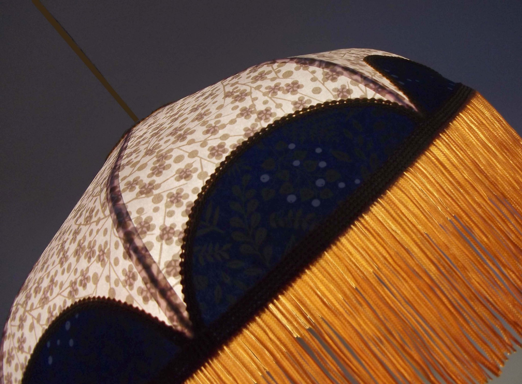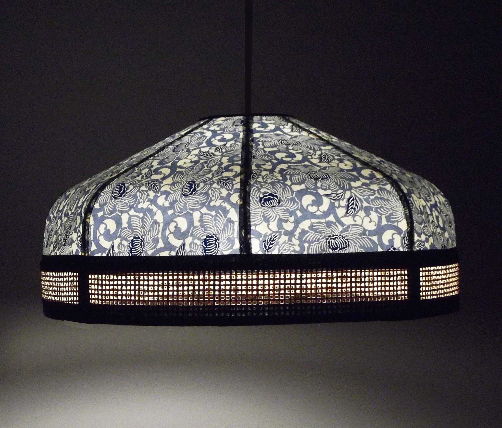 Abat-jour en papier japonais à fleurs sur fond bleu marine et toile de jute.
