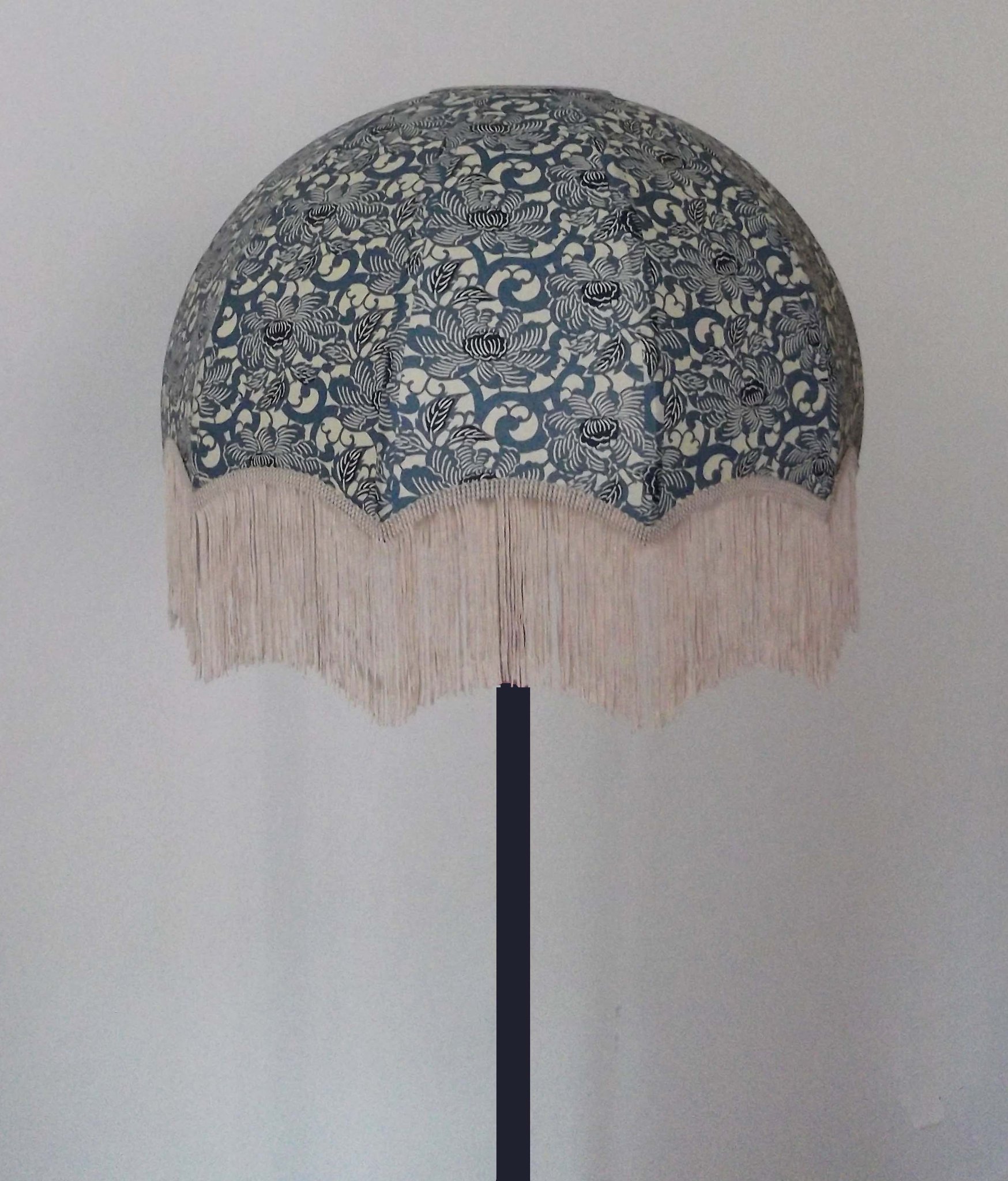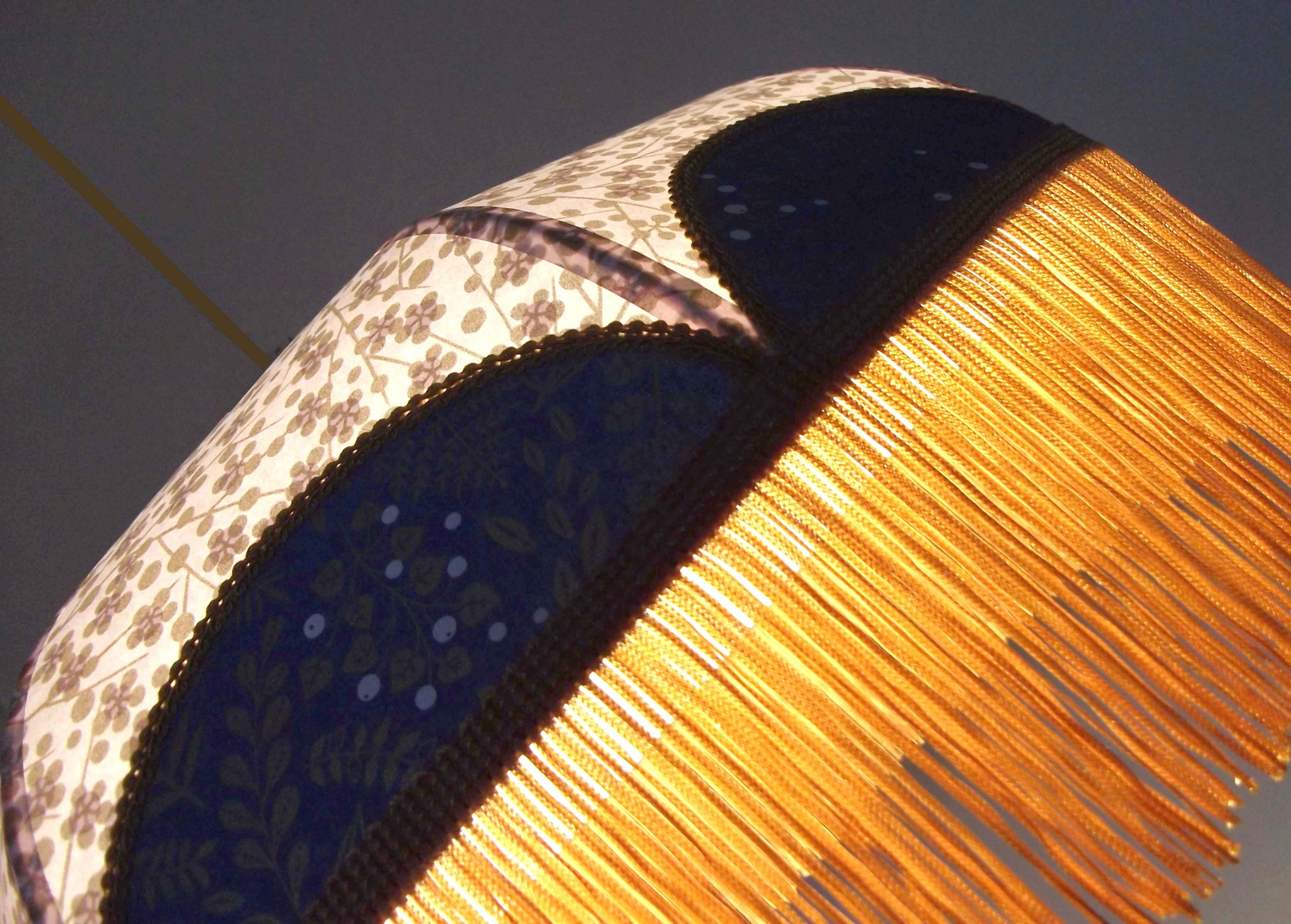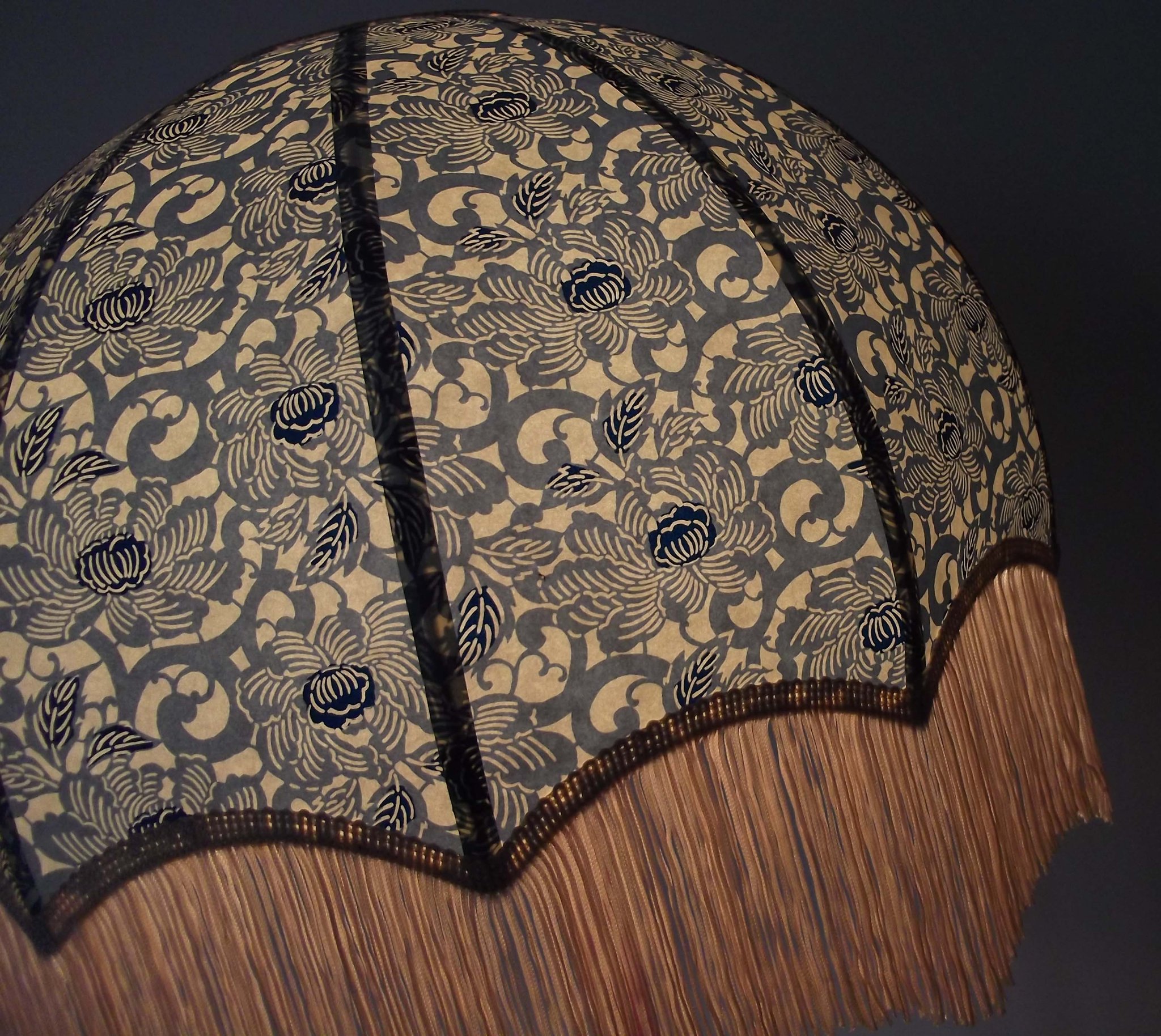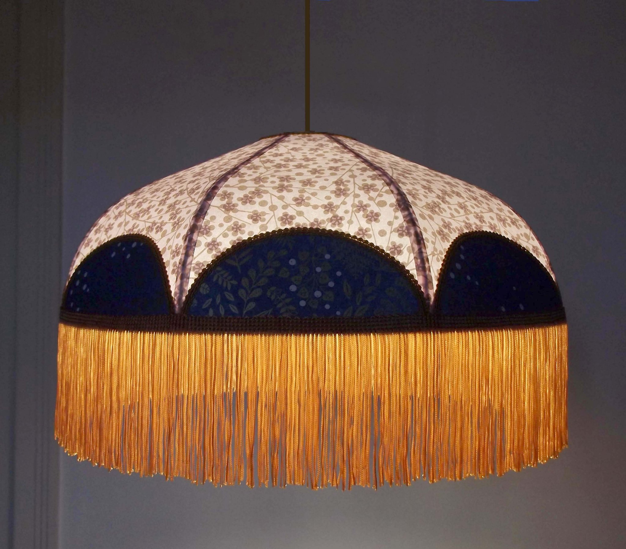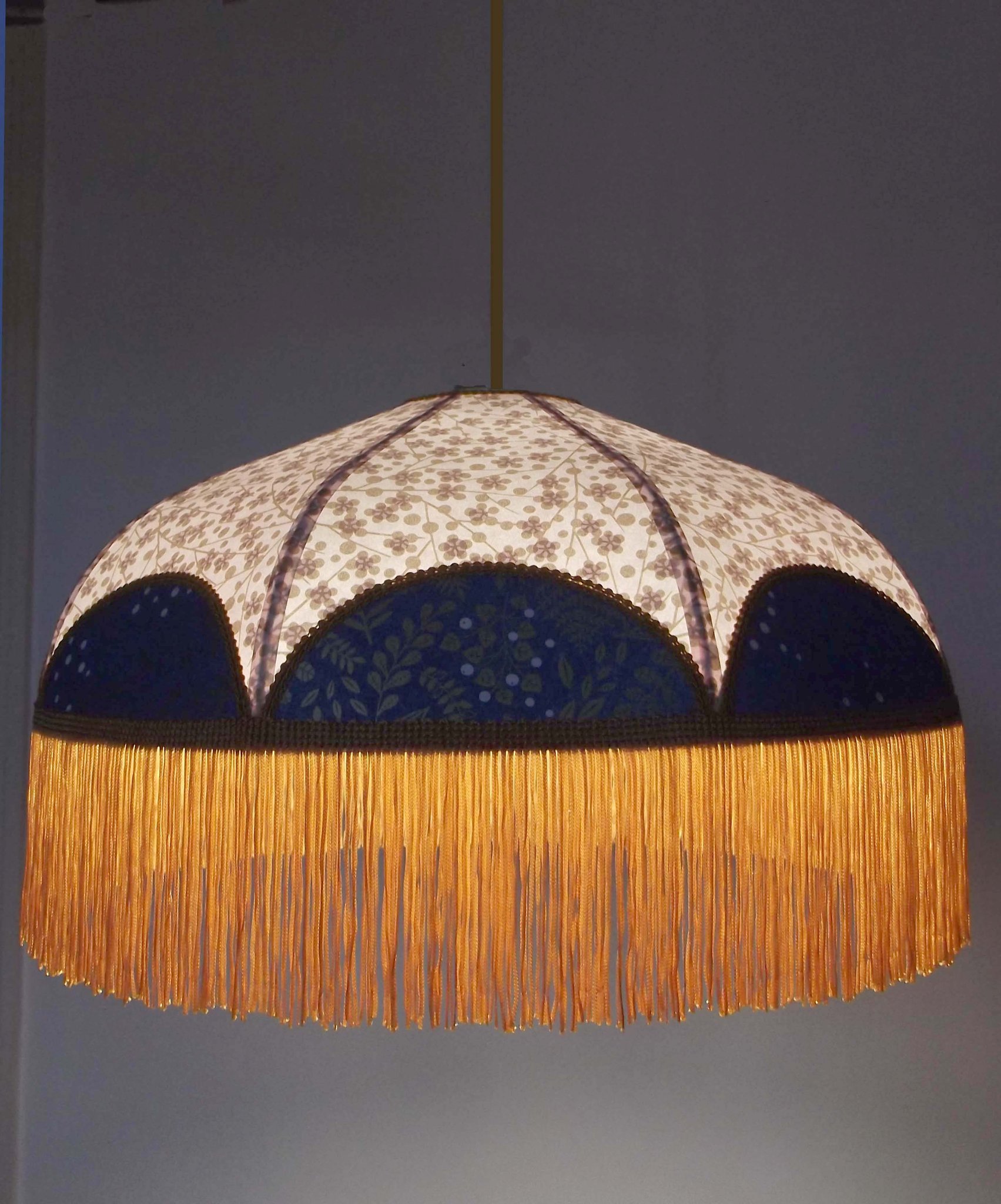 Abat-jour en papier japonais à fleurs sur fond bleu marine et toile de jute.