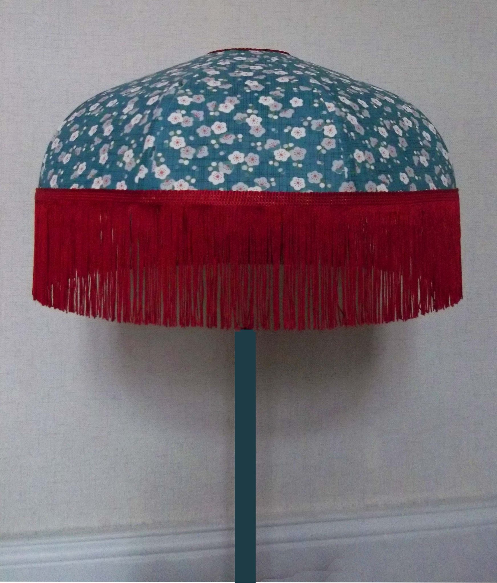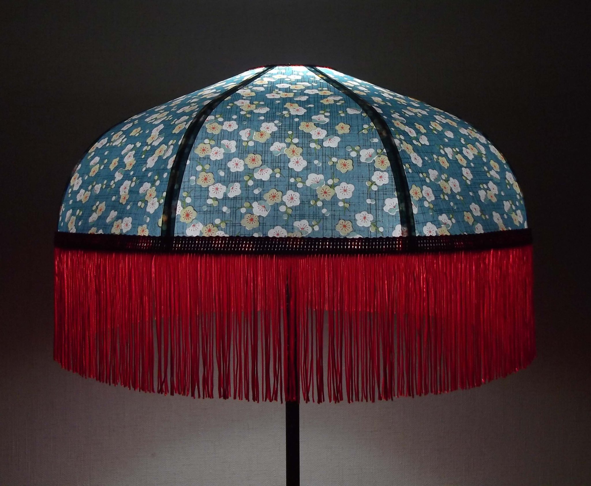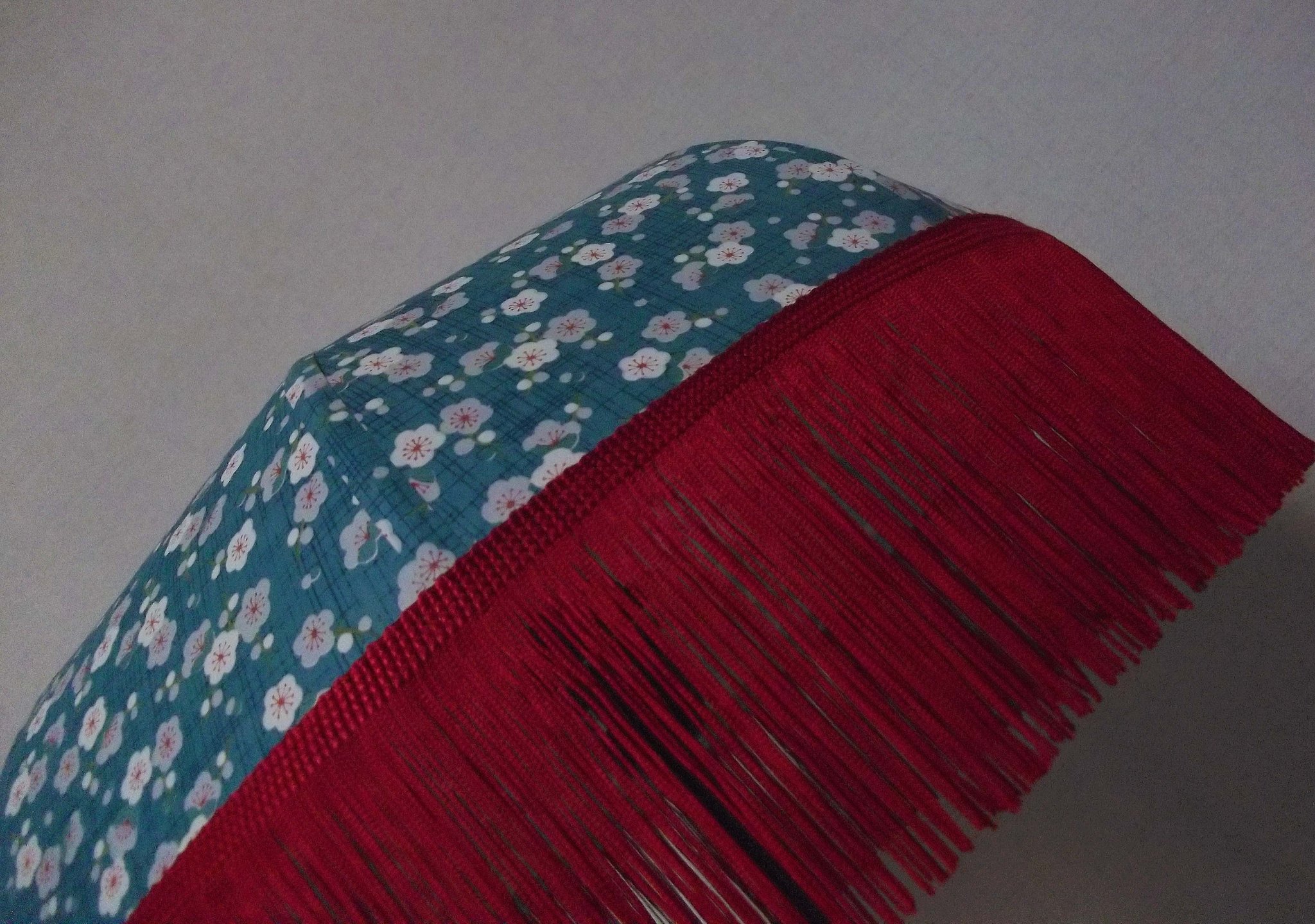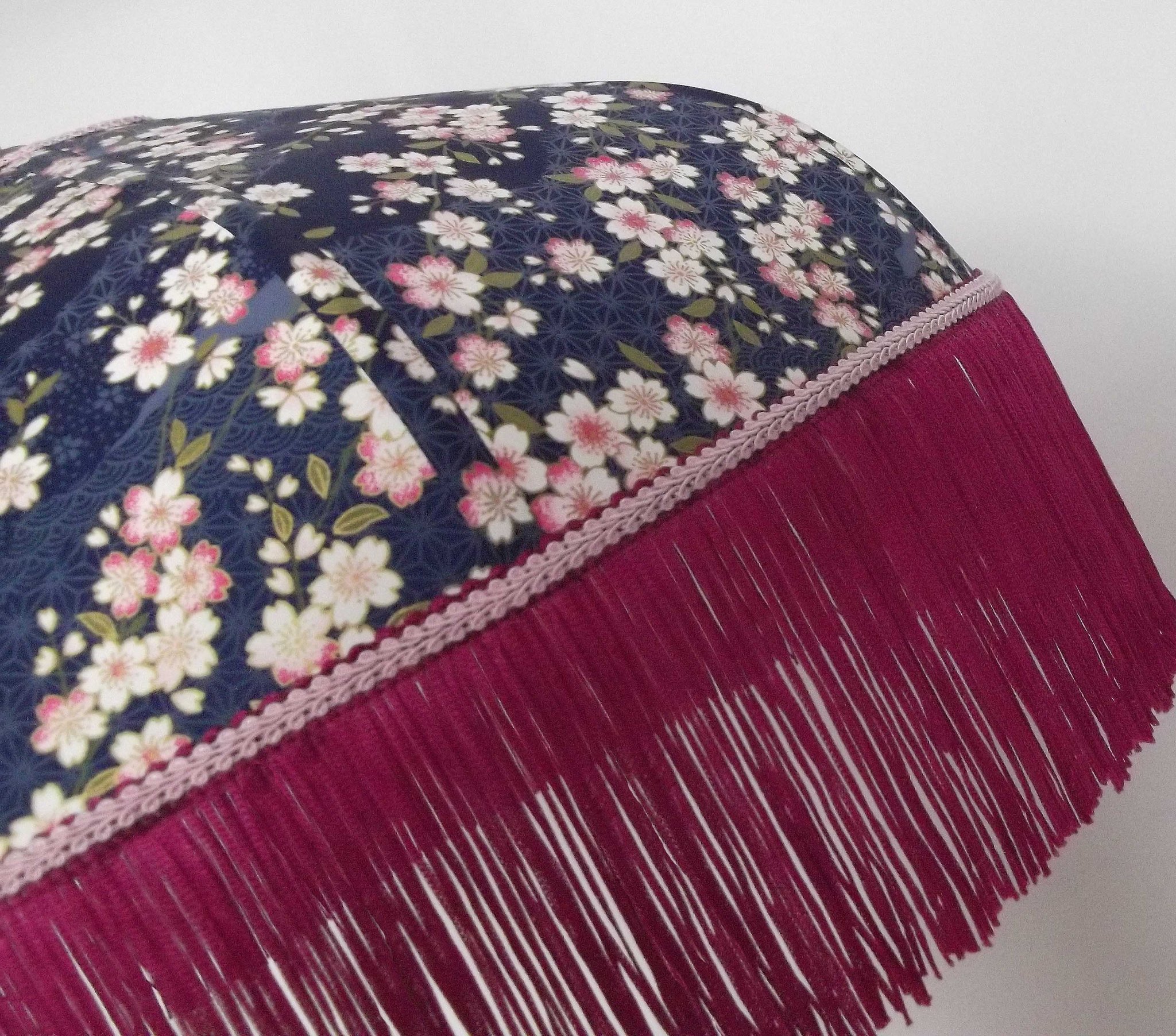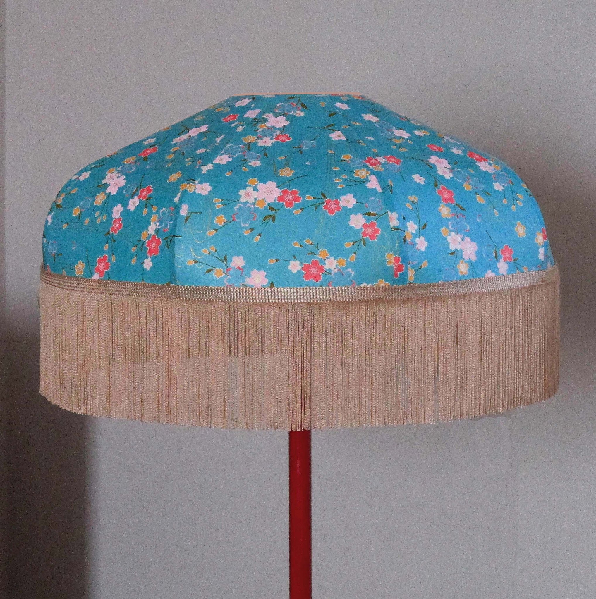 Abat-jour 40 cm de diamètre. Papier japonais fleurs de prunier sur fond bleu. Frange rouge. Hauteur 14 cm + 10 cm de frange. Douille E27, 40 w max.