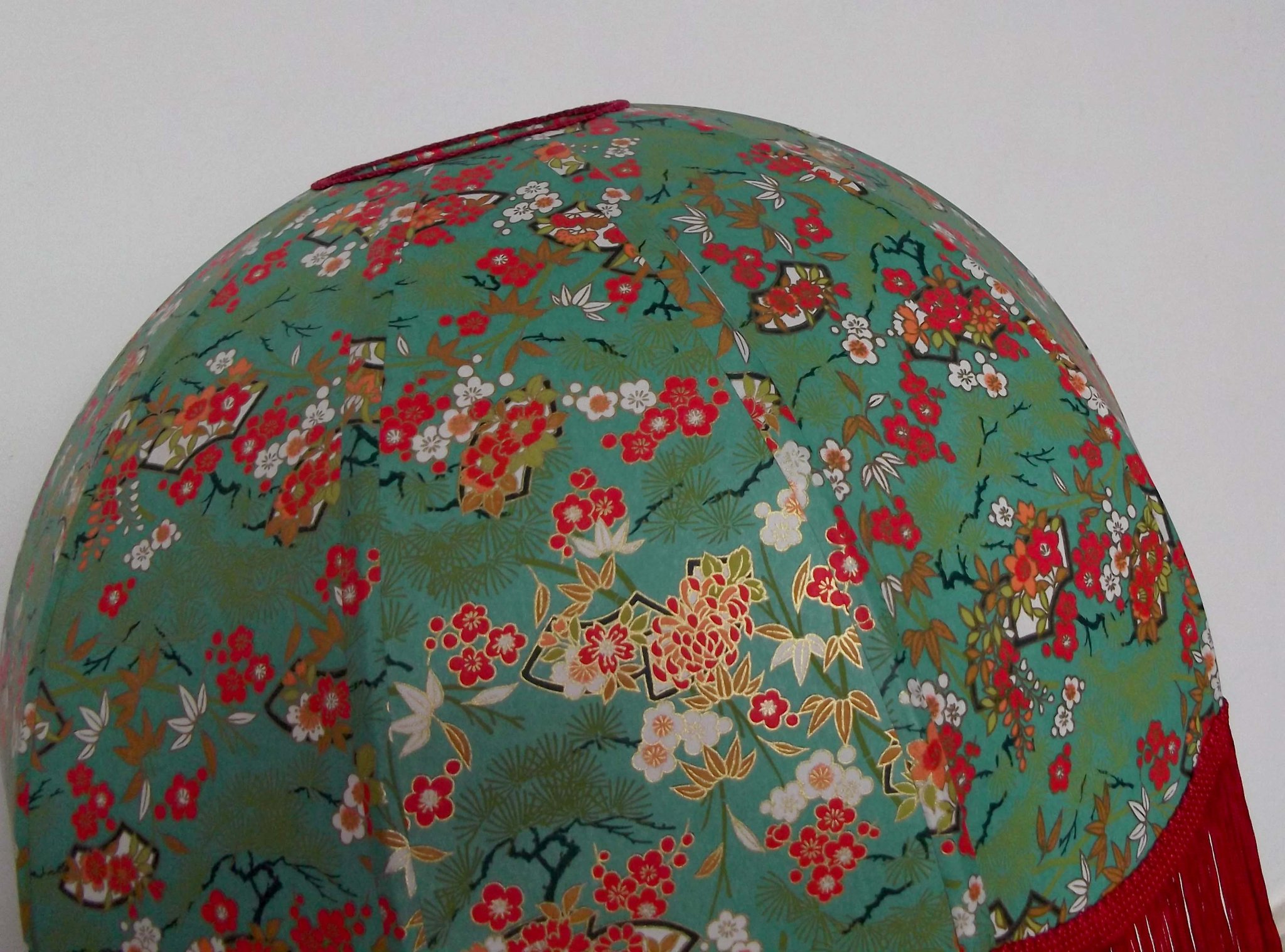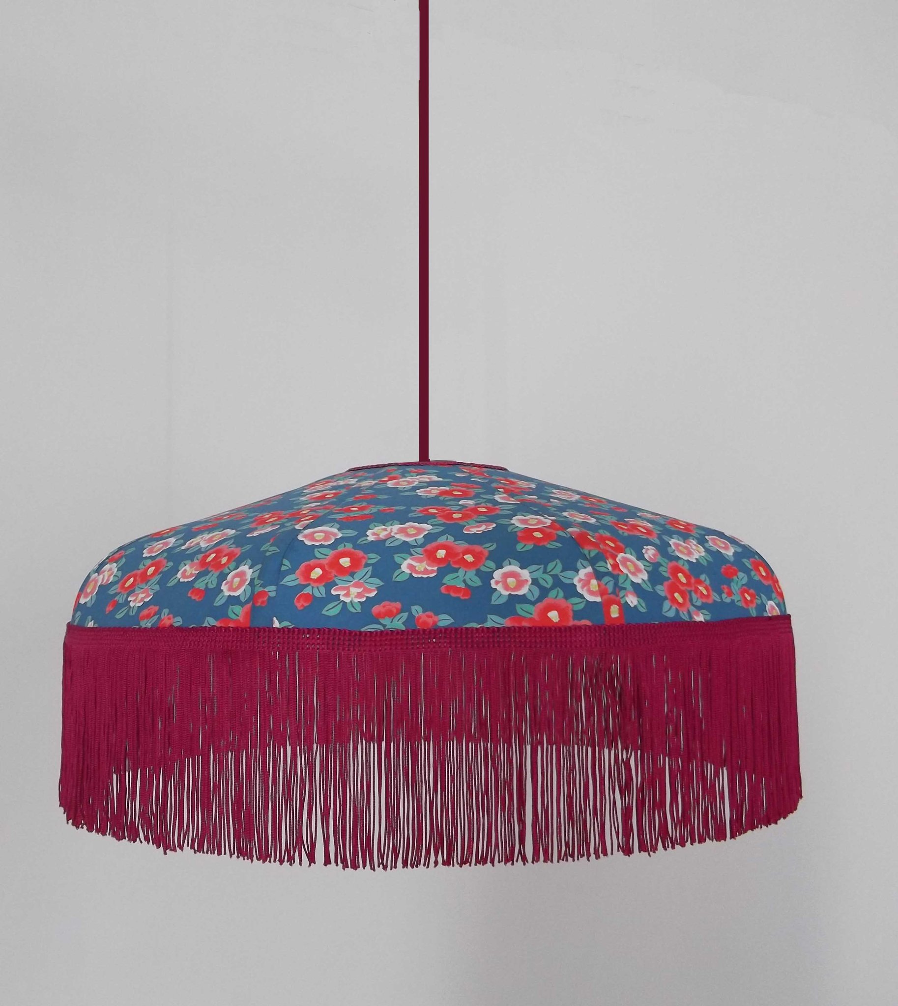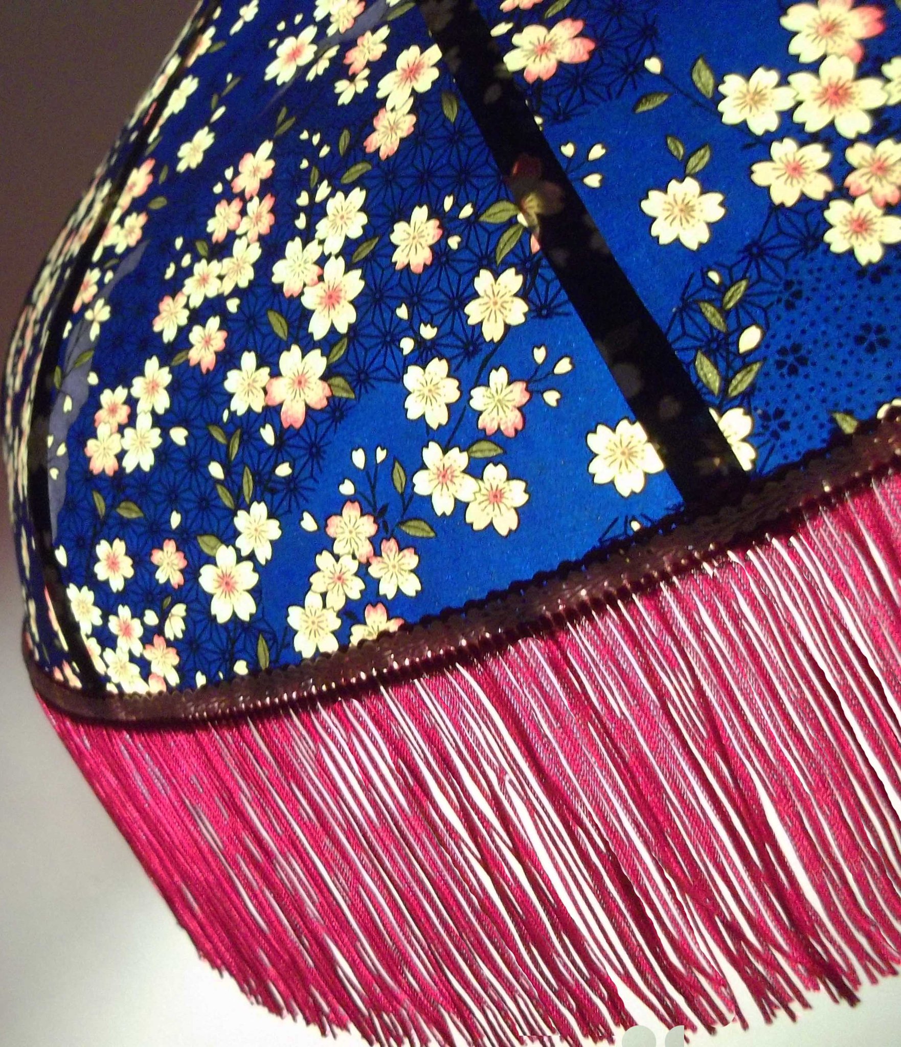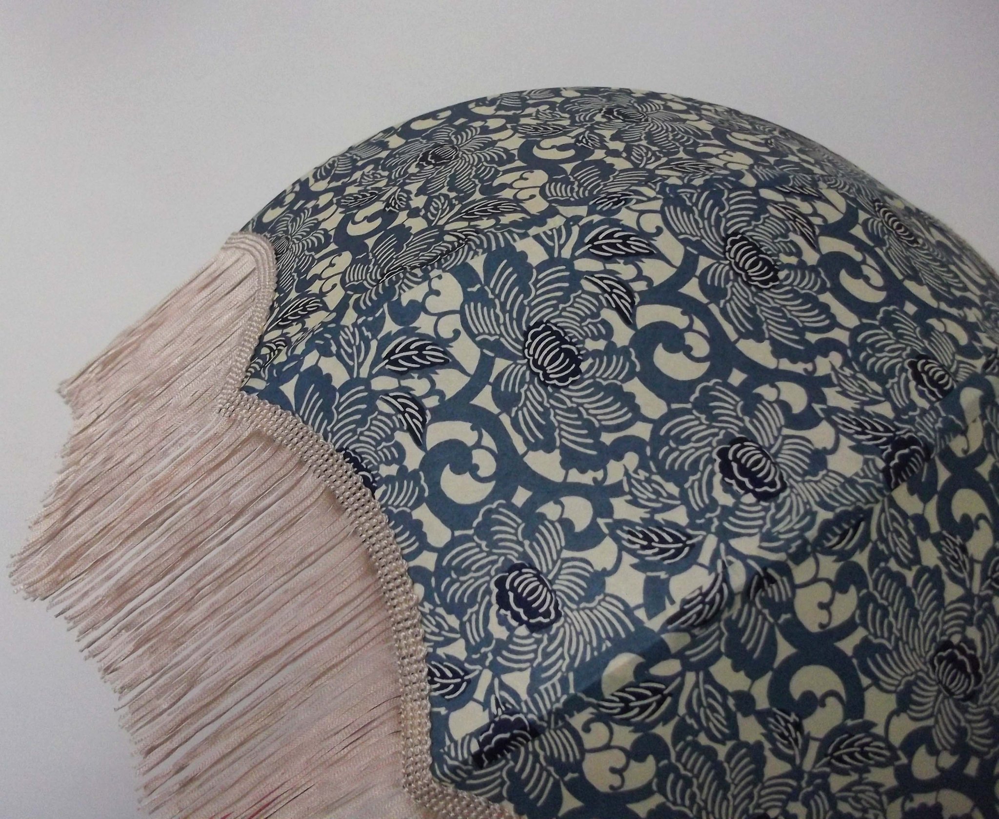 Abat-jour 40 cm de diamètre. Papier japonais fleurs de prunier sur fond bleu. Frange rouge. Hauteur 14 cm + 10 cm de frange. Douille E27, 40 w max.