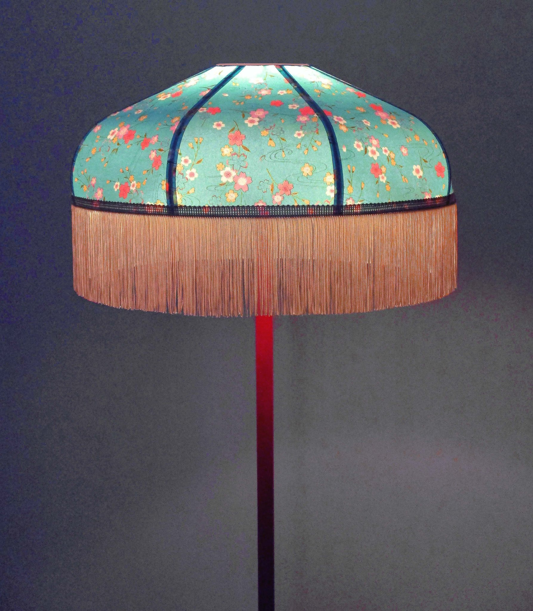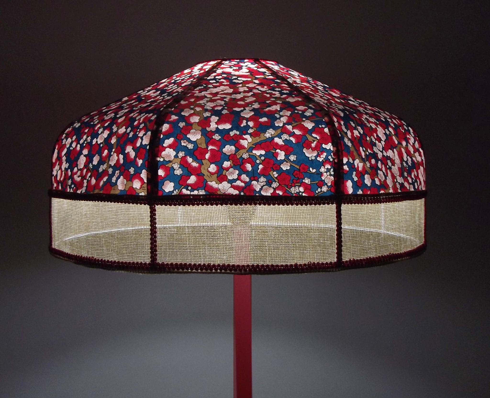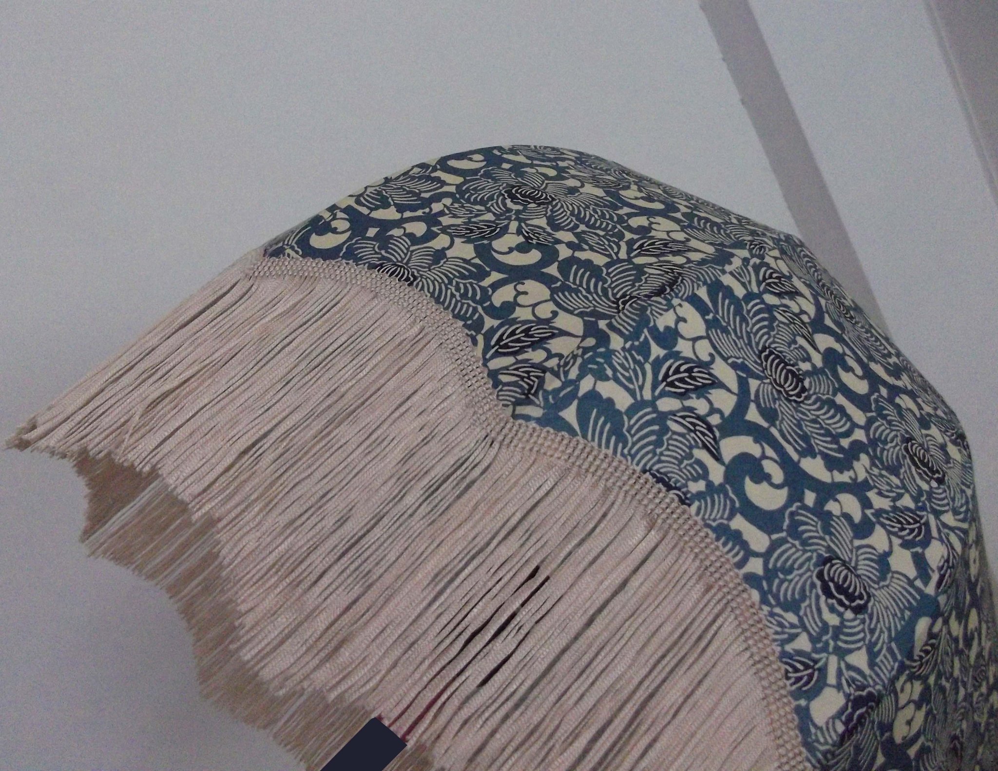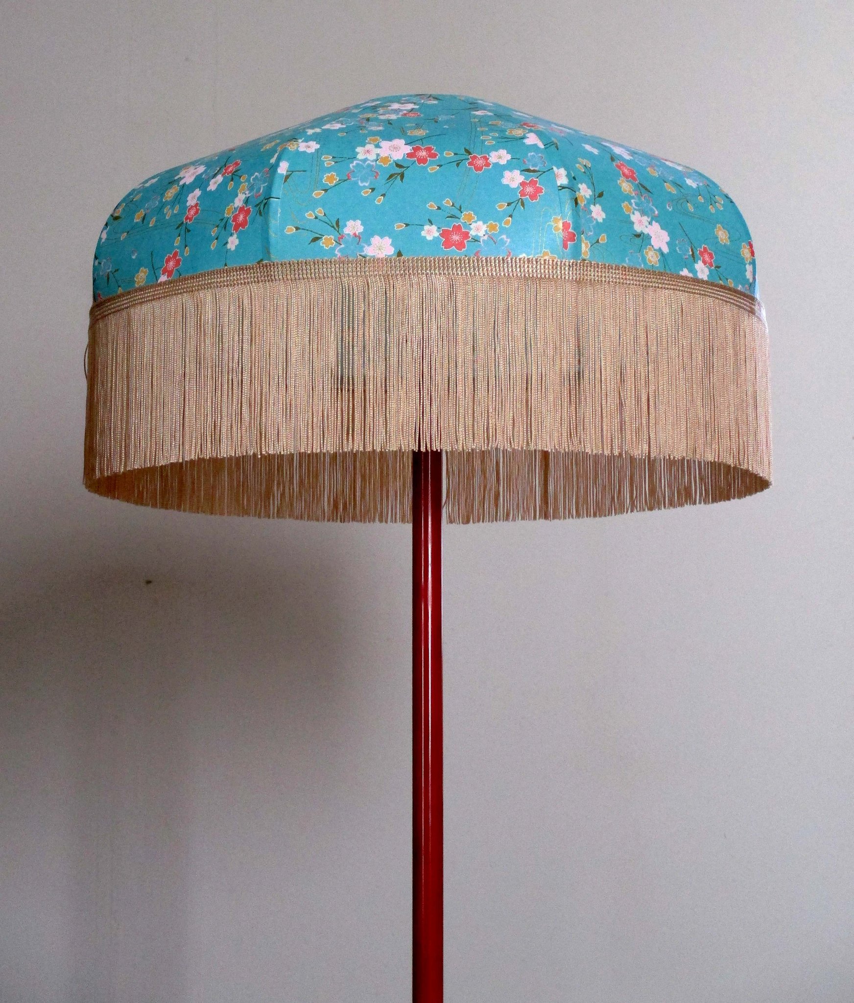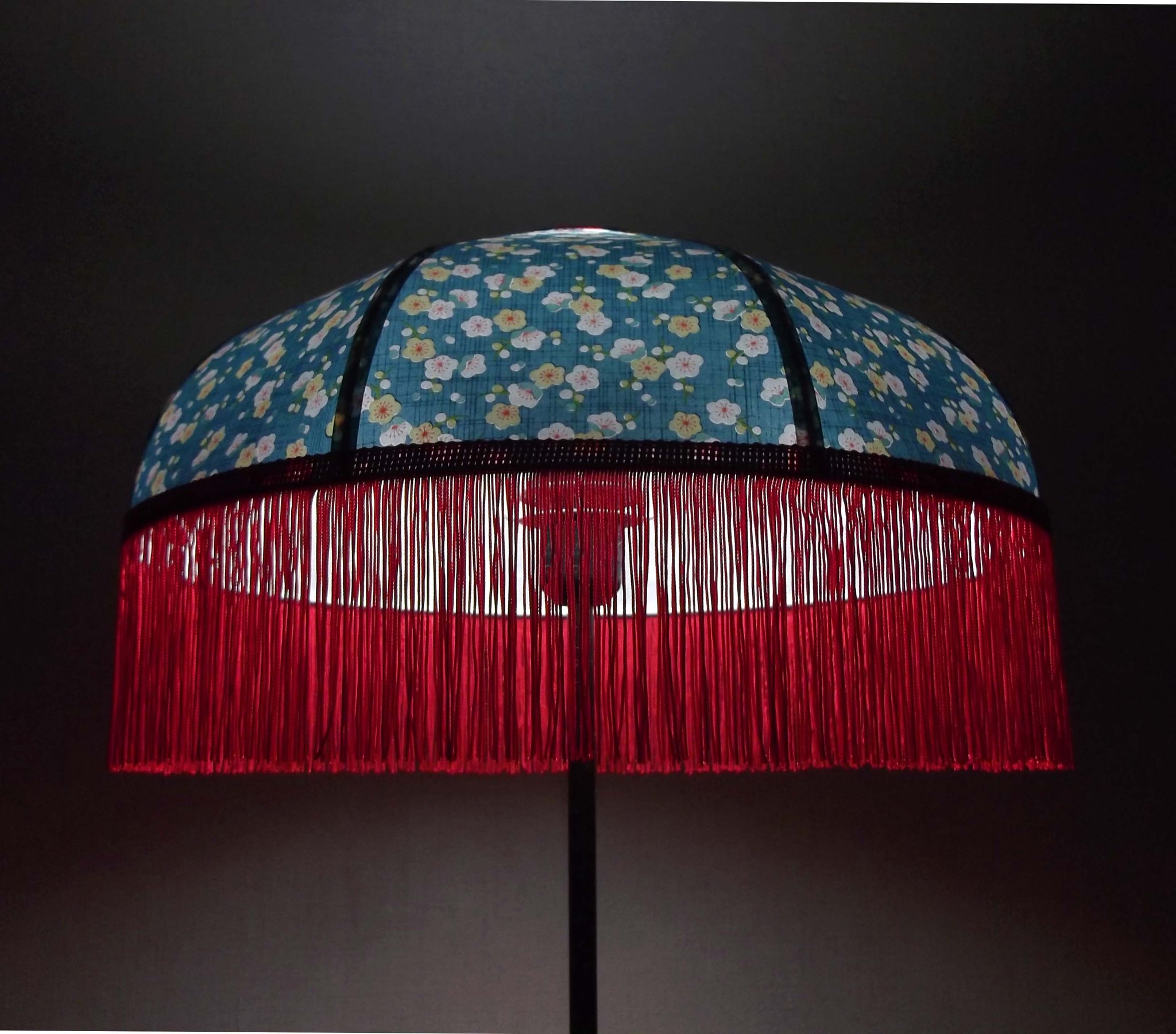 Abat-jour 40 cm de diamètre. Papier japonais fleurs de prunier sur fond bleu. Frange rouge. Hauteur 14 cm + 10 cm de frange. Douille E27, 40 w max.