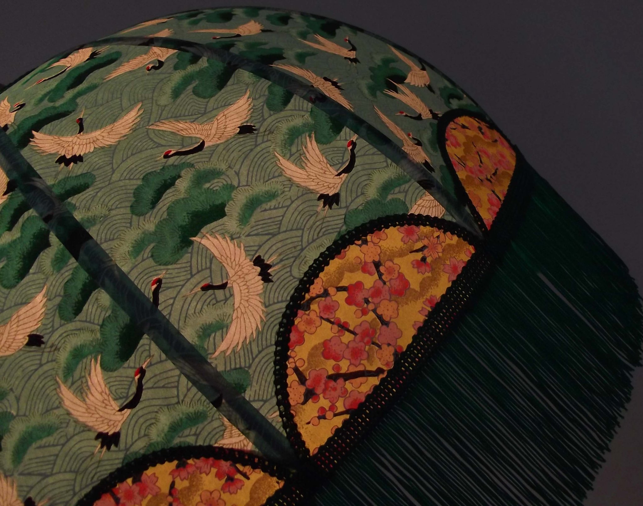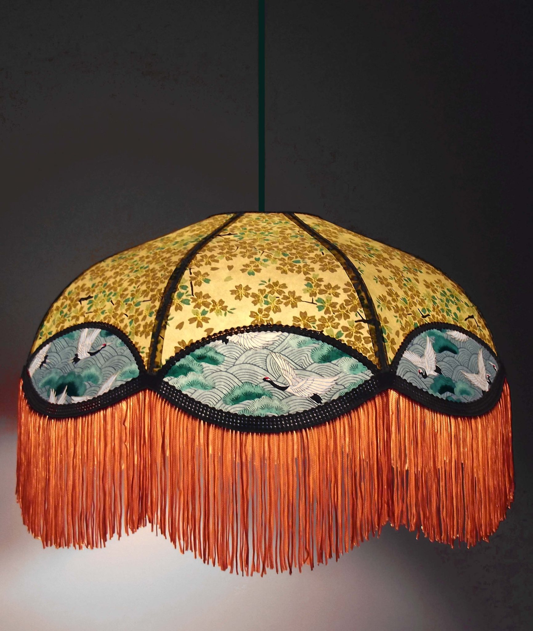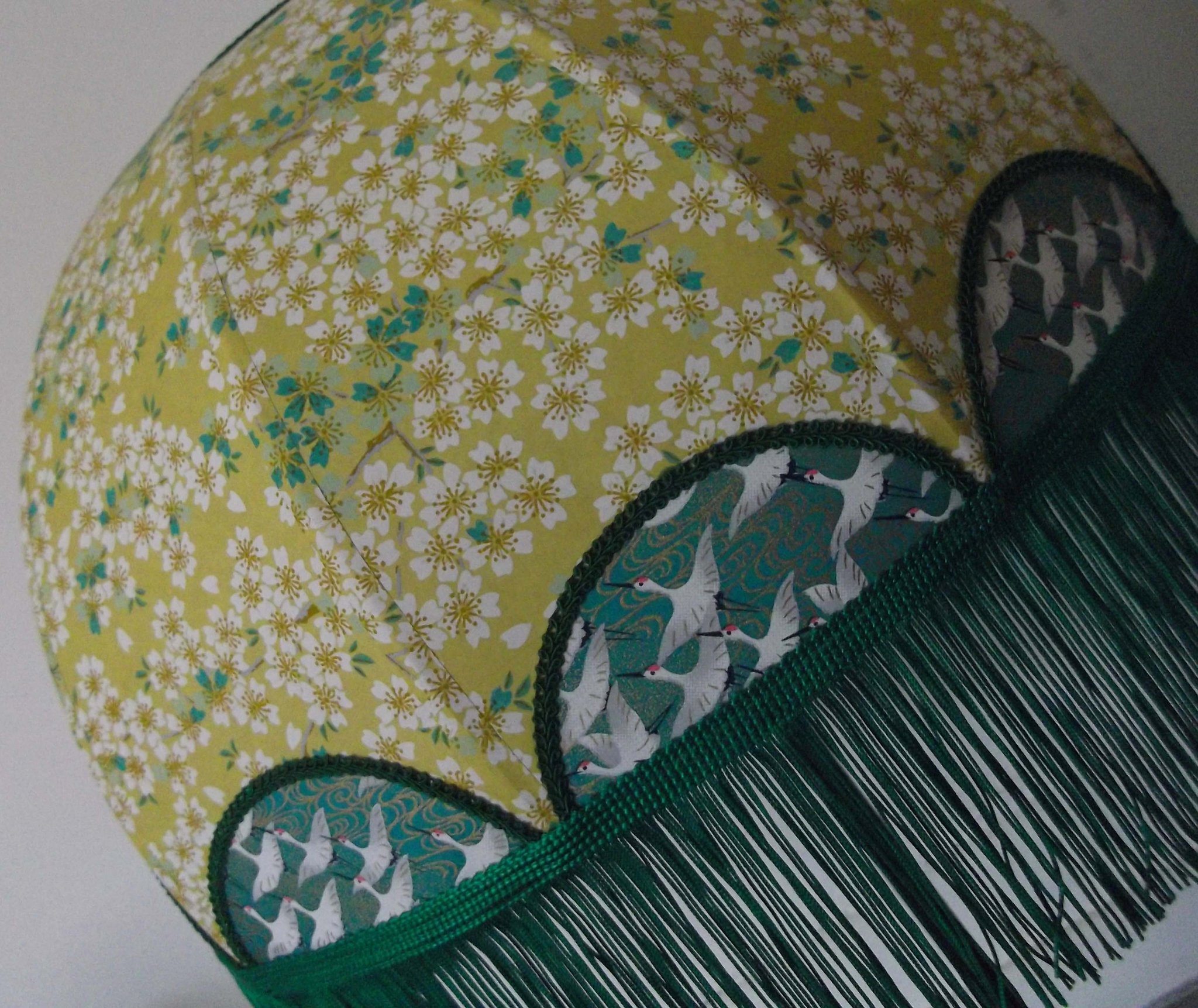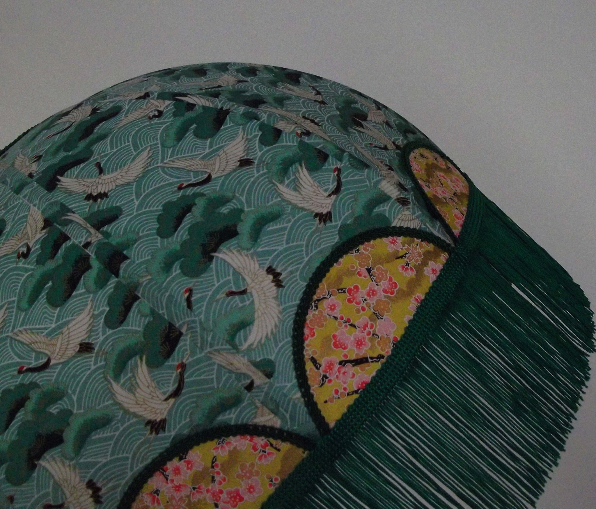 Suspension 40 cm de diamètre. Papier japonais "grues" sur fond vert en haut et grues sur fond moutarde en bas. Frange verte.
