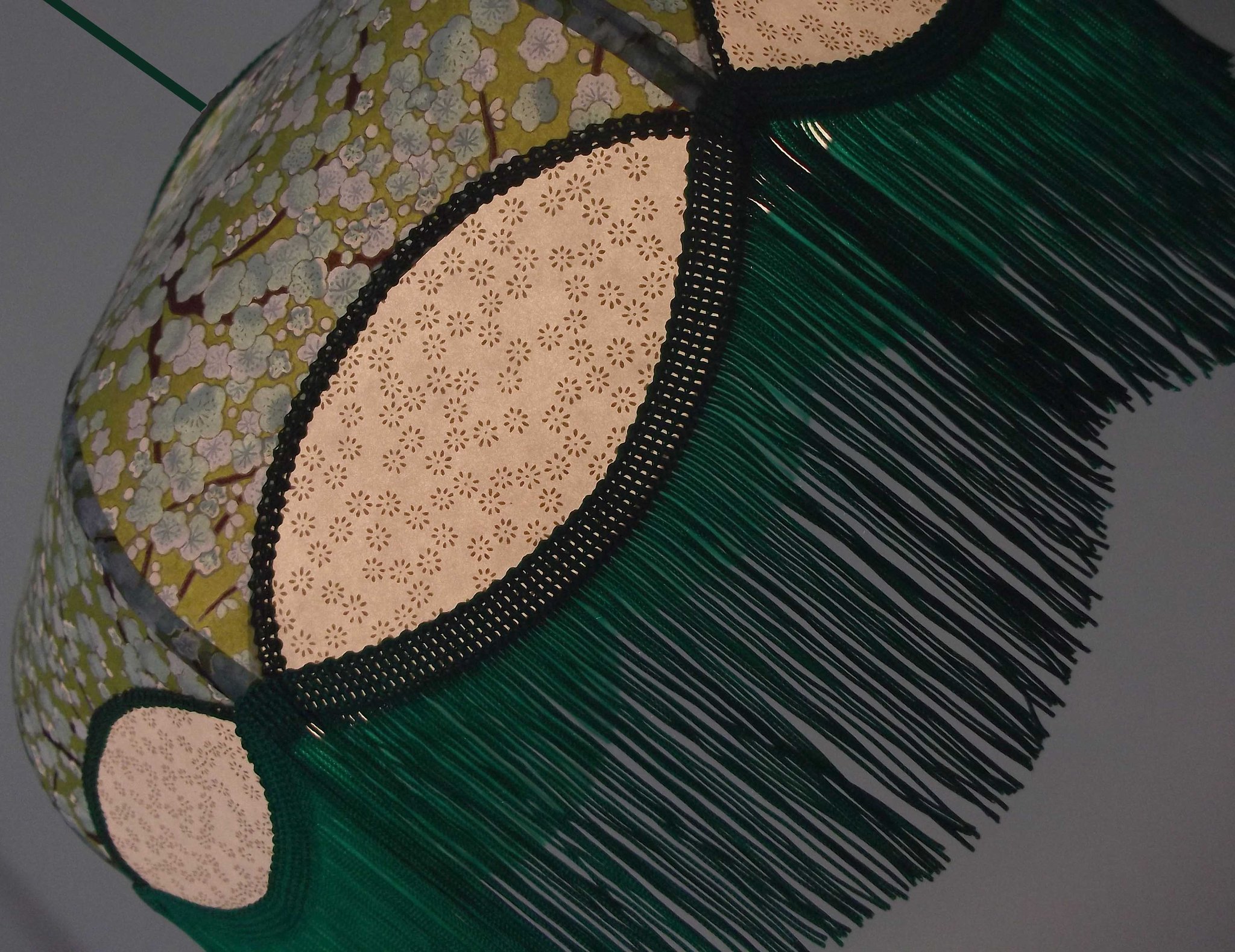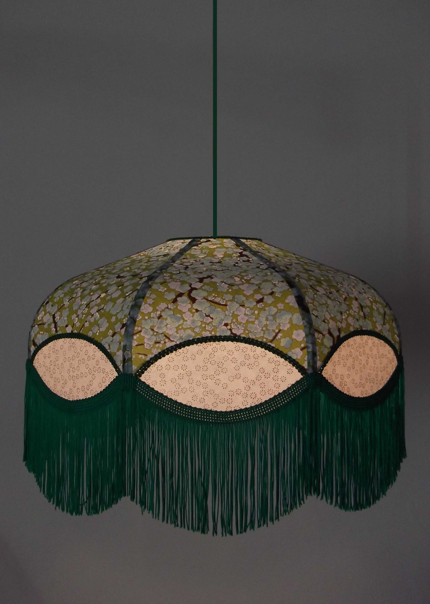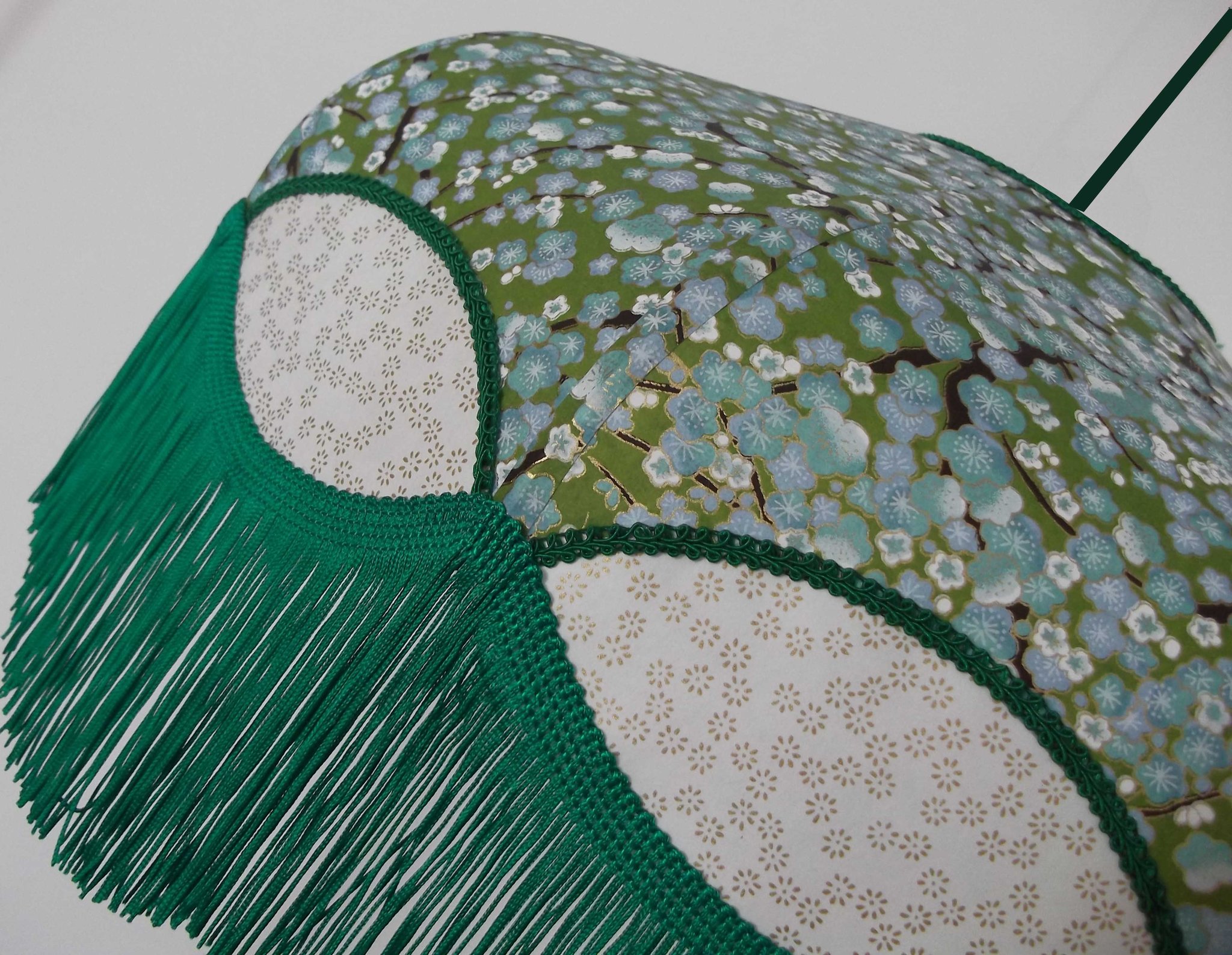 Suspension, 40 cm de diamètre. Papier japonais fleurs sur fond vert en haut et petites fleurs dorées sur fond écru en bas. Frange verte. Hauteur 16 cm + 10 cm de frange. Douille E27, 40 w max. Sur commande, envoi sous 15 jours.
