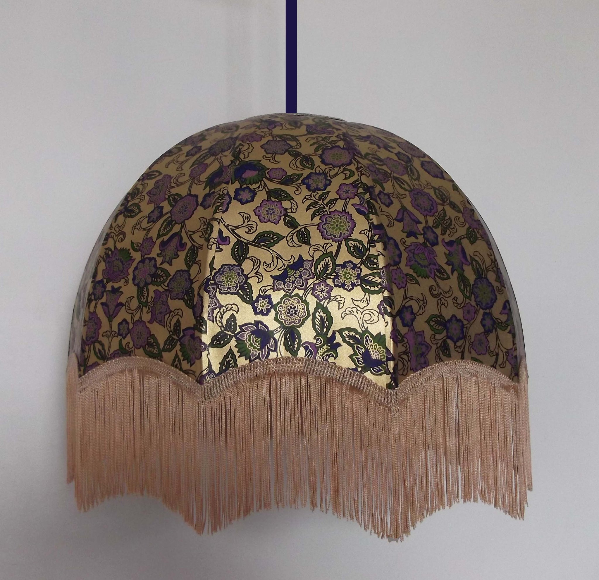 Forme dôme. Diamètre 40 cm, hauteur 23 cm + 10 cm de frange. Douille E27, 40 w max. Sur commande, délai 15