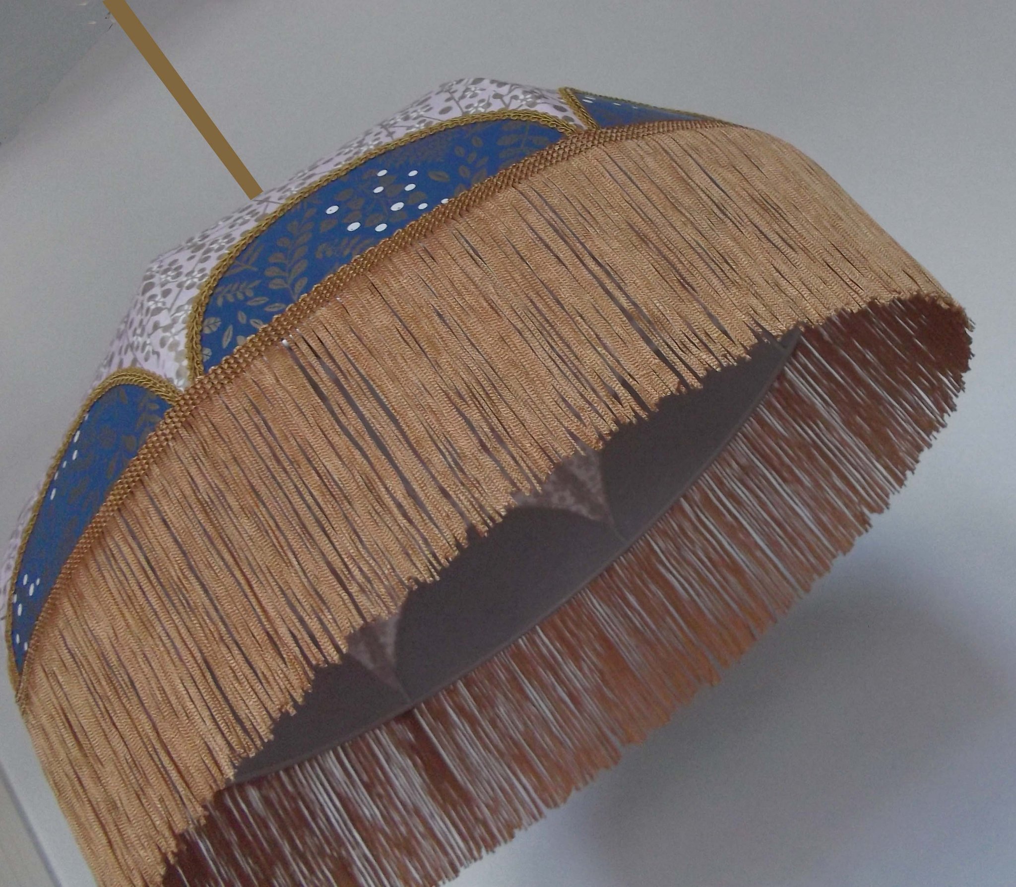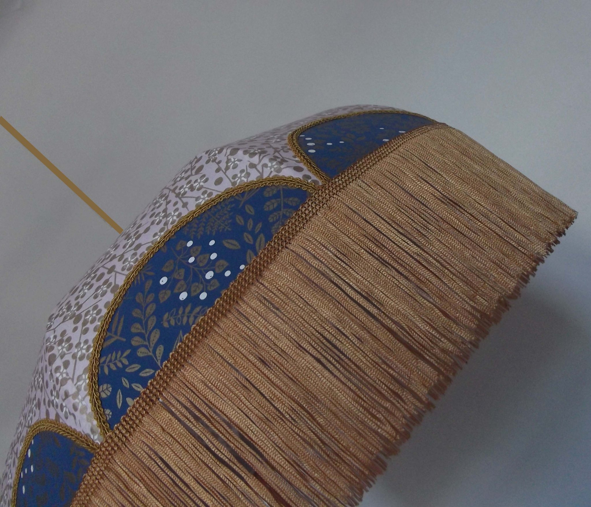 haut et fleurs dorées sur fond blanc en bas Frange doré. Hauteur 16 cm + 10 cm de frange. Douille E27, 40 w max. SUR COMMANDE, délai 15
