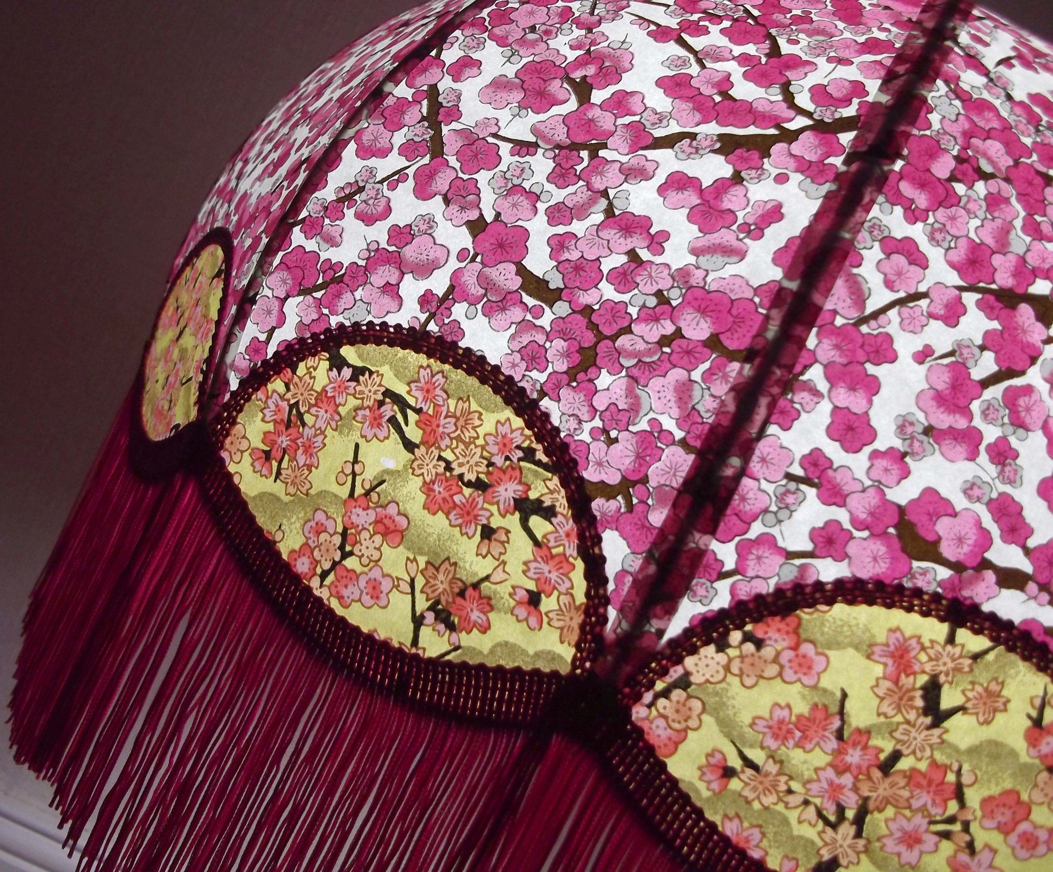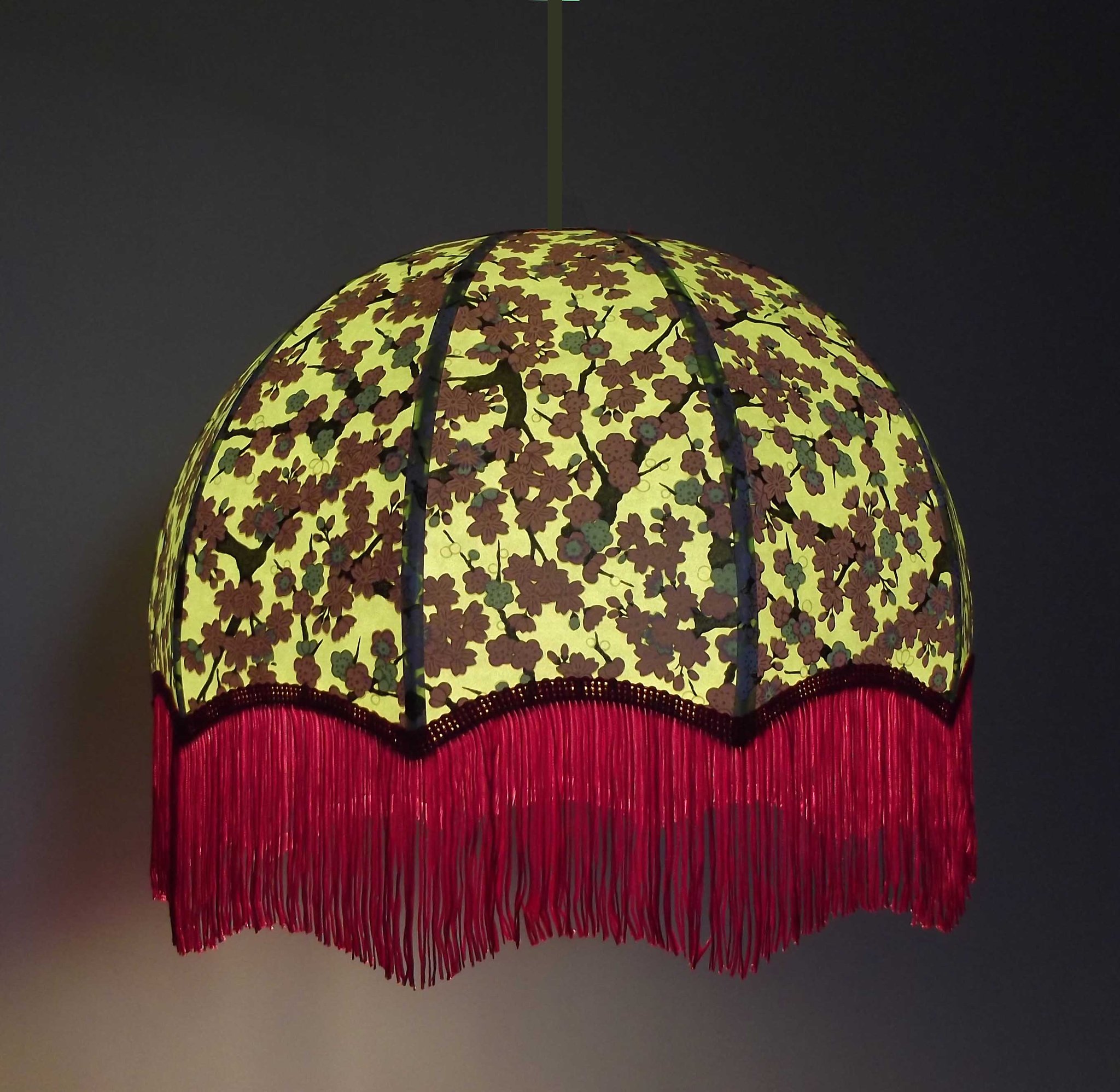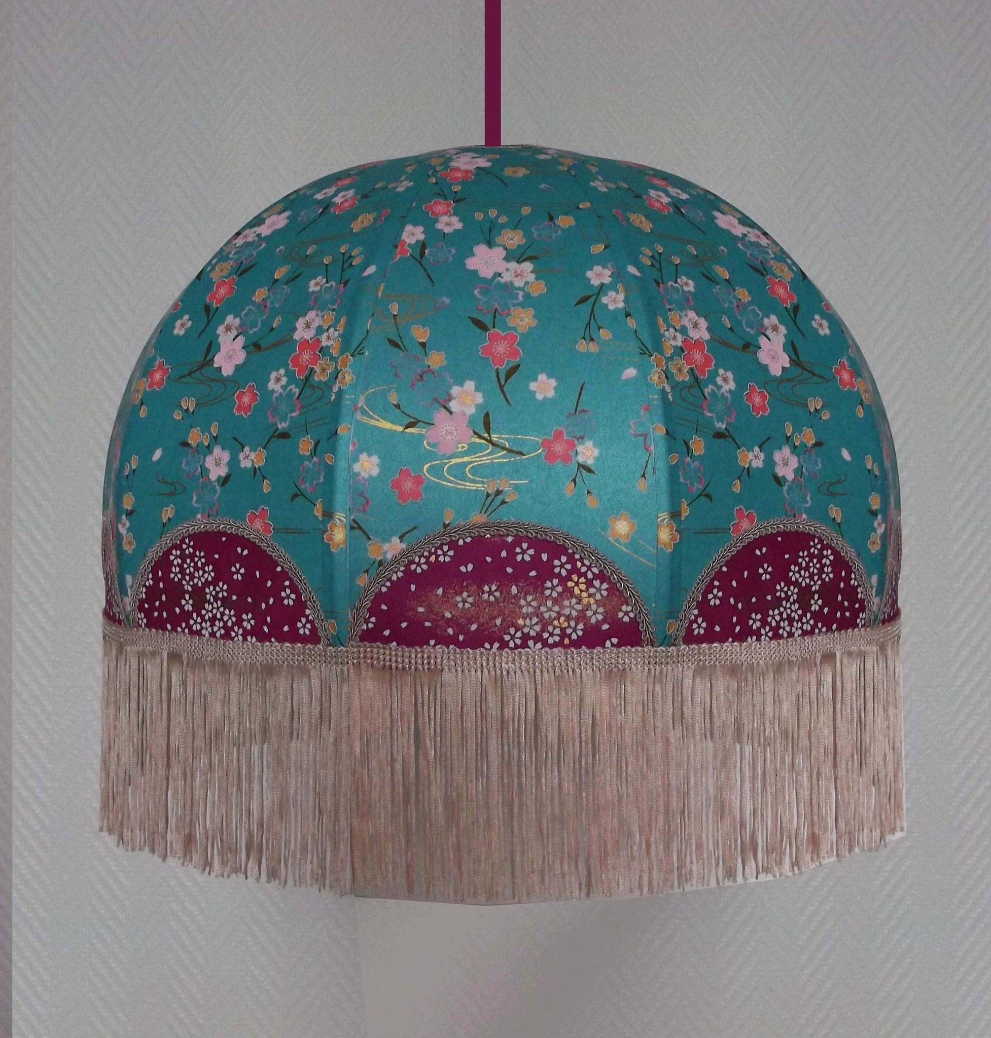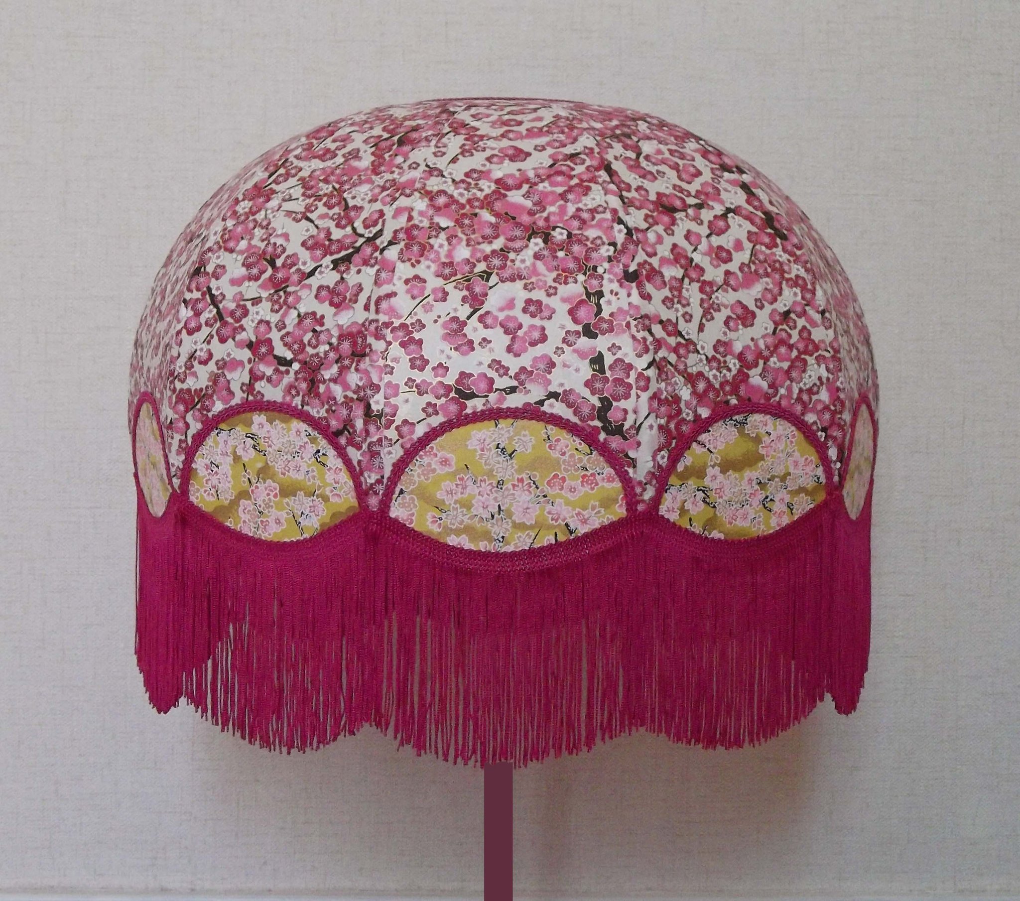 Abat-jour en papier japonais fleurs de cerisier couleur prune en haut et fleurs roses sur fond moutarde en bas. Forme dôme feston bas. Diamètre 40 cm, hauteur 23 cm + 10 cm de frange fuchsia. Douille E27, 40 w max.