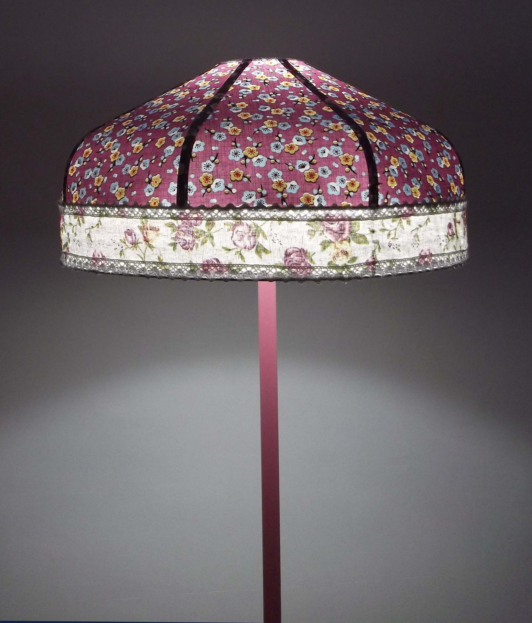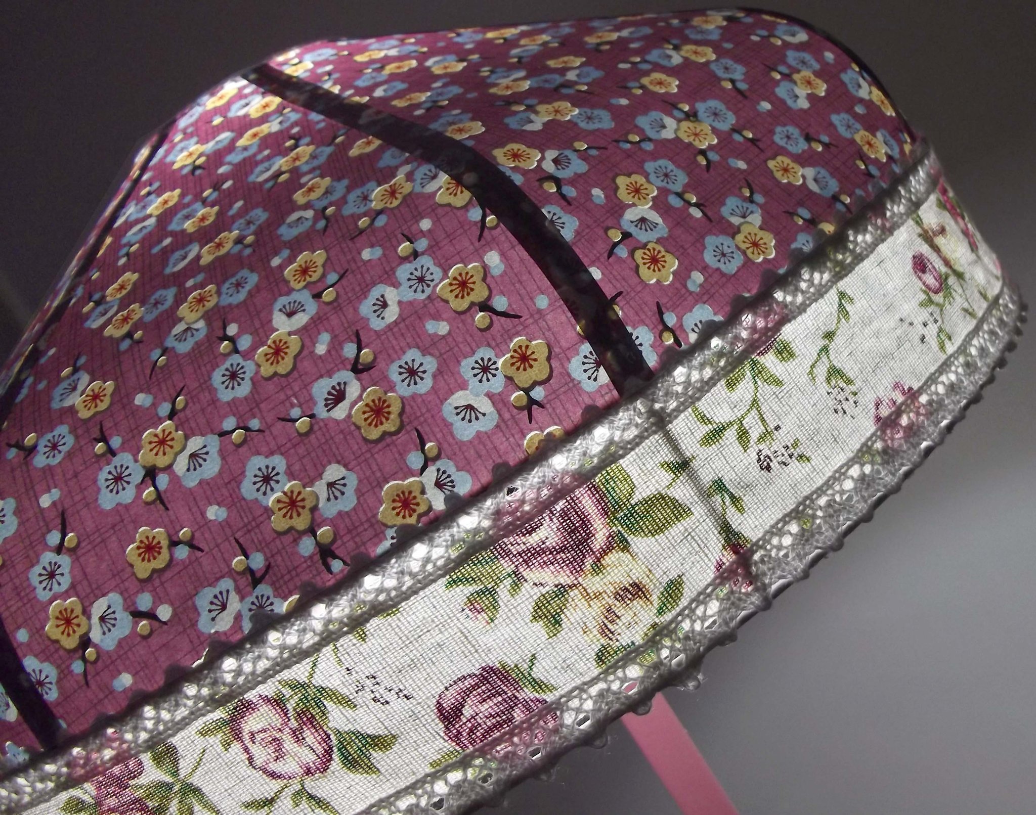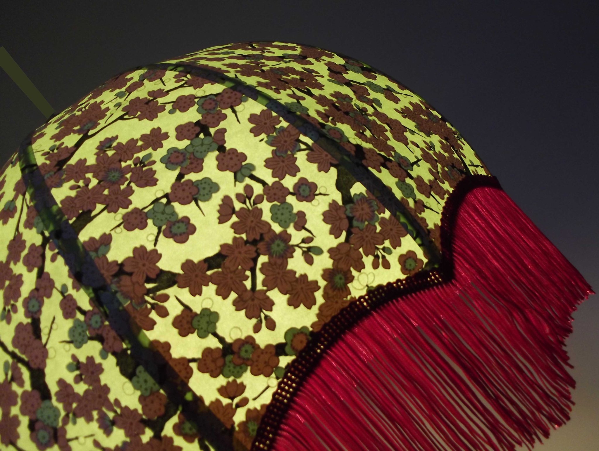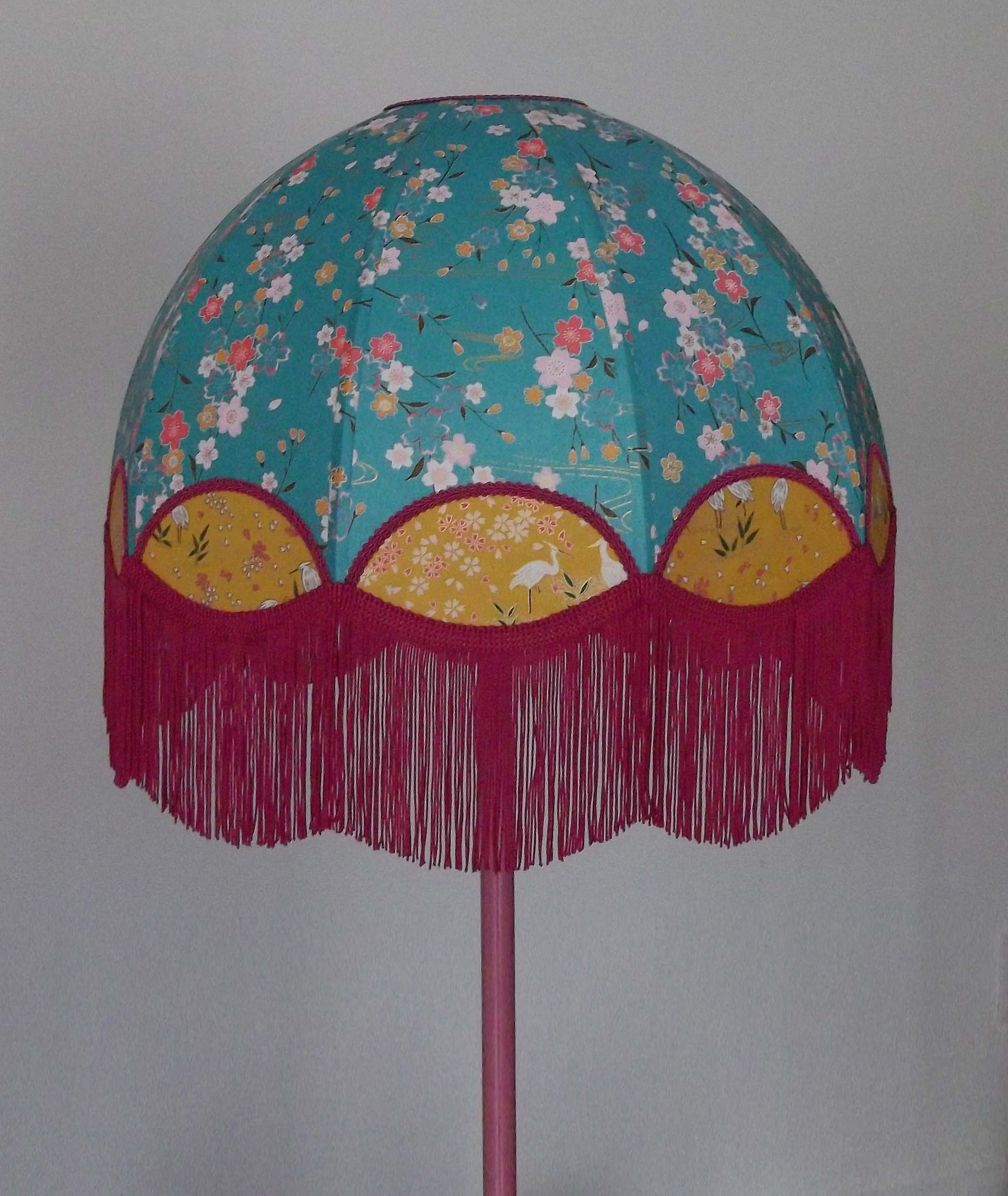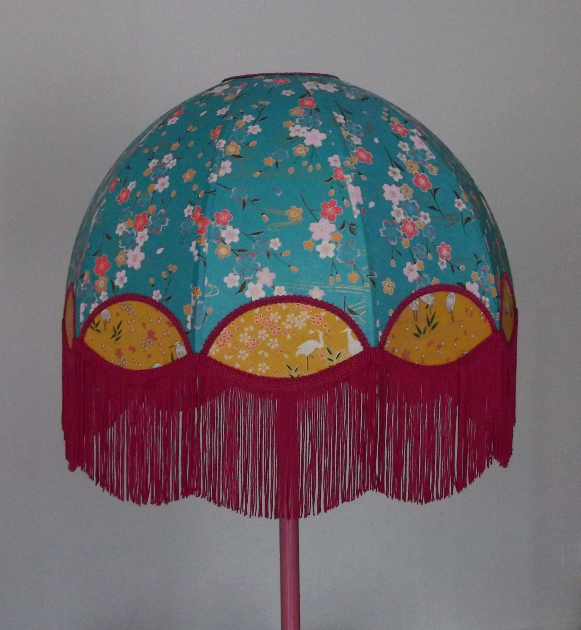 Abat-jour en papier japonais fleurs de cerisier couleur prune en haut et fleurs roses sur fond moutarde en bas. Forme dôme feston bas. Diamètre 40 cm, hauteur 23 cm + 10 cm de frange fuchsia. Douille E27, 40 w max.