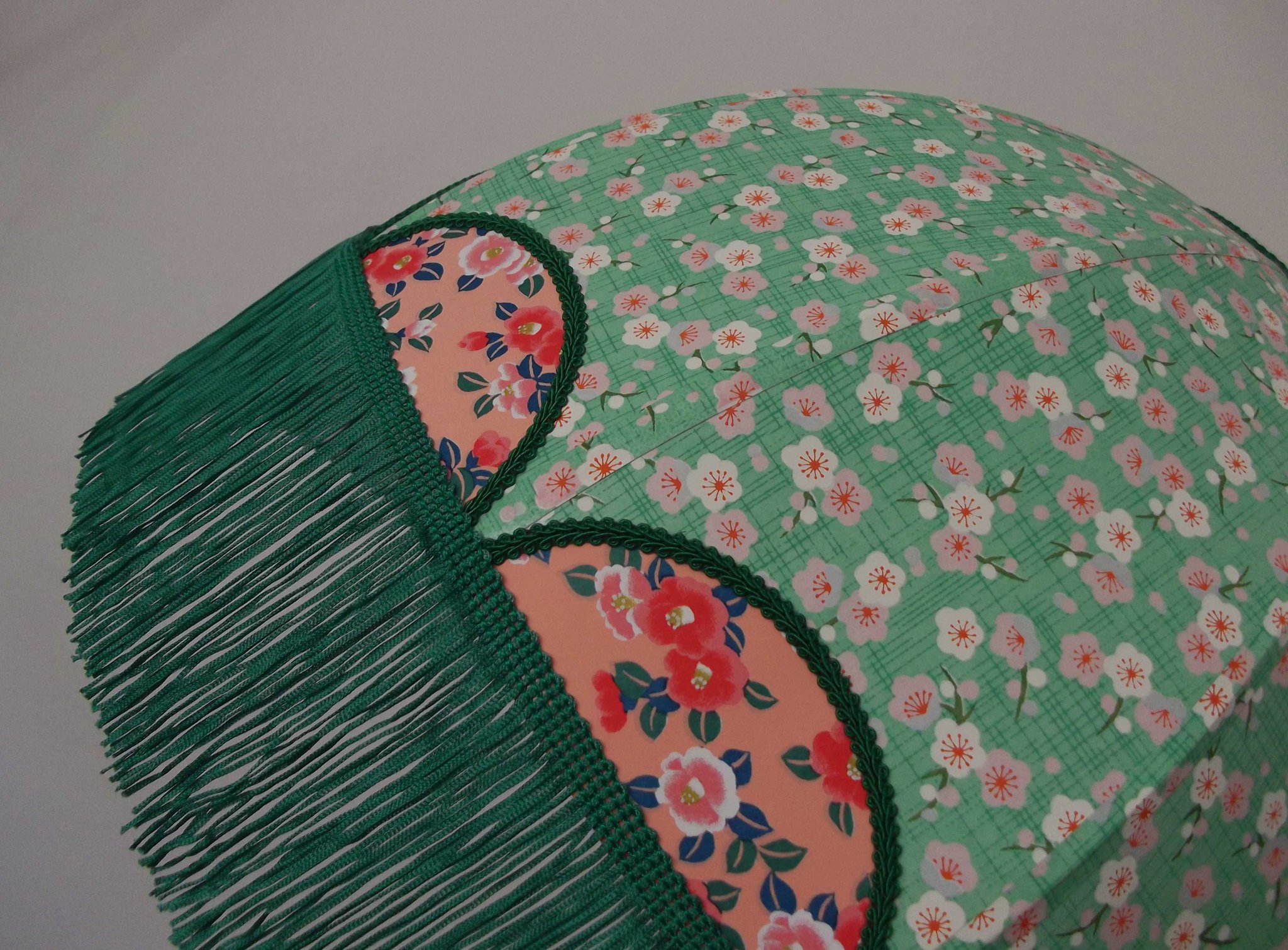 Suspension en papier japonais fleurs sur fond vert en haut et sur fond saumon en bas. Frange verte. Diamètre 40
