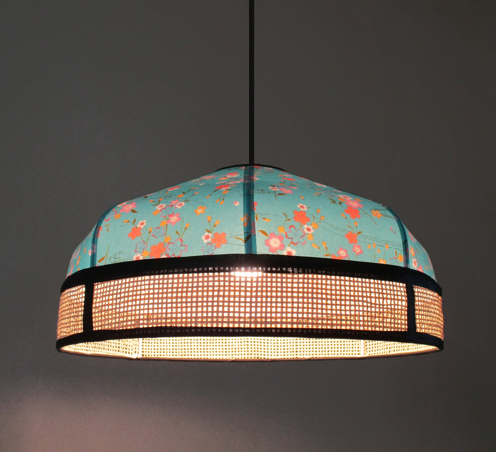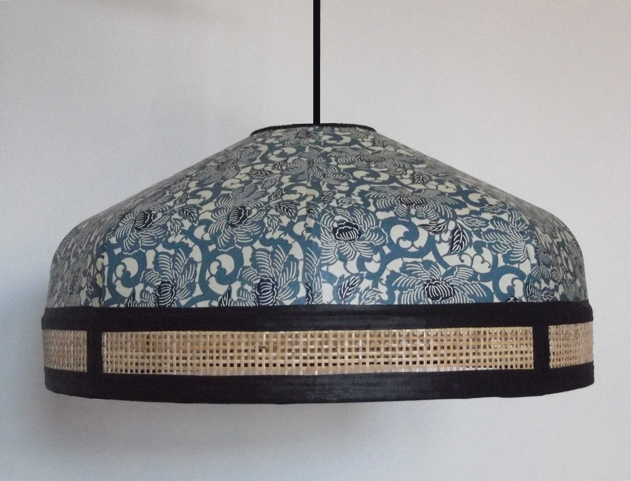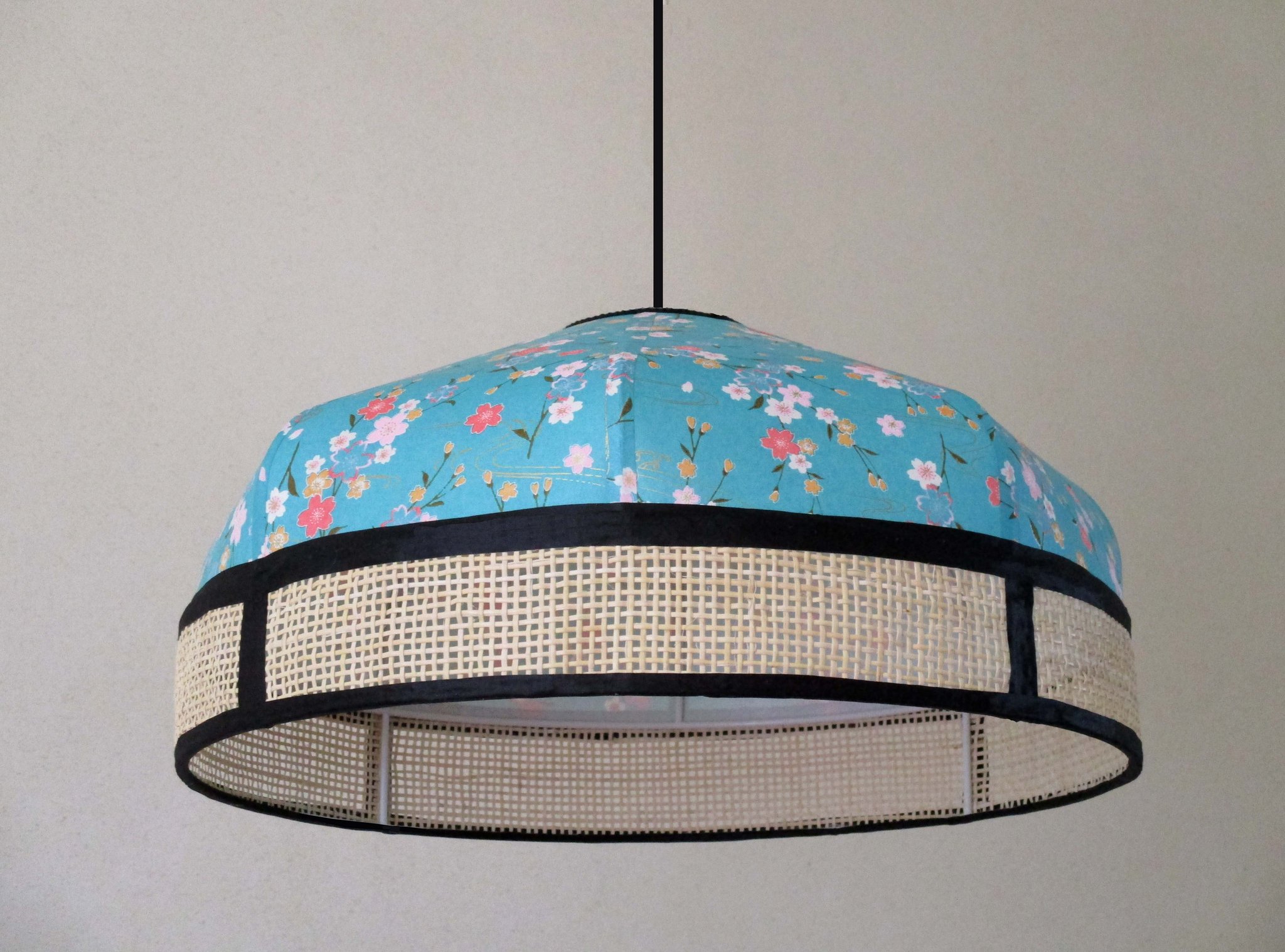 Suspension en papier japonais turquoise à fleurs et cannage naturel.