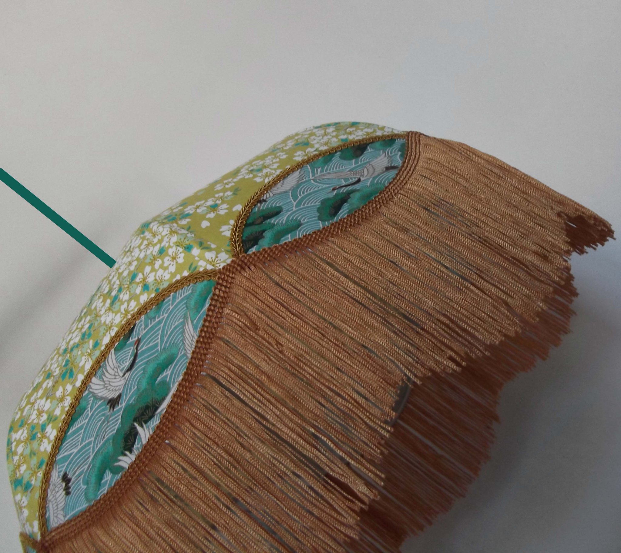 Papier japonais"grues" sur fond moutarde en haut et fleurs sur fond turquoise en bas. Frange doré.