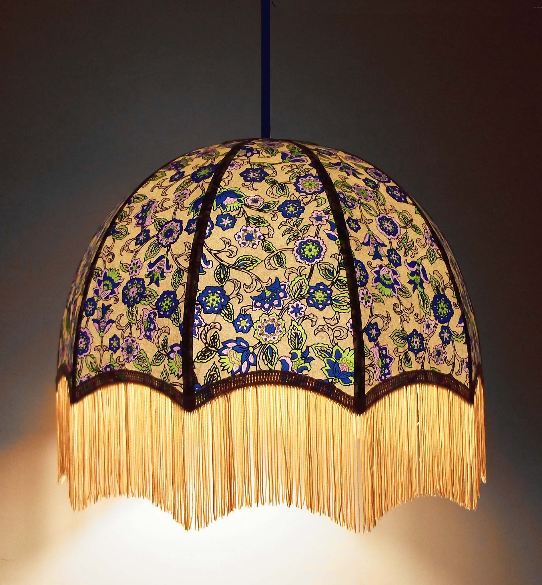 Suspension en papier japonais fleurs sur fond turquoise en haut et fleurs sur fond violet en bas. Frange beige. Forme dôme. Diamètre 40 cm, hauteur 23 cm + 10 cm de frange. Douille E27, 40 w max. Sur commande, envoi sous 15 jours.