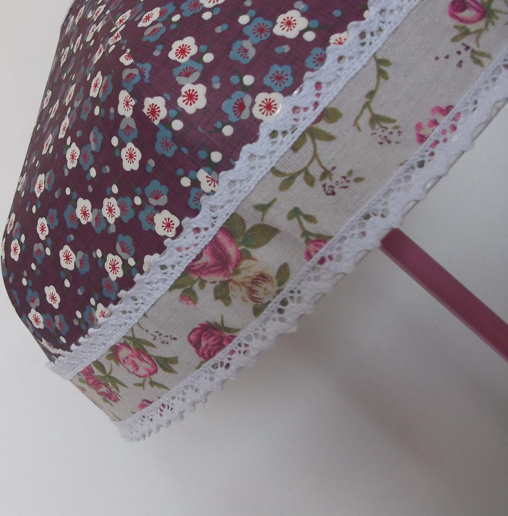 Abat-jour en papier japonais à fleurs de prunier sur fond violet et toile de jute à fleurs.