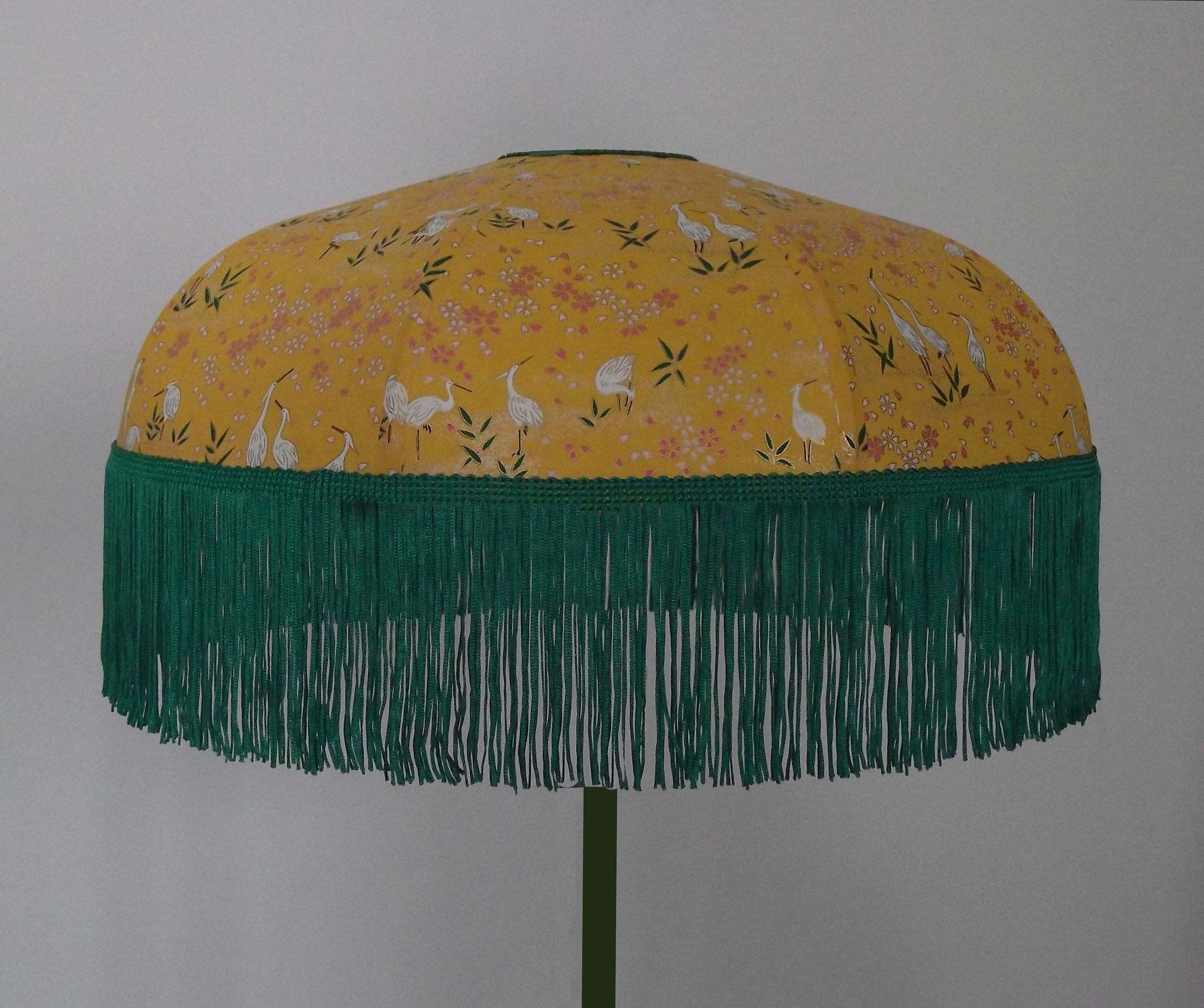 Abat-jour 40 cm de diamètre. Papier japonais hérons sur fond moutarde. Frange verte. Hauteur 12,5 cm + 10 cm de frange. Douille E27, 40 w max.