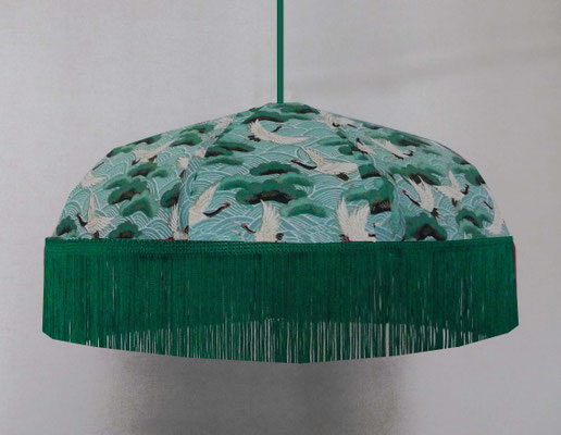 Suspension forme dôme, papier japonais "grues" sur fond vert et frange verte. Diamètre 60 cm.
