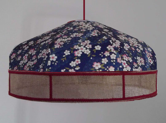 Suspension en papier japonais fleurs sur fond violet foncé et bandeau en toile de jute naturel. Galon rouge. 40 cm de diamètre.