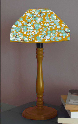 Lampe de chevet, pied bois moutarde et a.j papier japonais fleurs turquoises sur fond moutarde.